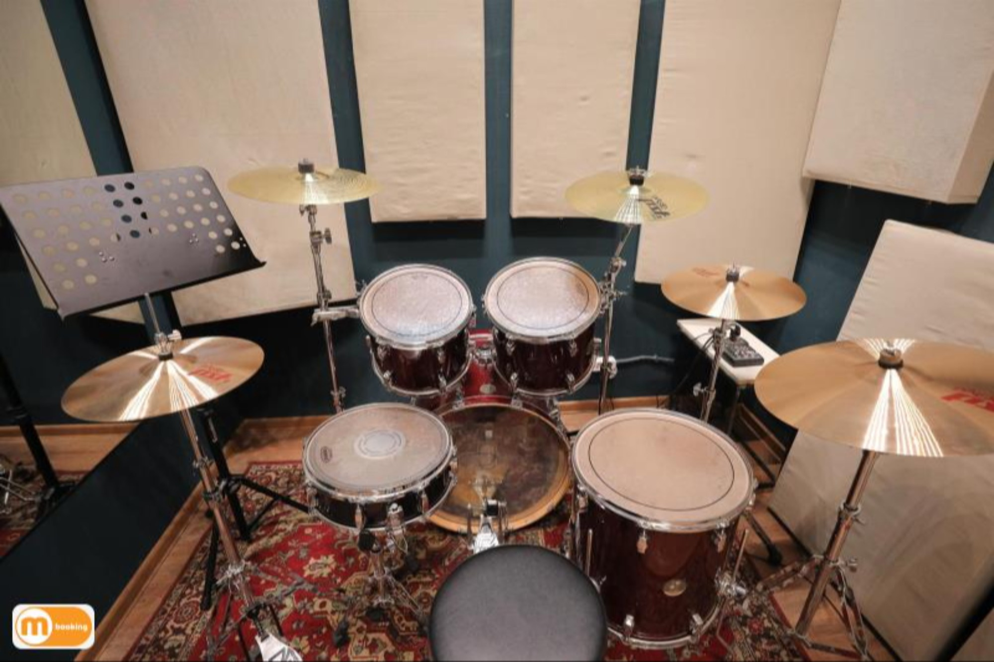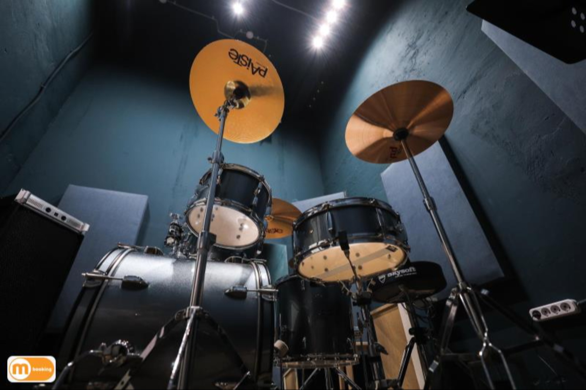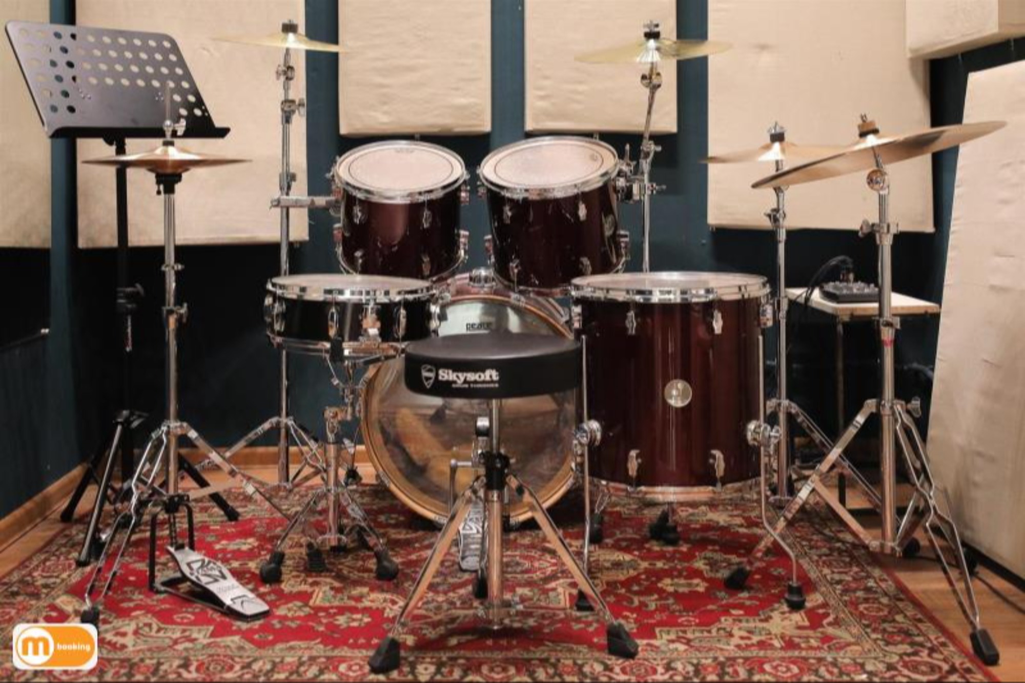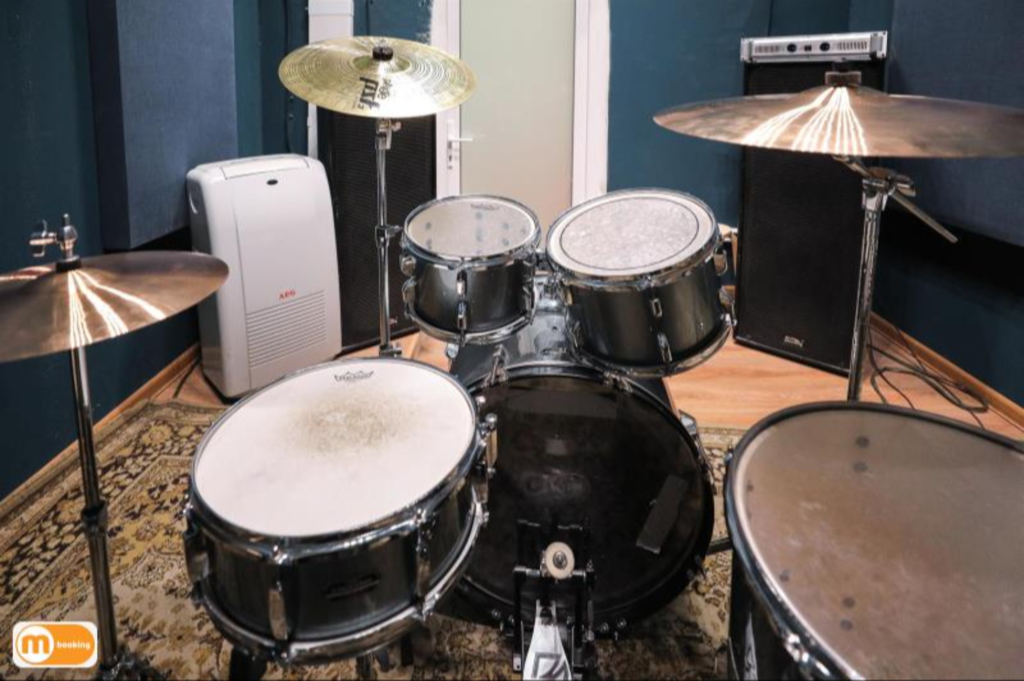 О площадке - Барабанная установка Tama Stagestar - 4 стойки под тарелки, стойка под малый, стойка hi-hat - Линия: Soundking (1кВт) + микшерный пульт Behringer - Большое зеркало - Кондиционер Оборудование Пюпитр