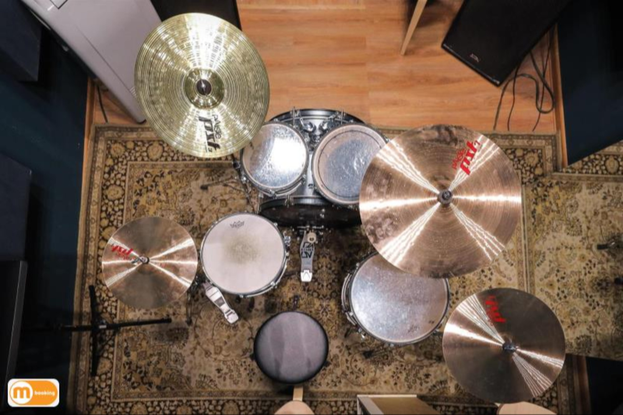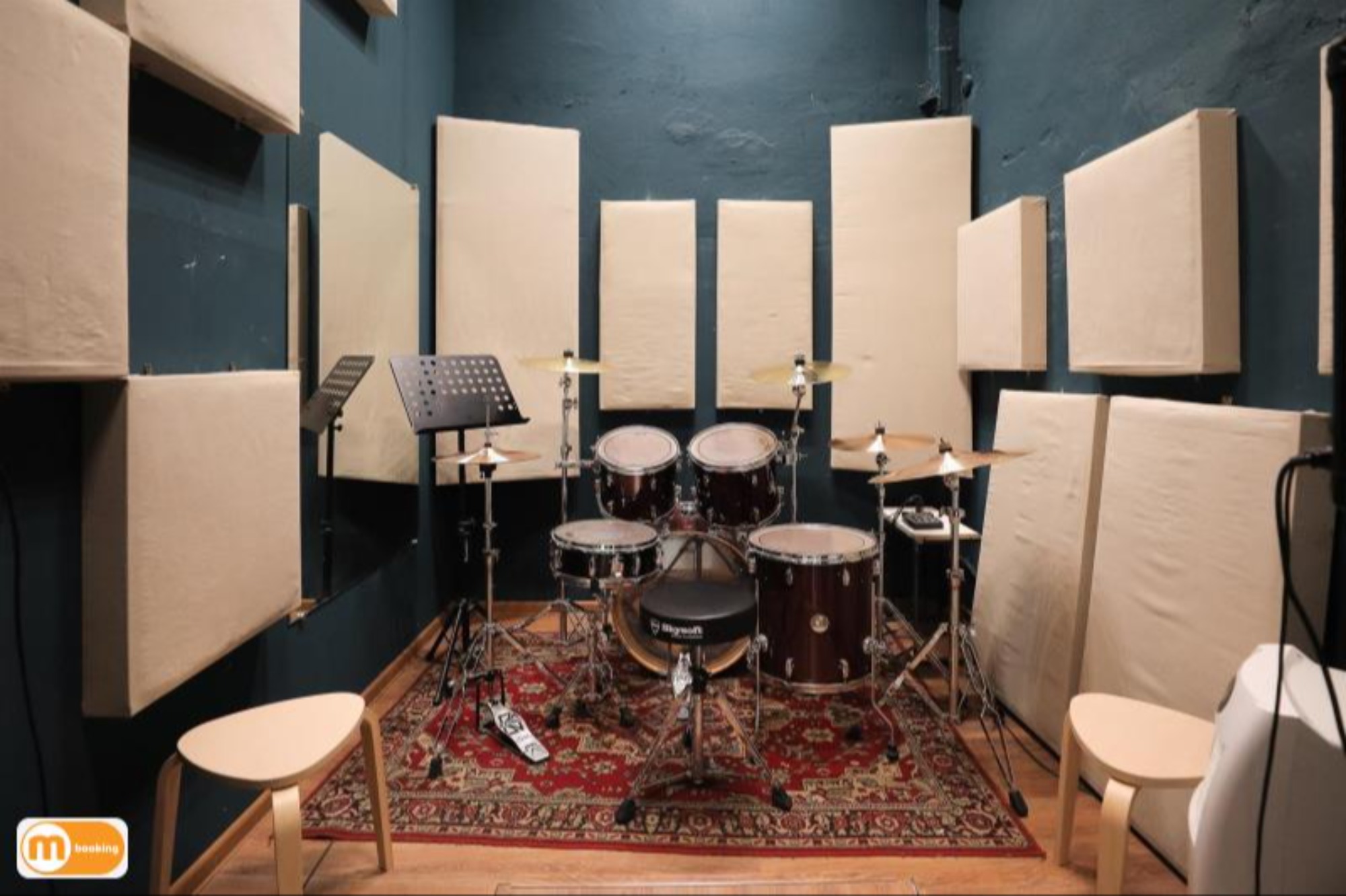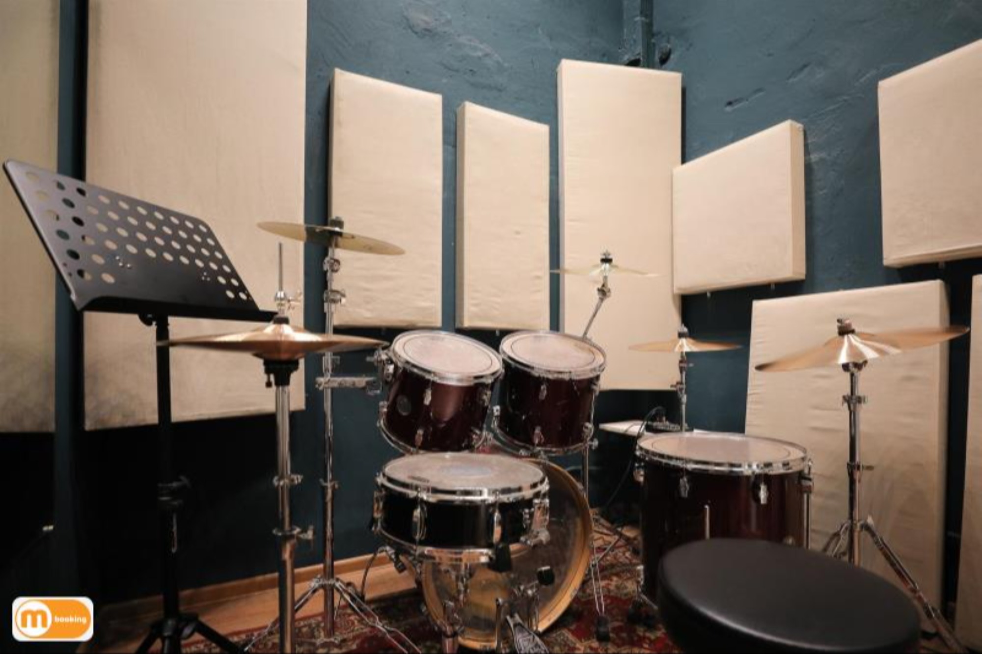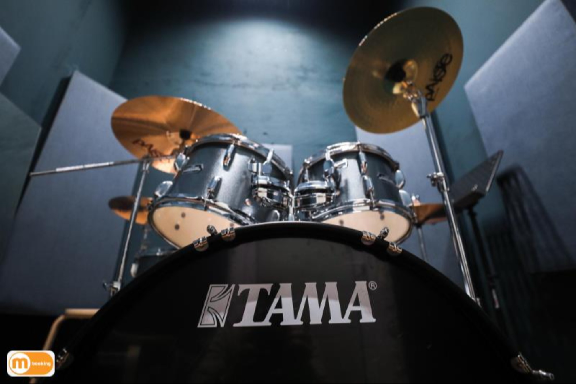 О площадке - Барабанная установка Tama Stagestar - 4 стойки под тарелки, стойка под малый, стойка hi-hat - Линия: Soundking (1кВт) + микшерный пульт Behringer - Большое зеркало - Кондиционер Оборудование Пюпитр
