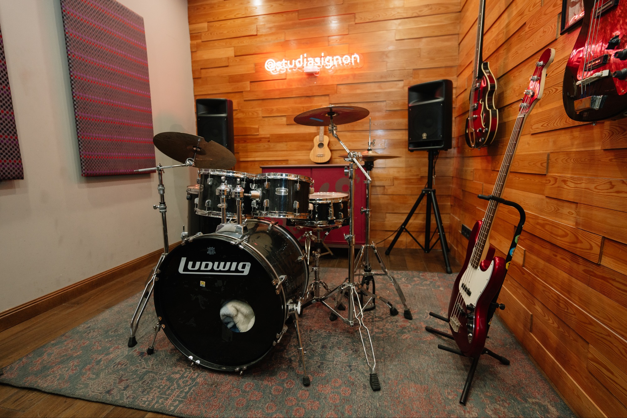 О площадке Класс для индивидуальных занятий игре на барабанах и гитаре. Класс оборудован всех необходимым: - Барабаны Ludwig, тарелки - Акустическая гитара - Бас-гитара - Электро-гитара - 2 Колонки Yamaha - Пюпитр - Bluetooth адаптер - Кондиционер Так же на территории можно получить очень вкусный кофе и великолепный сервис. Если класс бронируют больше 2 человек, цена может быть изменена Оборудование Пюпитр Тарелки,малый,педаль включены в стоимость Микшерный пульт с Bluetooth