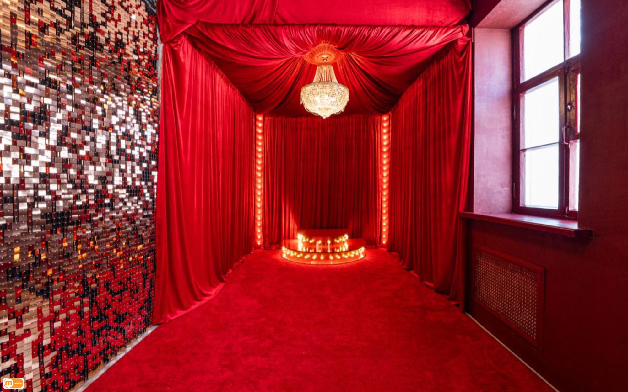 Красное бархатное пространство, с подиумом и роскошной люстрой, идеально для творческих проектов. 18m2. Фон из золотых пайеток, красный гримерный стол, дополнительный реквизит: -Красные кинокресла; -Мишень; -Покерный и блэкджек столы, рулетка; -Бокал; -Пилон; -Одежда и мелкий реквизит.