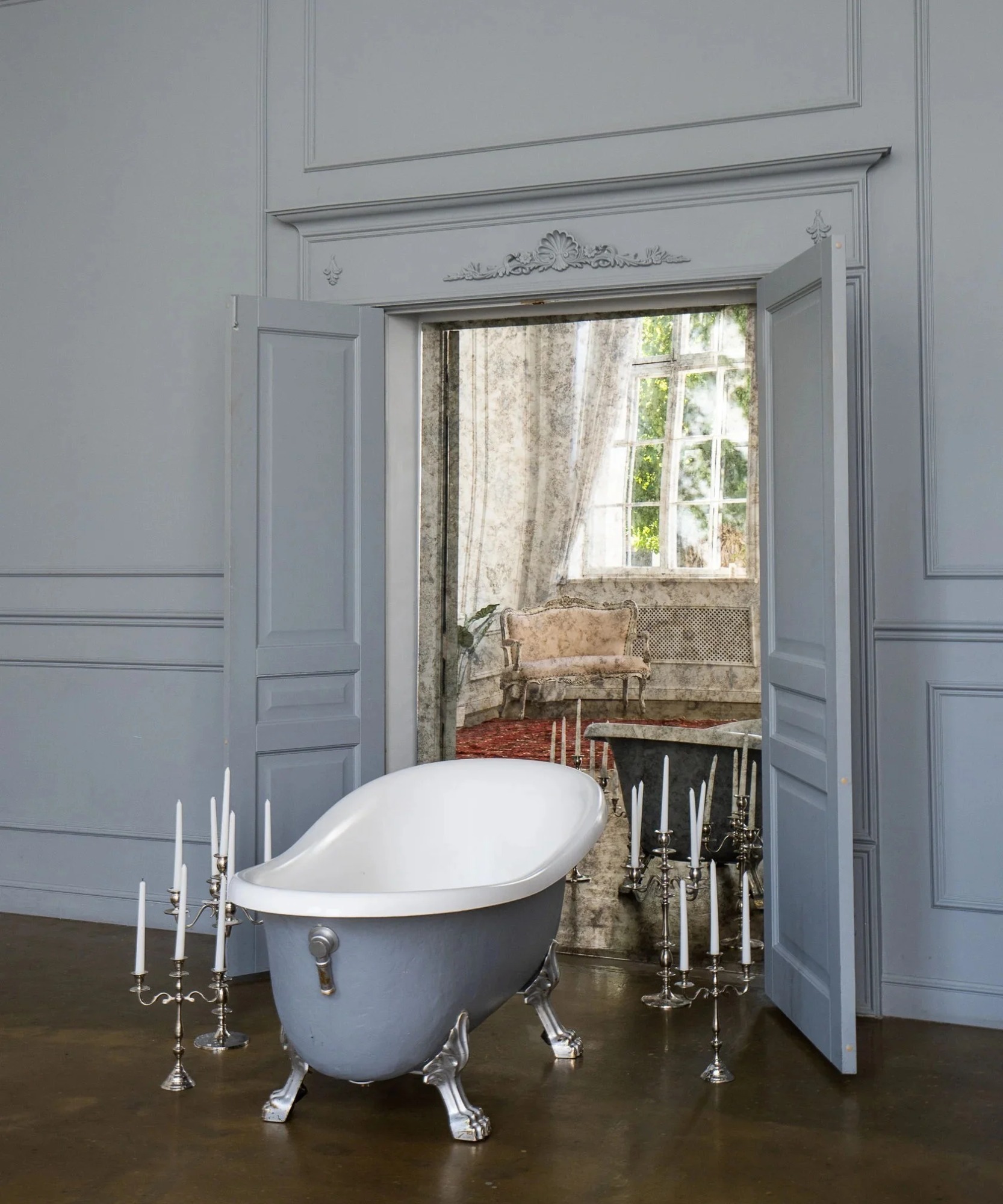 2. Нежный будуар с наполняемой ванной на ножках и кроватью. Возможность установить источники света за окно и сымитировать солнечный свет;