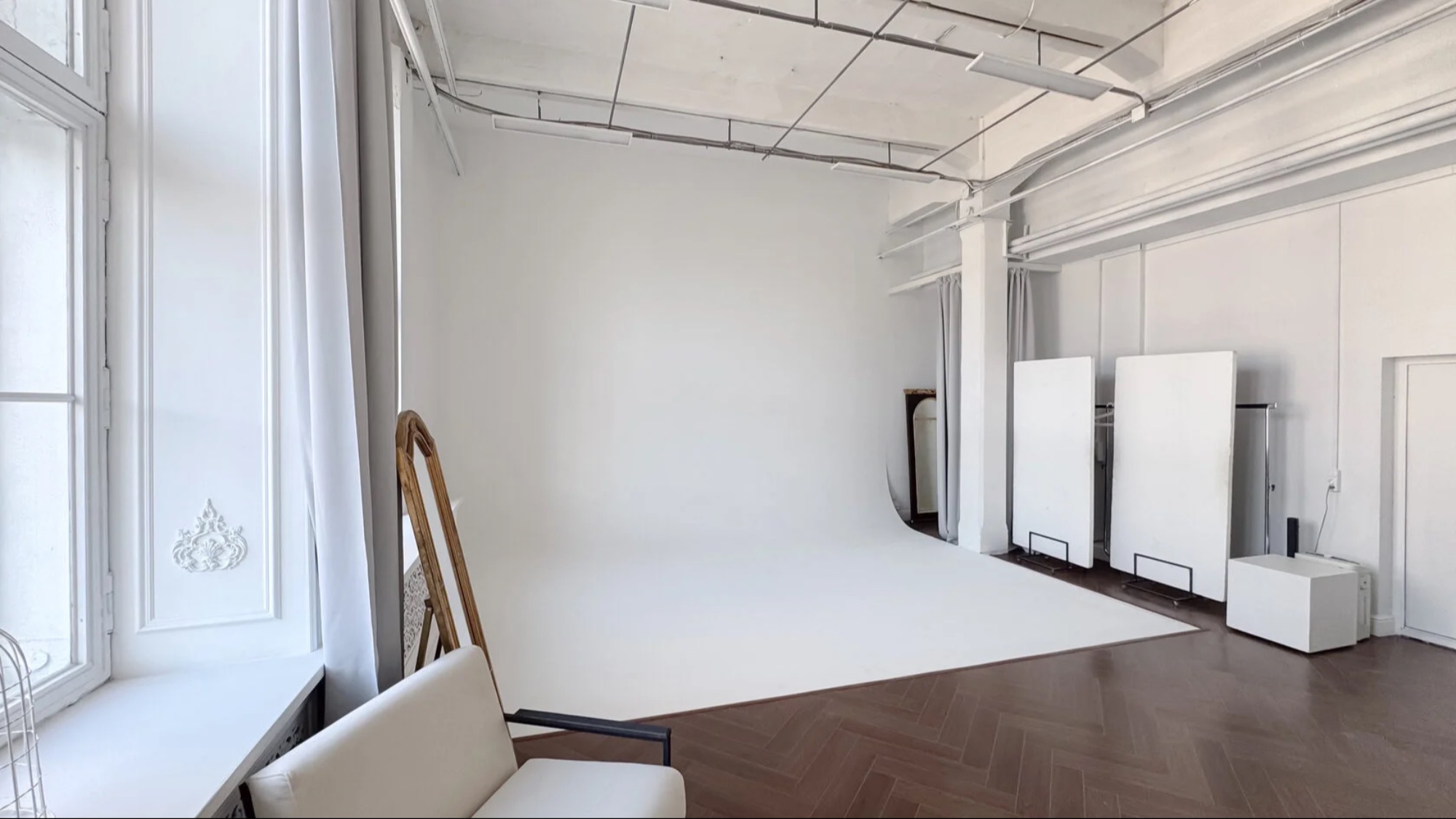 1. Чёрная циклорама 4х5 метра. На потолке находятся 6 кронштейнов для установки световых приборов. Высота потолка 3,2 метра. 8 окон, солнечная сторона. Блэкаут, возможность сделать полностью чёрную комнату;