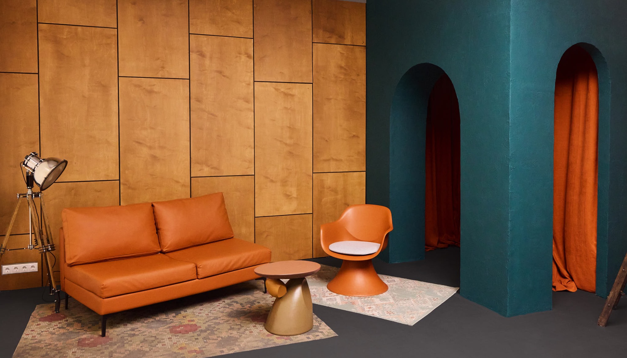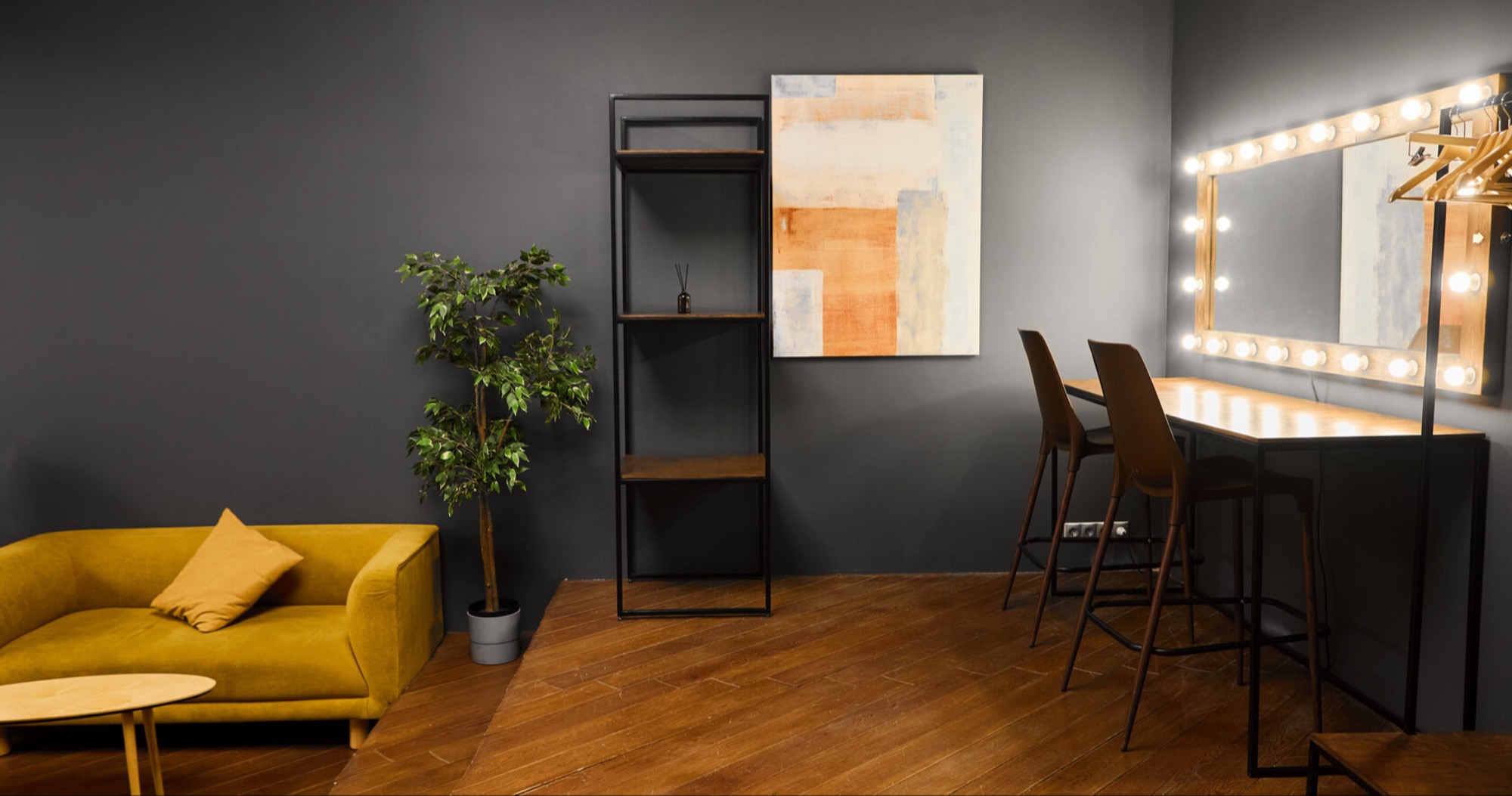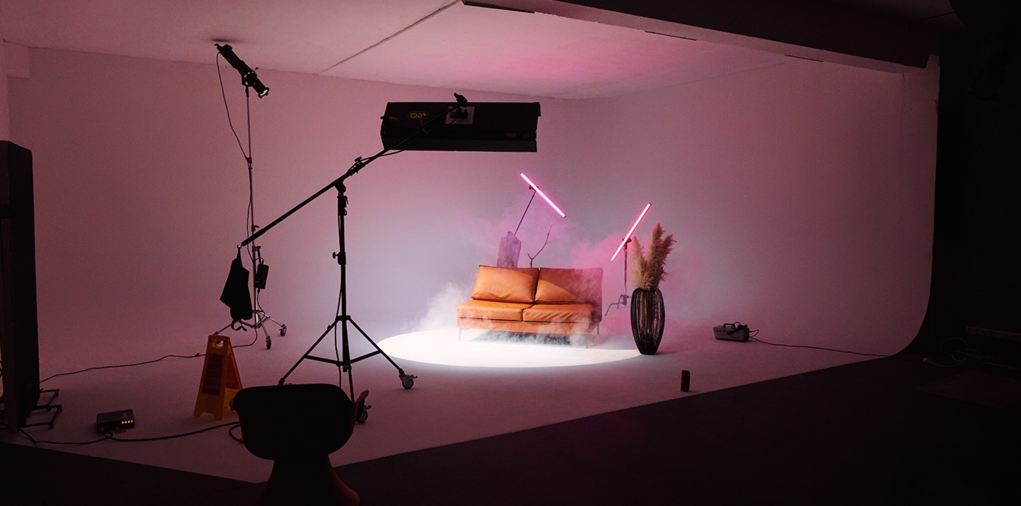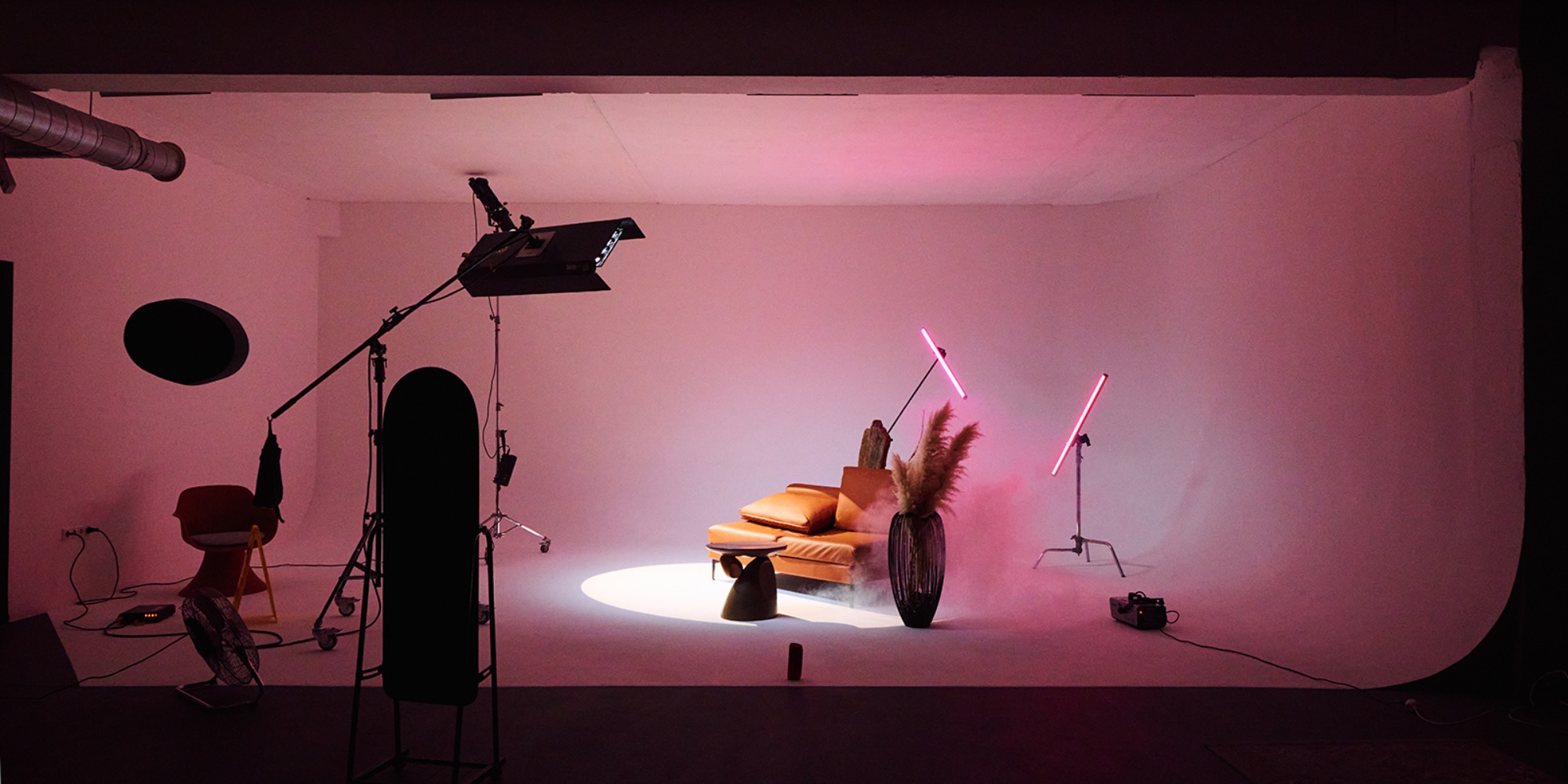 О площадке Зал с угловой циклорамой 8,5 x 6 м включает в себя отдельную гримерку 30 м², стильную лофт-декорацию, штатив-колонну Foba, стильные кресла и торшеры. Интерьер и освещение могут отличаться от фото.