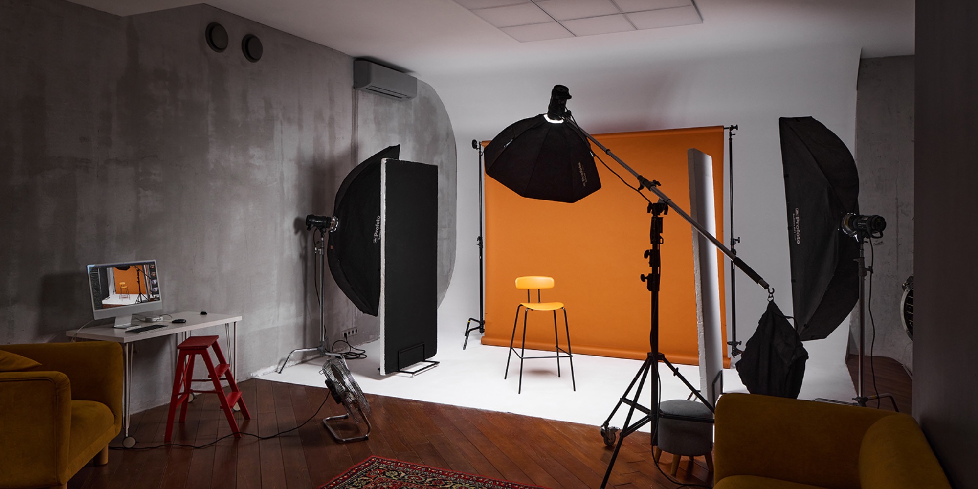Базовое оснащение - 3 моноблока ProFoto D1 500 Air. Возможна установка 1 бумажного фона без раскатки бесплатно. Видеосвет, прочее дополнительное оборудование и услуги бронируются заранее по телефону.