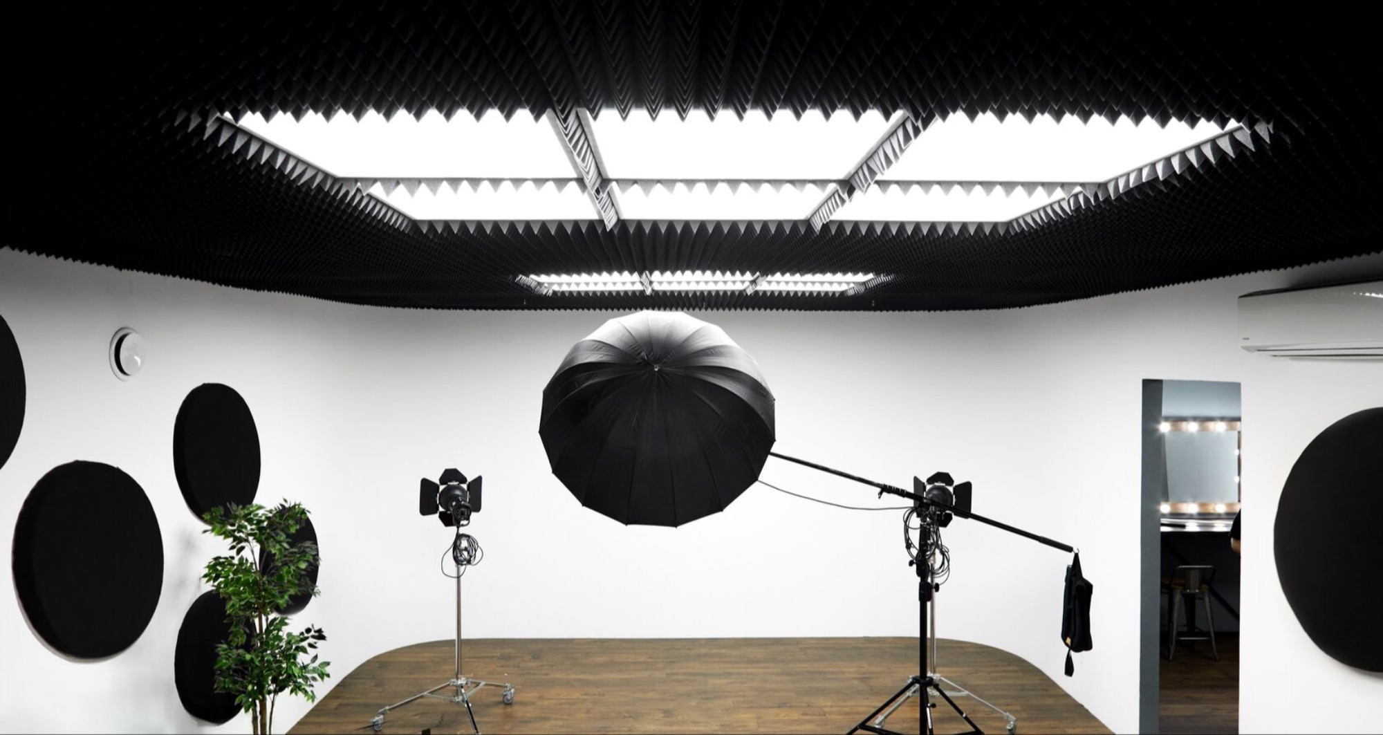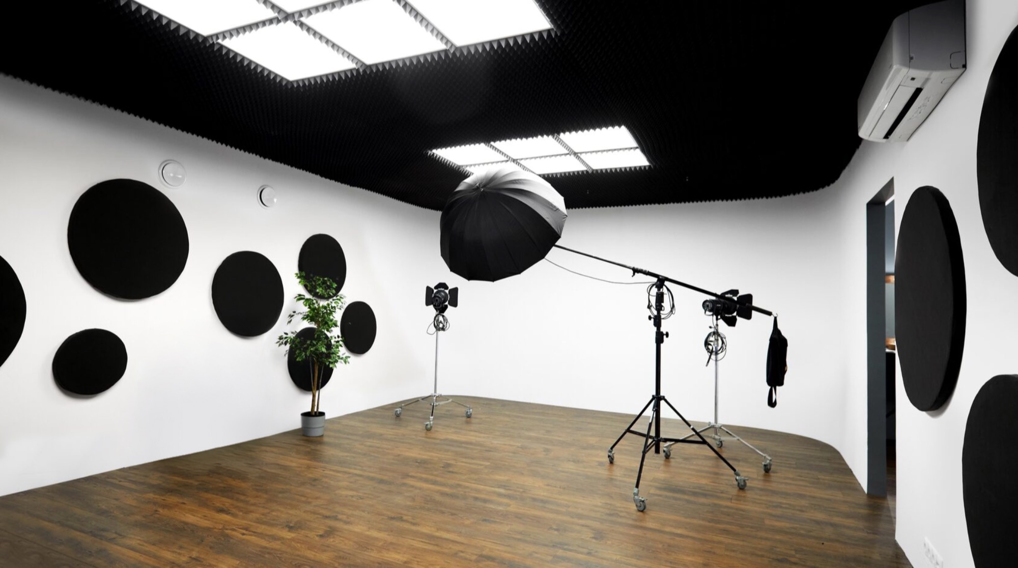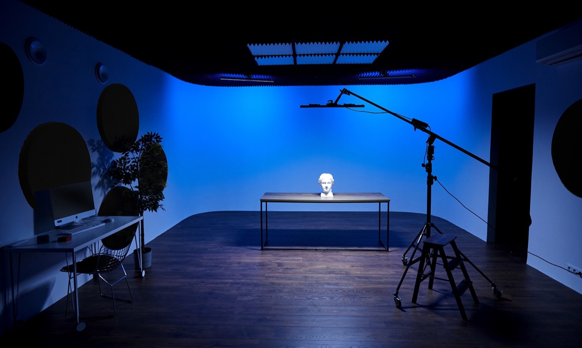 О площадке Новый зал с хромакейной стеной синего цвета, большой белой стеной без углов и настенными звукопоглощающими панелями. Интерьер и освещение могут отличаться от фото.
