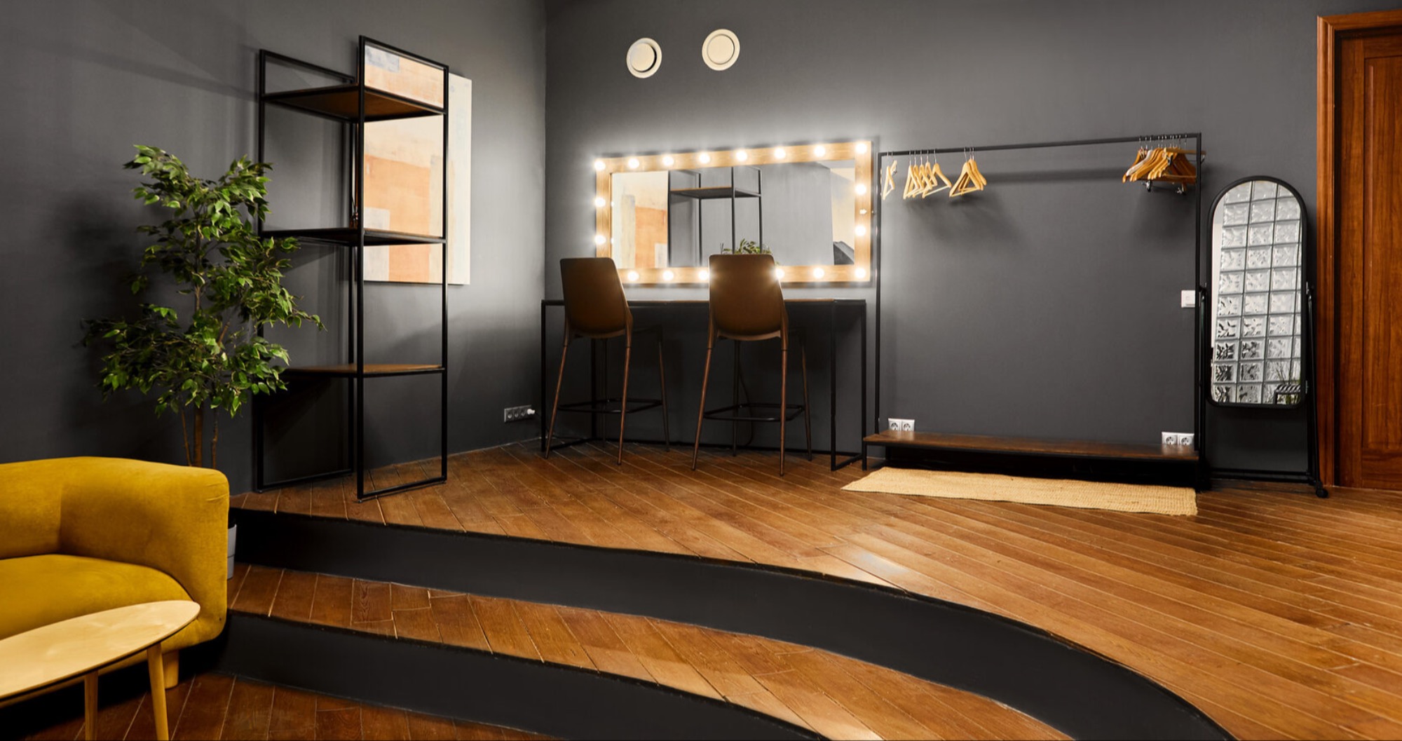 О площадке Эффектный съёмочный зал с фактурными стенами, деревянным полом, стильной мебелью, гримерным местом и циклорамой размером 4.2 х 5 м ( c подогревом). Интерьер и освещение могут отличаться от фото. Подключение по шнуру к интернету со скоростью до 800 Мбит/сек.