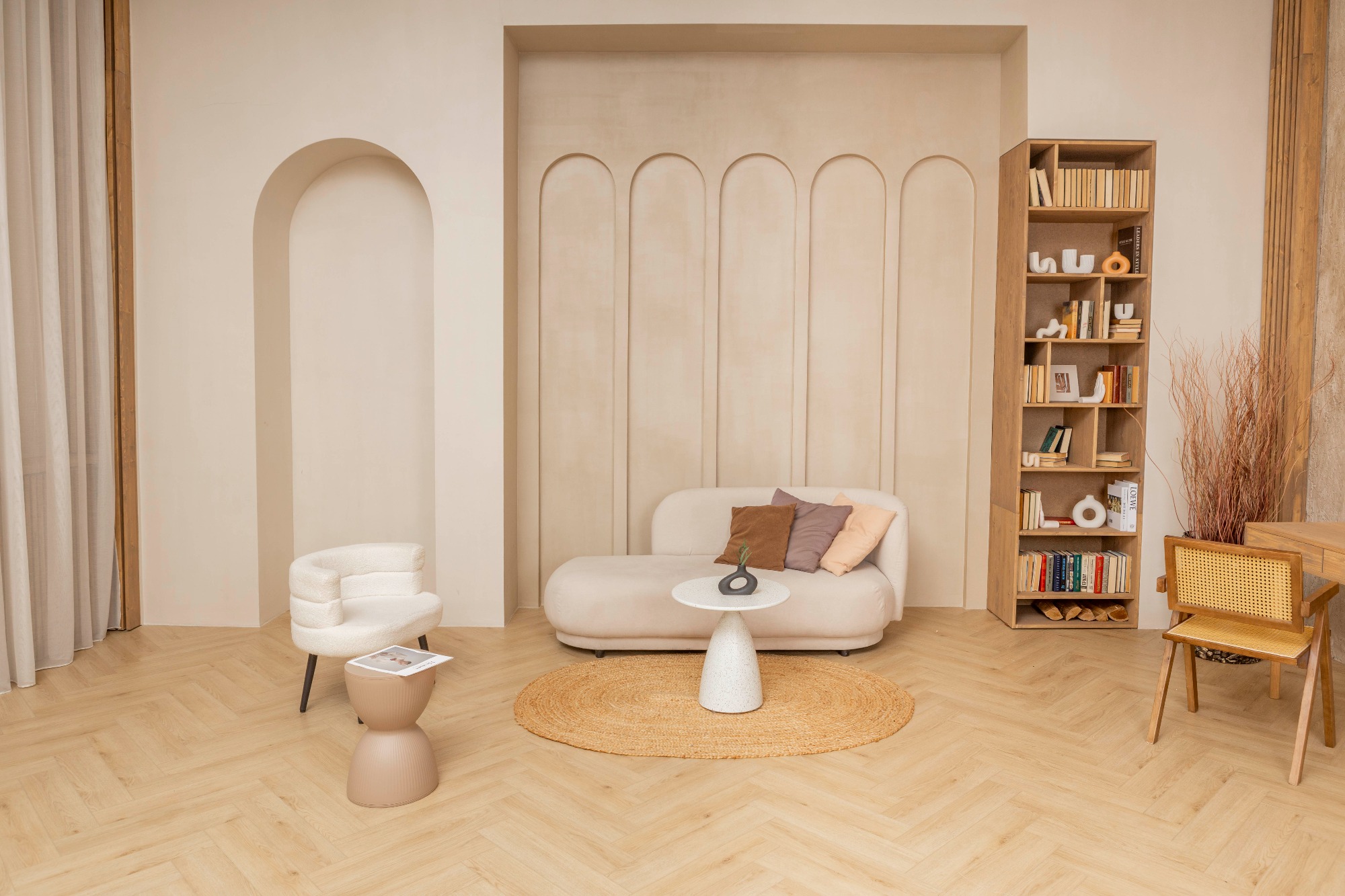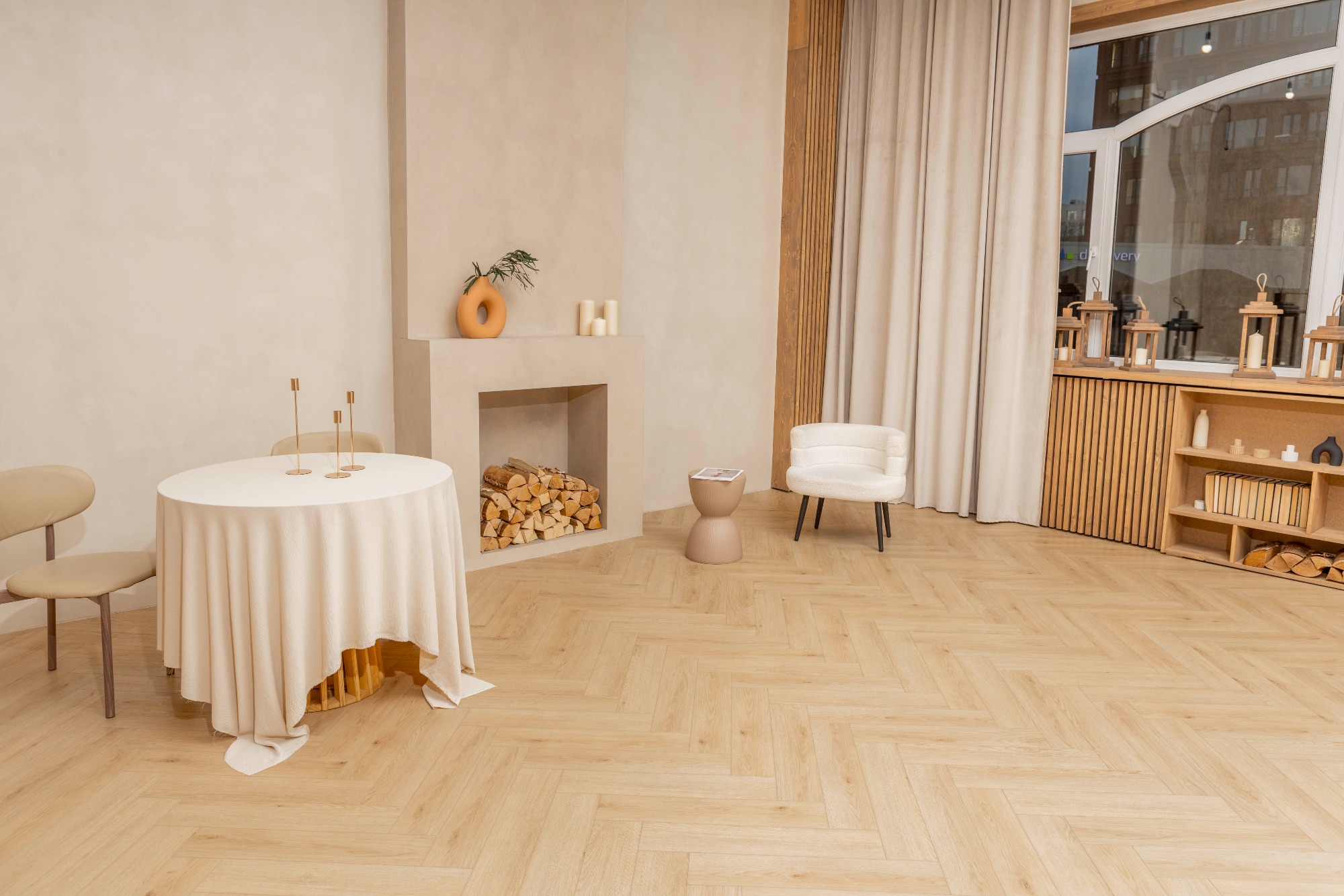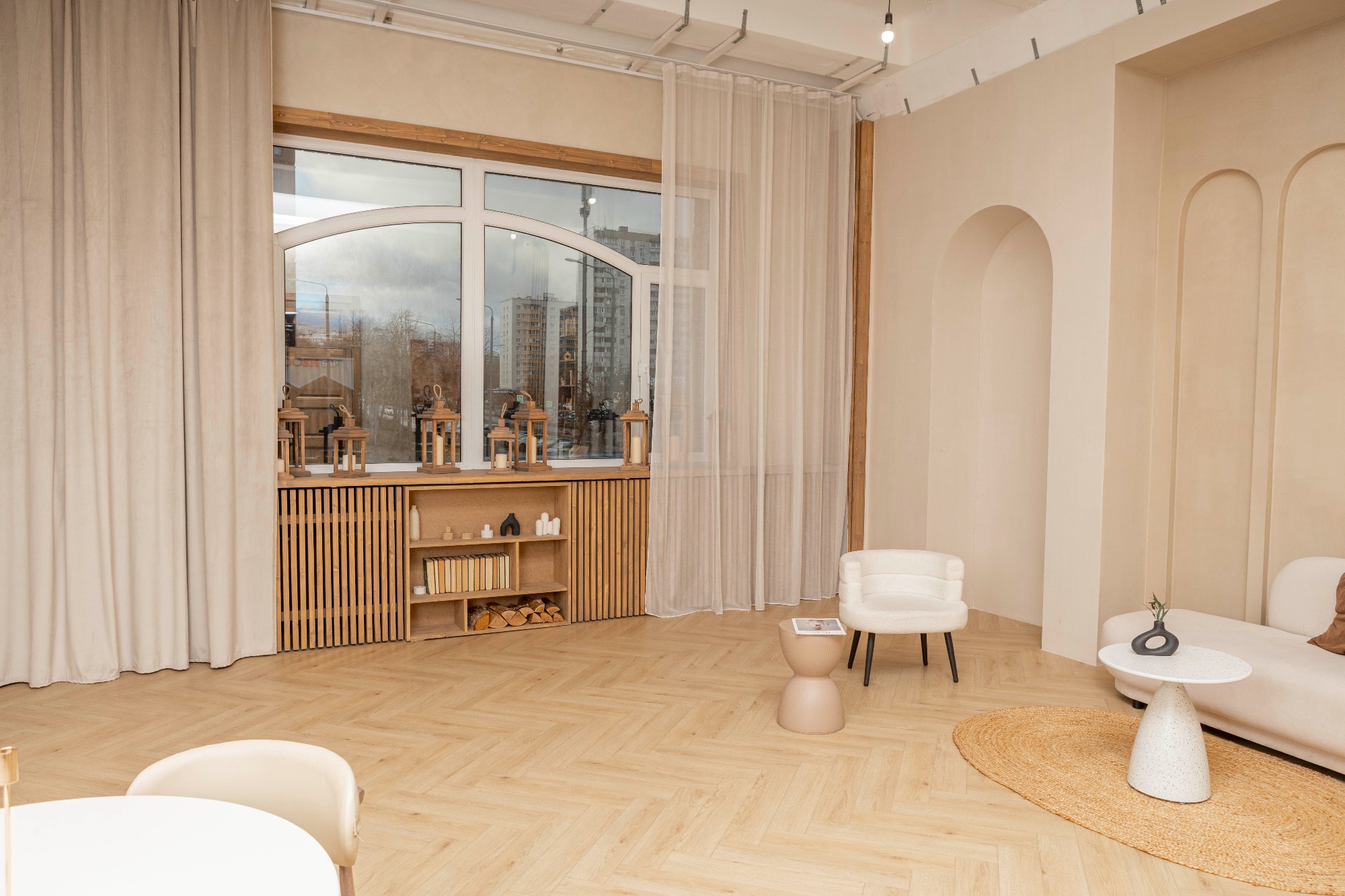 Уютный светлый зал с локациями в разных стилях для разнообразных снимков Зона с камином. Современный дизайнерский диван на фоне классических вытянутых арок. Деловая фотозона с книжным шкафом и рабочим столом. Большое окно, обрамленное деревом, может использоваться как отдельная фотозона, и позволяет проводить съёмки с дневным светом.
