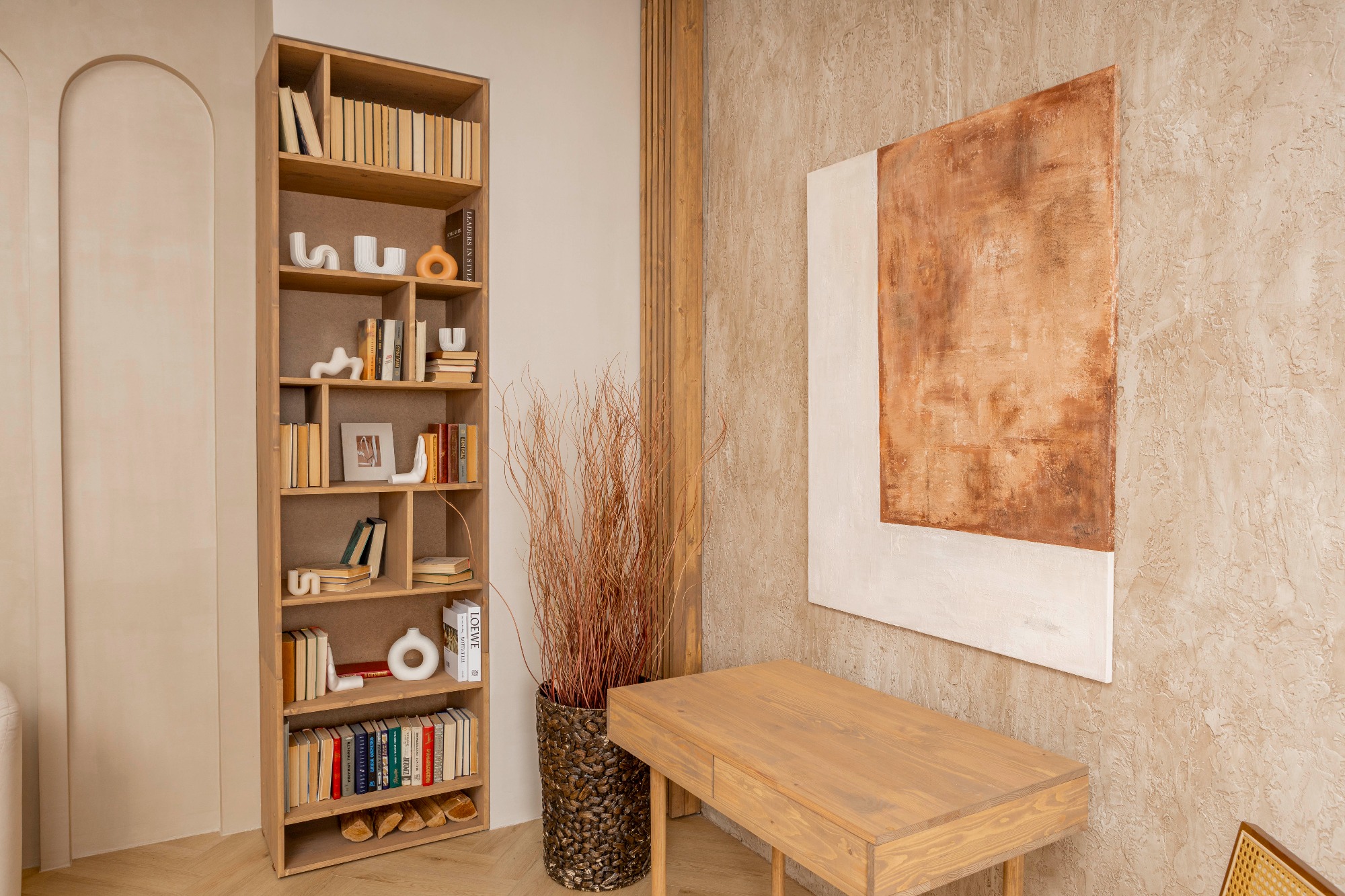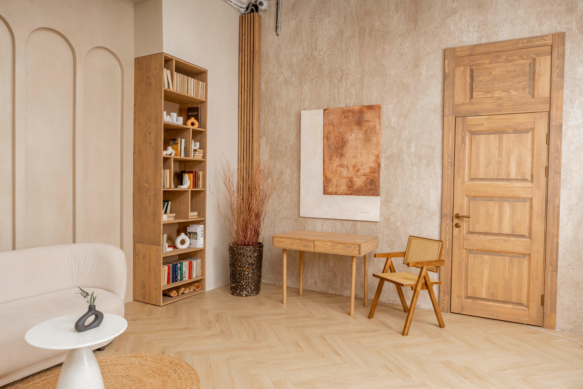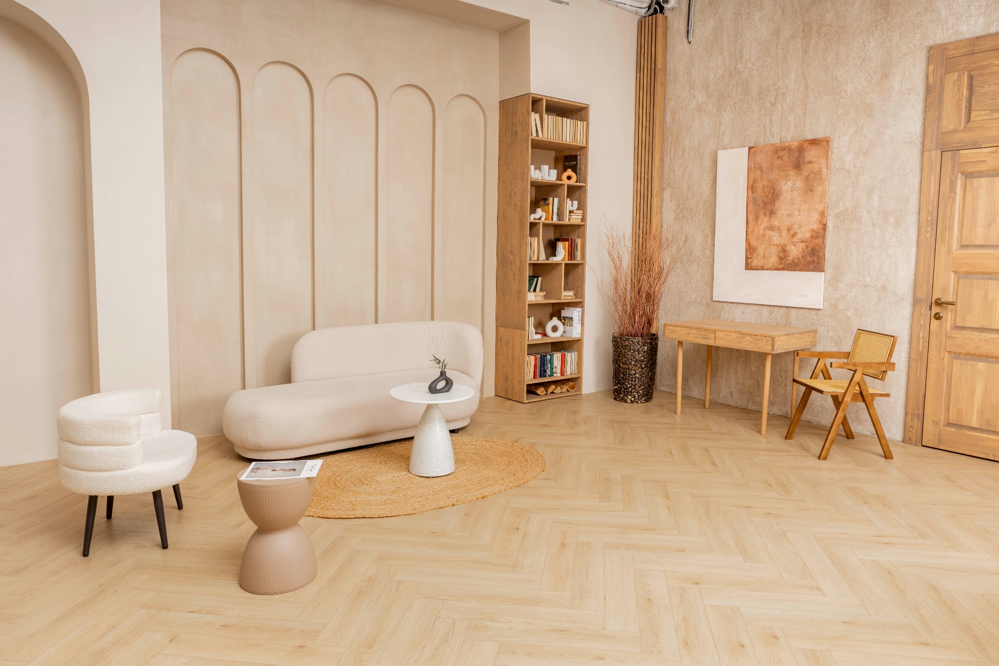 Уютный светлый зал с локациями в разных стилях для разнообразных снимков Зона с камином. Современный дизайнерский диван на фоне классических вытянутых арок. Деловая фотозона с книжным шкафом и рабочим столом. Большое окно, обрамленное деревом, может использоваться как отдельная фотозона, и позволяет проводить съёмки с дневным светом.