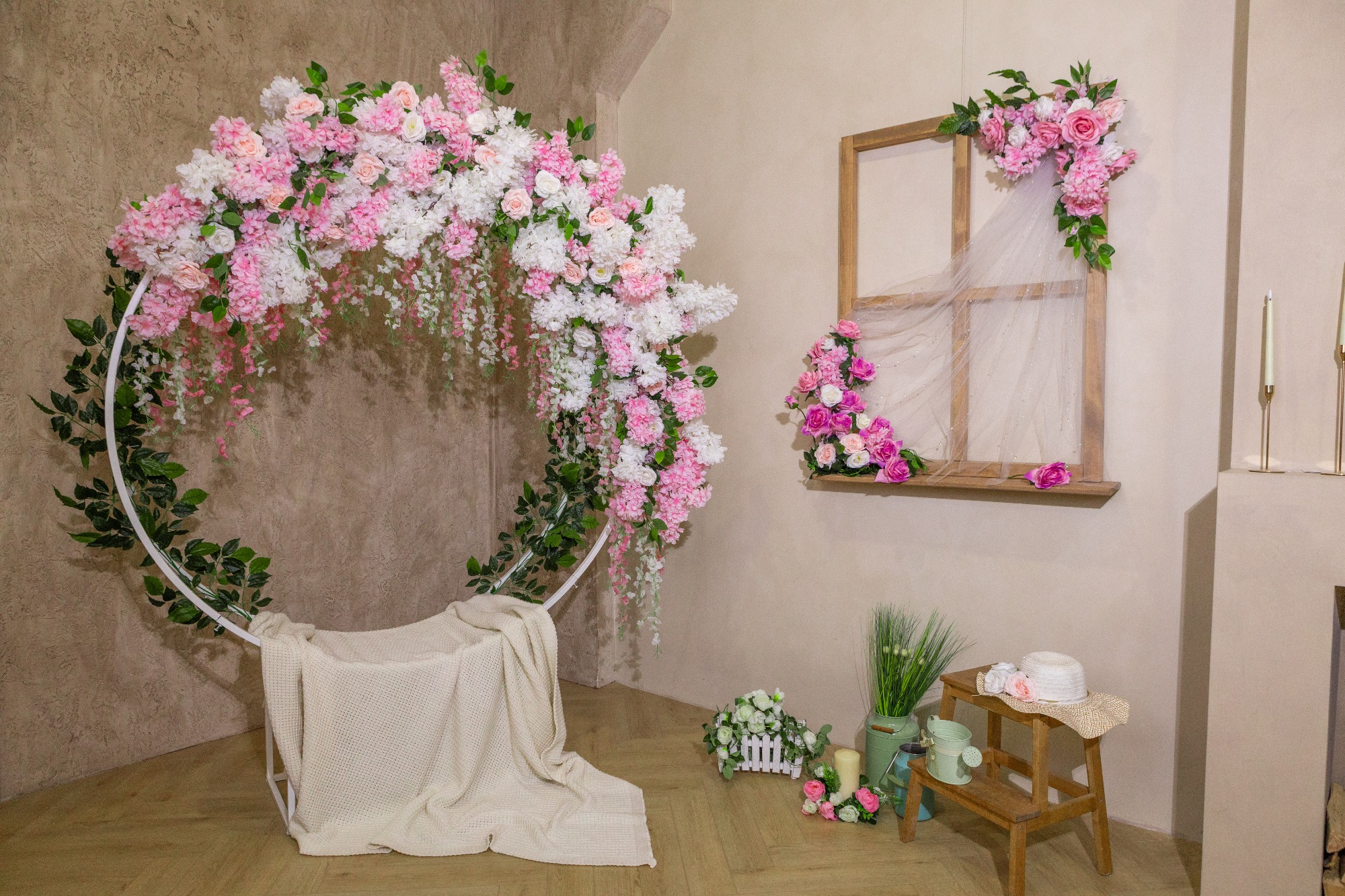 Также в зале «Облако» есть большая белая стена с лепниной. На её фоне получаются отличные снимки «love story», нежные детские, а также деловые фотографии. Эту стену можно дополнить любым реквизитом и создать необходимую фото зону.