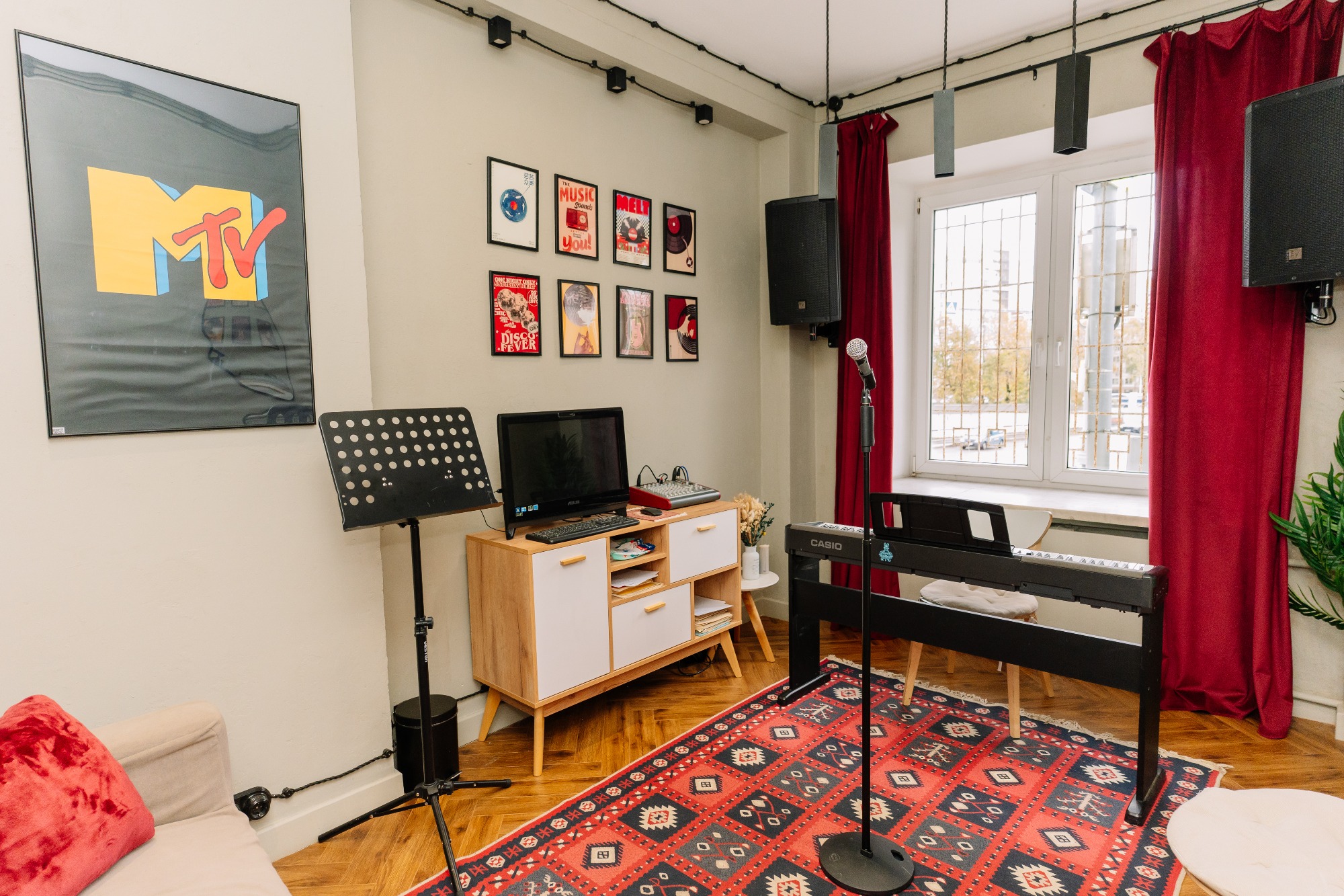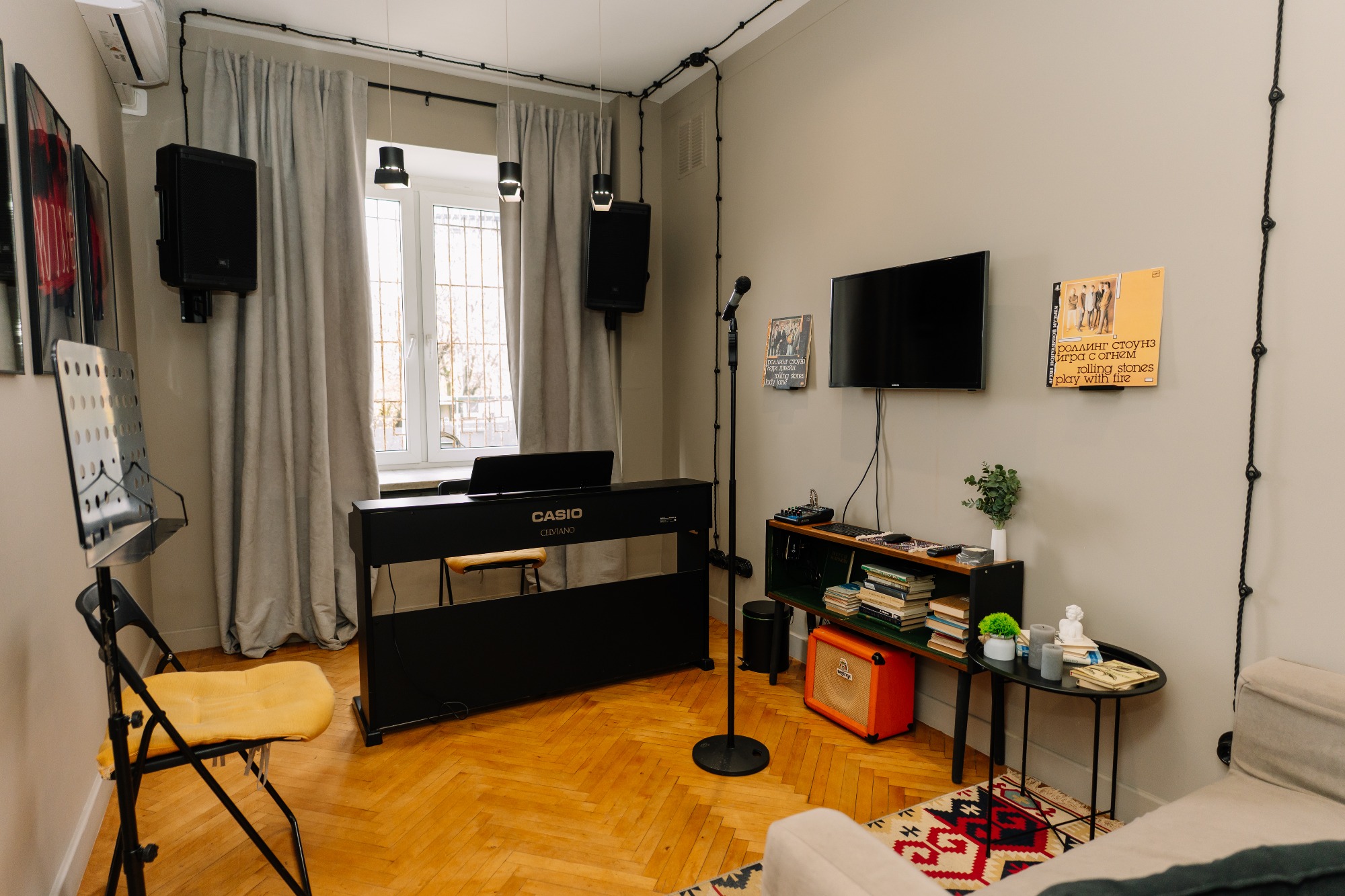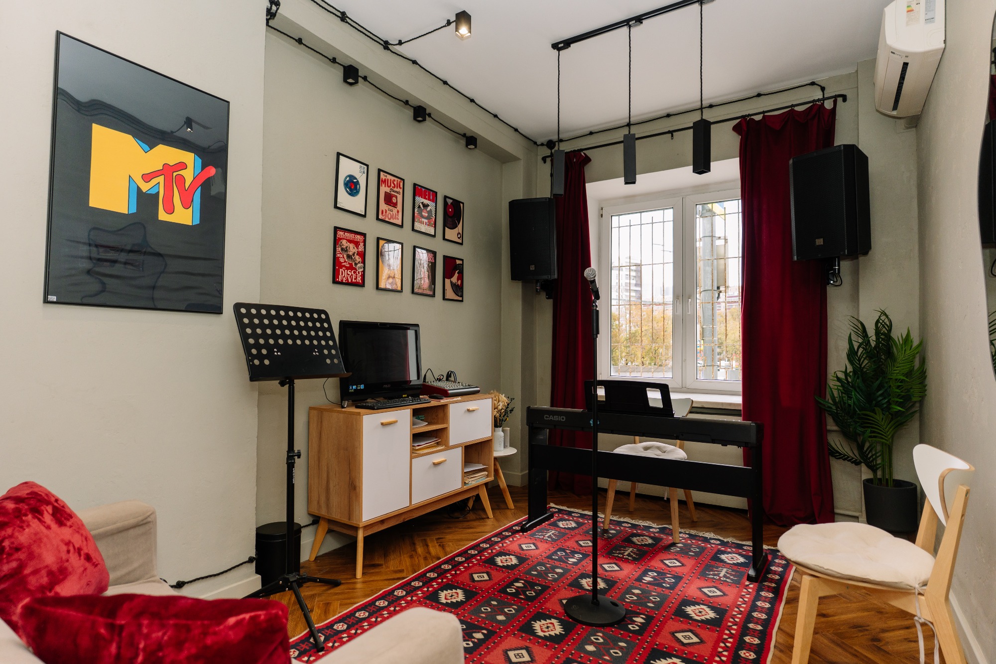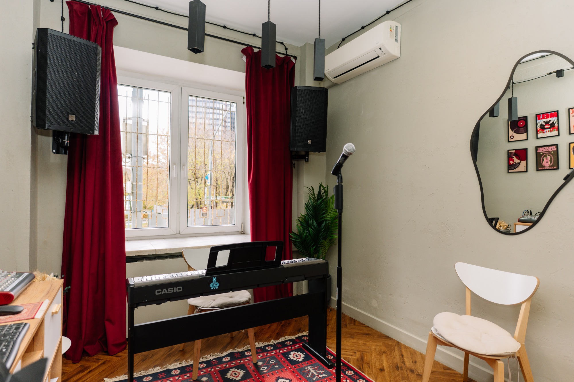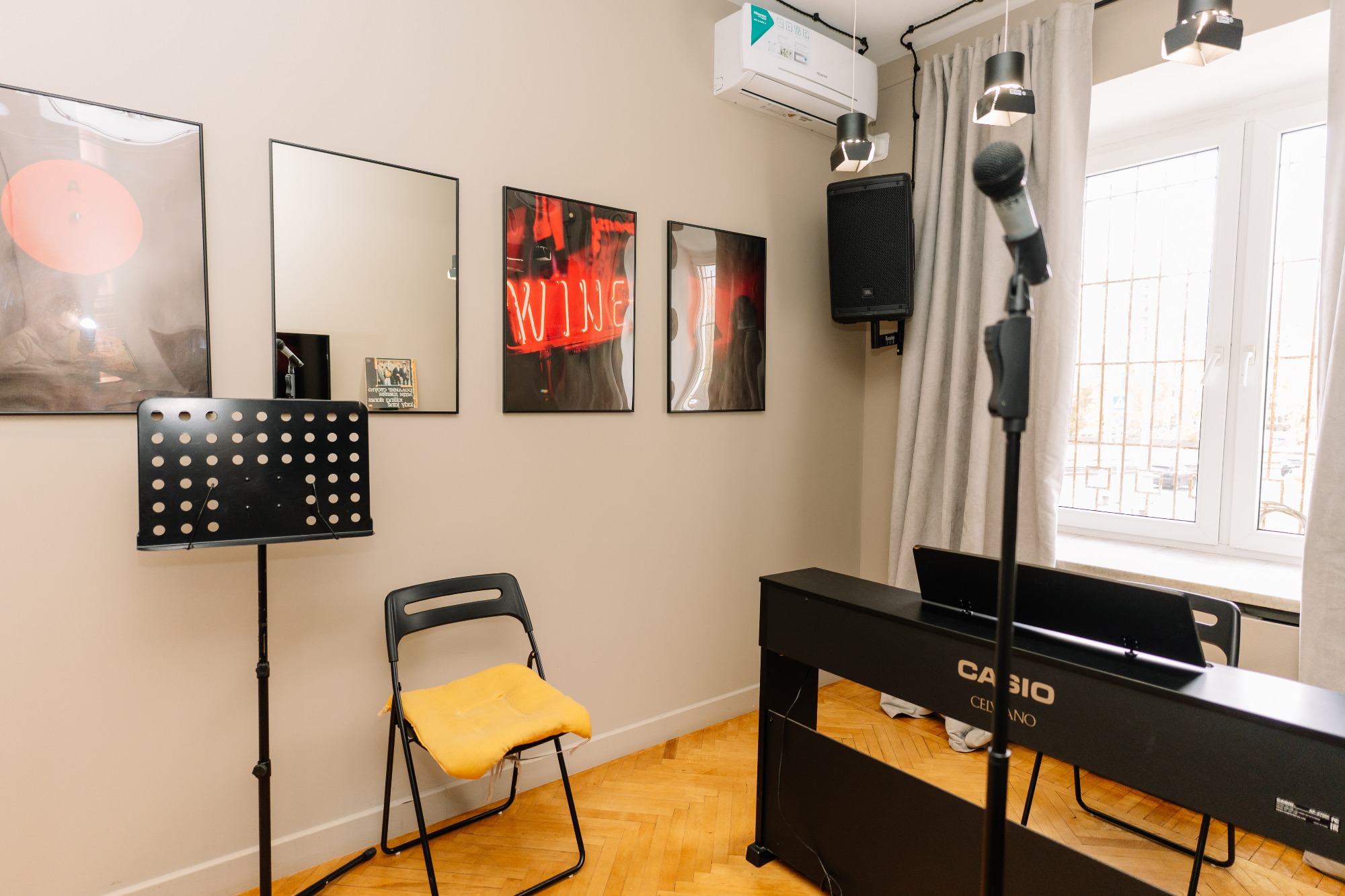 прекрасный класс, красиво подобранная цветовая гамма и есть все удобства: муз аппаратура, синтезатор, зеркало, диван/стулья, пюпитр. все рабочее. приятно заниматься! 3 минуты от метро