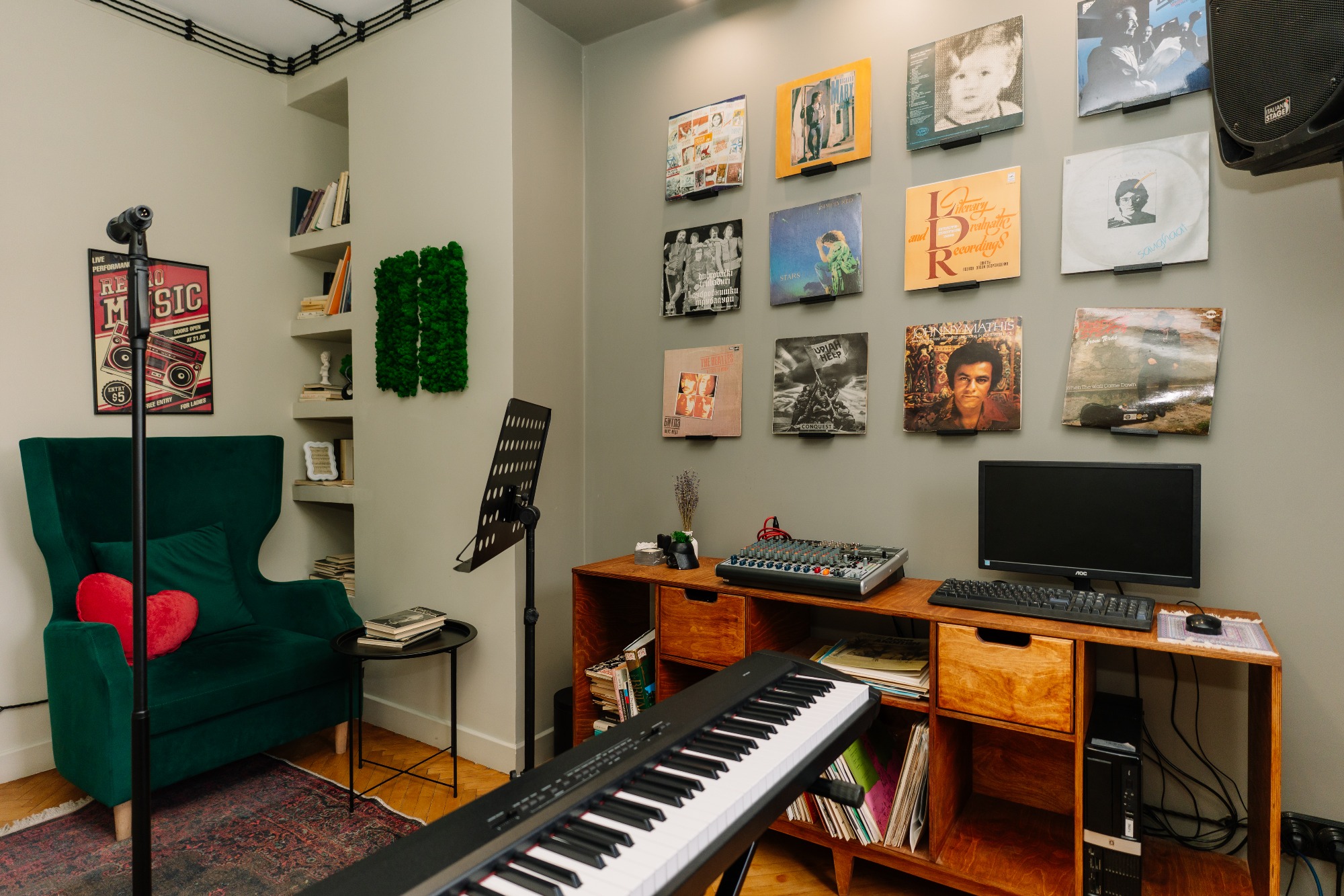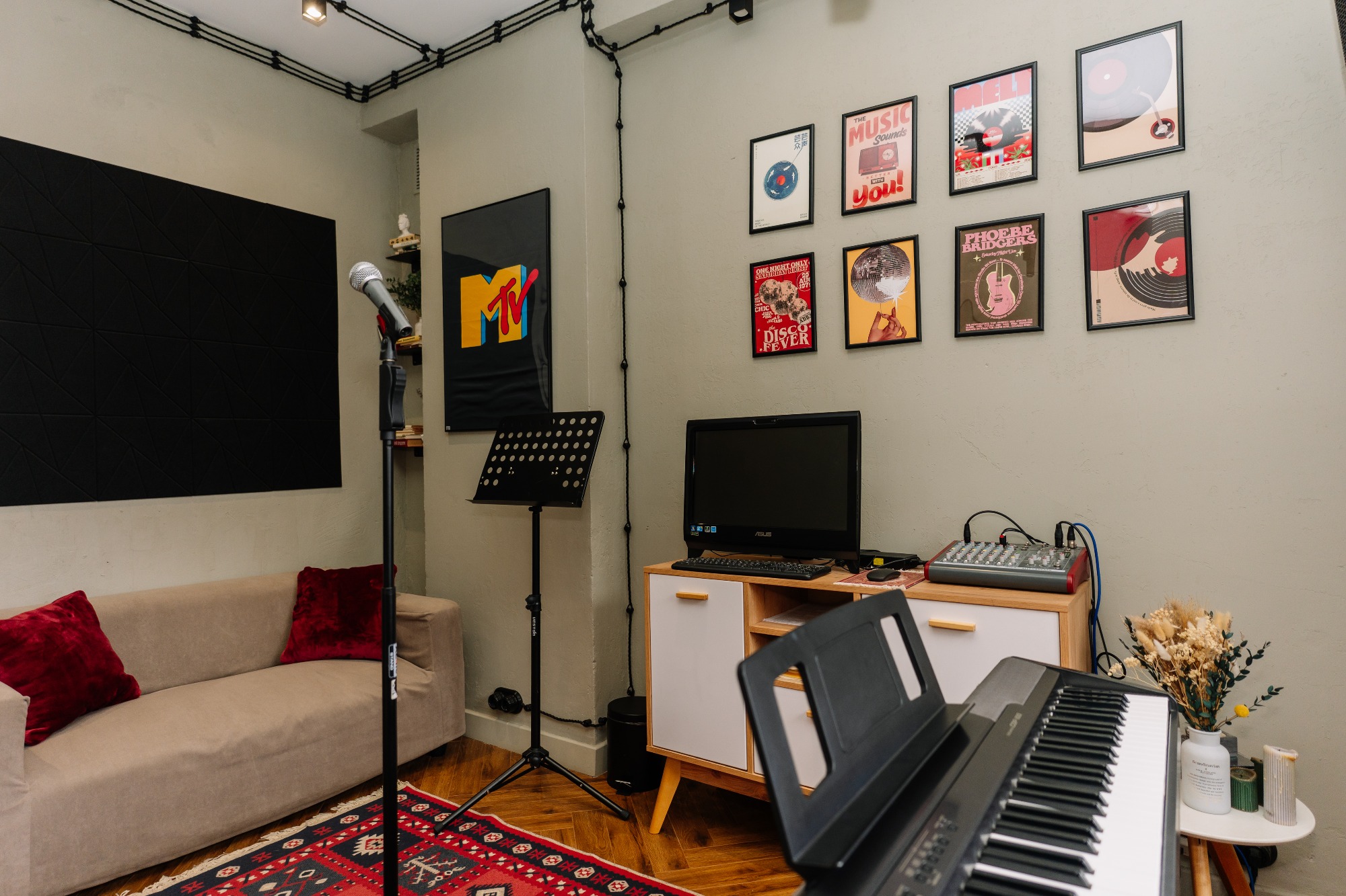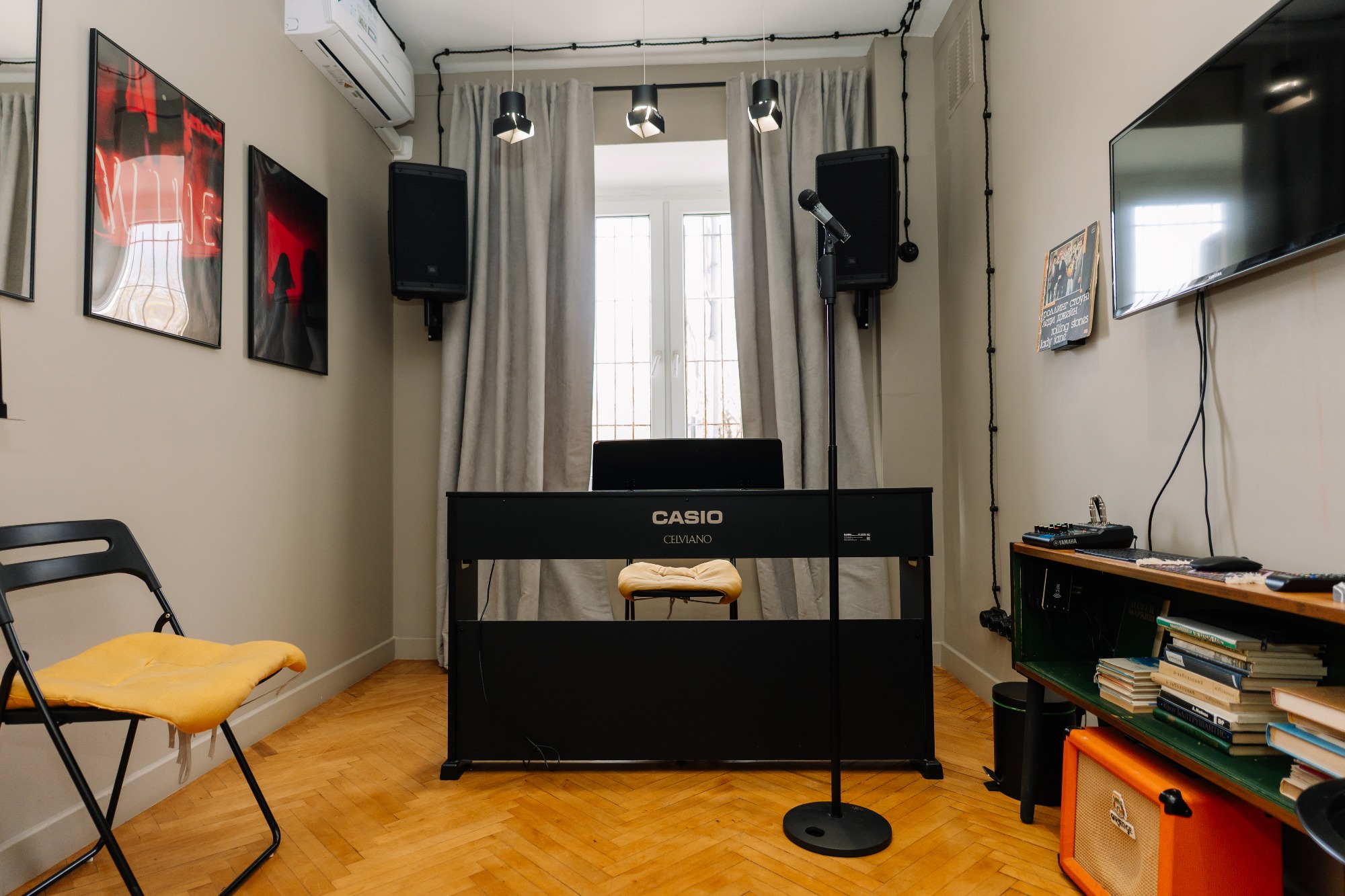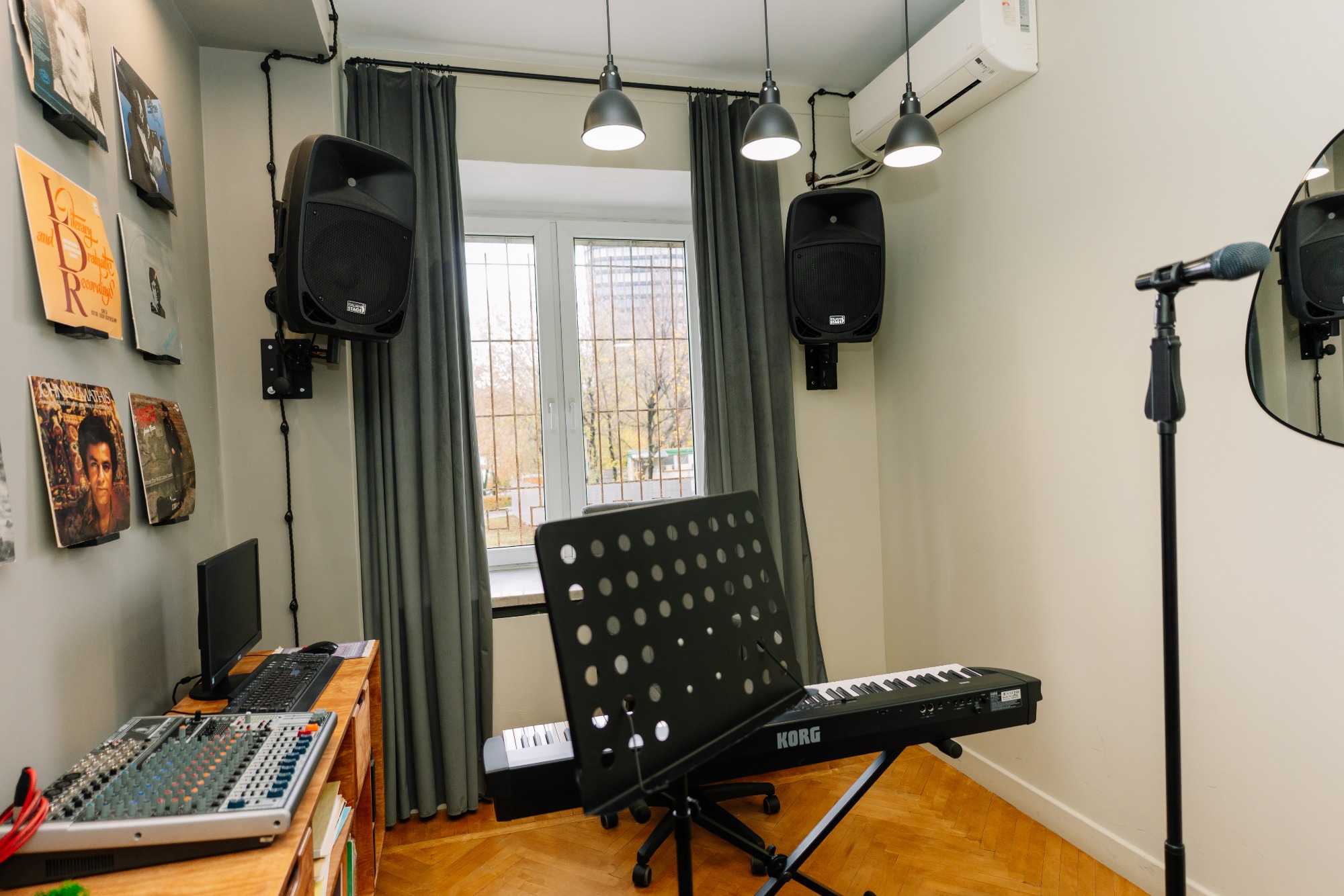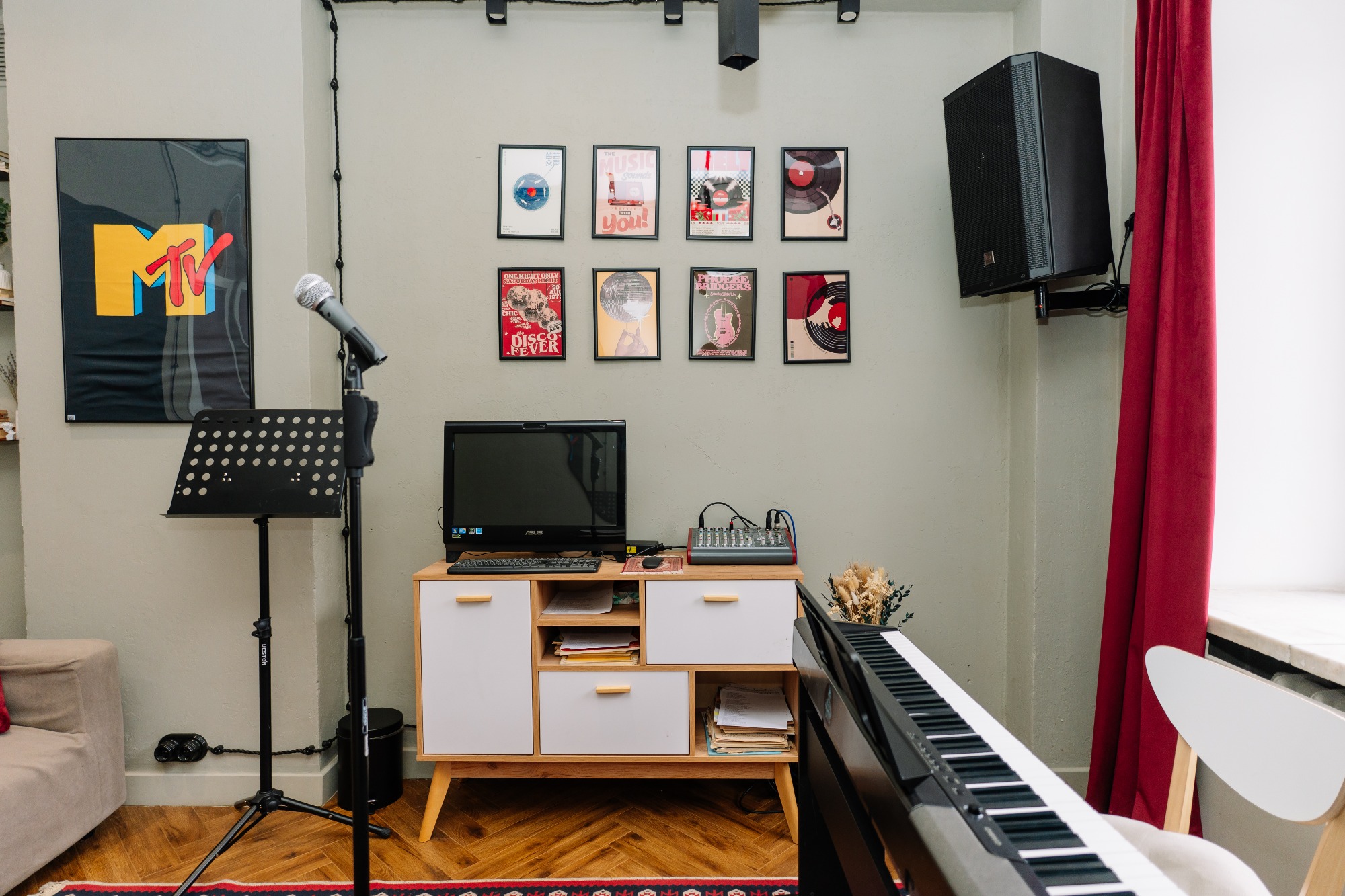 прекрасный класс, красиво подобранная цветовая гамма и есть все удобства: муз аппаратура, синтезатор, зеркало, диван/стулья, пюпитр. все рабочее. приятно заниматься! 3 минуты от метро