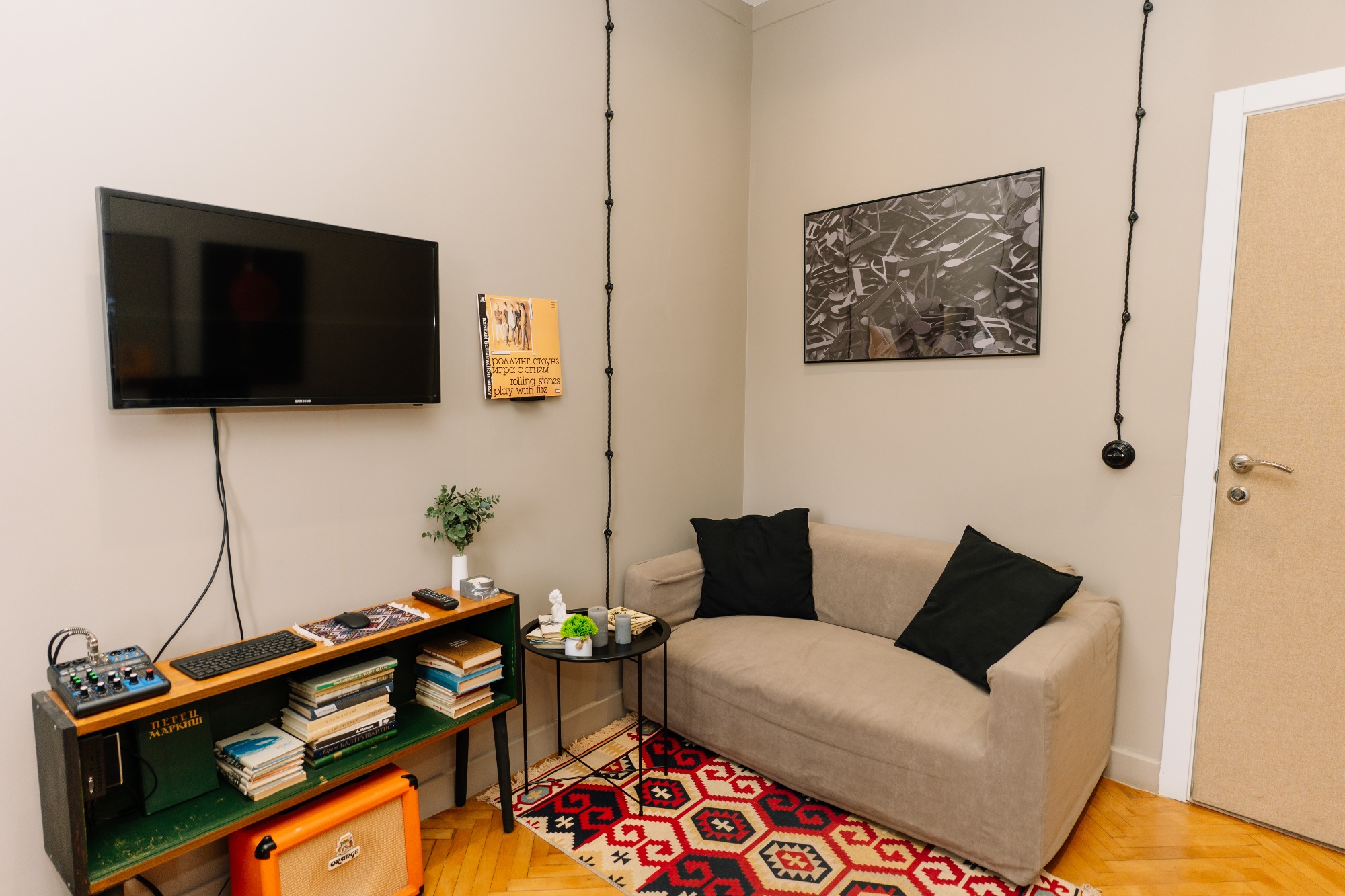 Прекрасный дизайн, сразу попадаешь в атмосферу творчества и музыки. Отличная техника, великолепное расположение! Отдельное спасибо админииаиратору, создал атмосферу тепла и уюта, спасибо! Однозначно советую))))