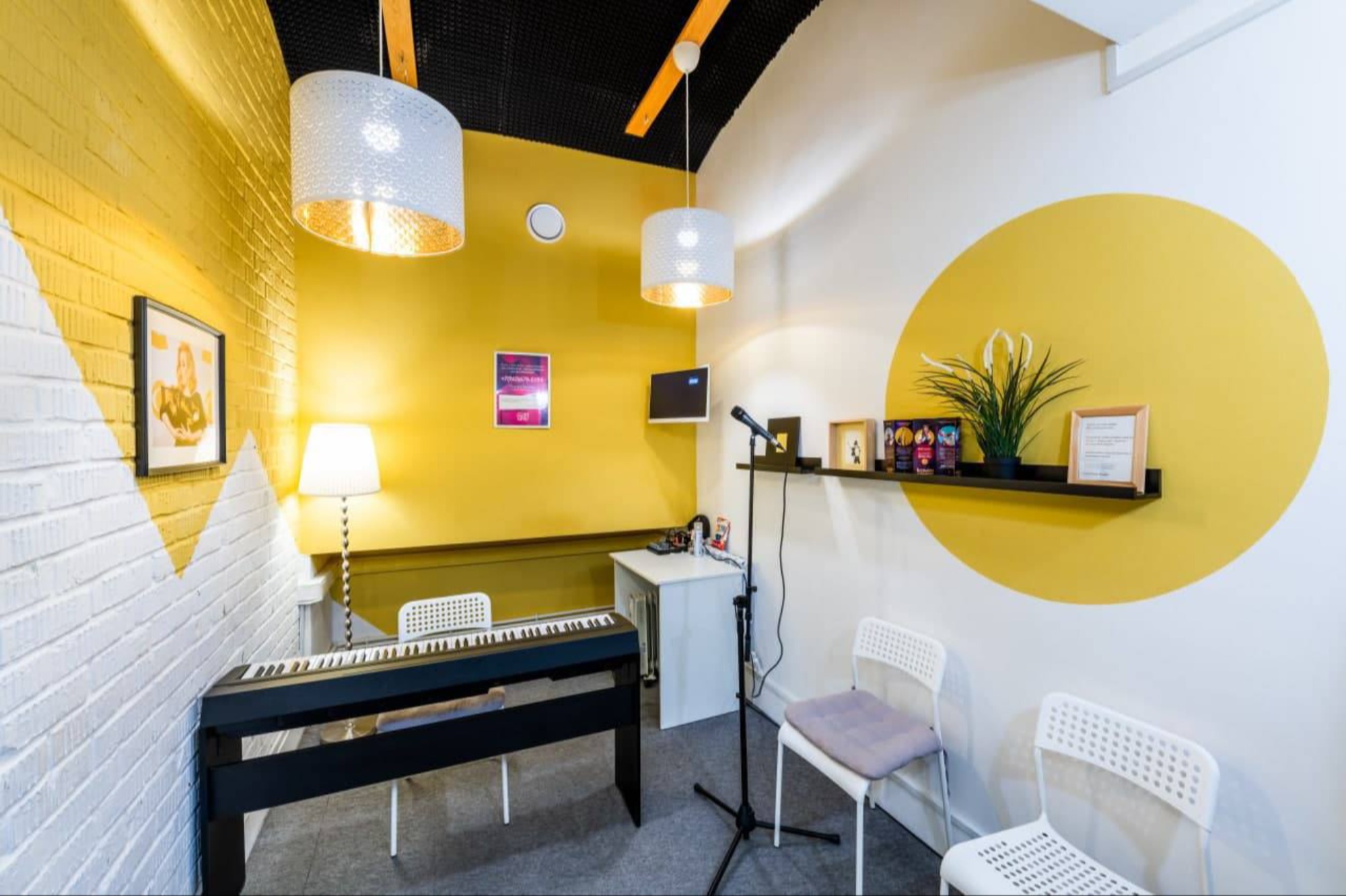 Во-первых очень понравились музыкальные кабинеты,уютное освещение,теплые цвета,жёлтый всё как я люблю)))Хорошее звучание аппаратуры,приятно петь в классах,отличное оформление ,выбрала для аренды именно эти классы так,как здесь действительно приятно находиться,это цокольное помещение,но там все грамотно сделано ,приветливые администраторы,творческая атмосфера ,если сравнивать с другими студиями,я бы выбрала эту площадку,по причине освещения,для меня очень важно теплое ненавязчивое освещение,приятная акустика в классах,уютно,и прекрасный звук,занималась много где,есть с чем сравнить,здесь думаю я здесь надолго ,приятные цены,для меня очень важна эстетика,и вежливость,и администратор,даже помогла найти компьютер,когда случилась проблема с моим телефоном,рекомендую,и сама буду приходить в это солнечное атмосферное место.Благодарю)☀️🙏🙂