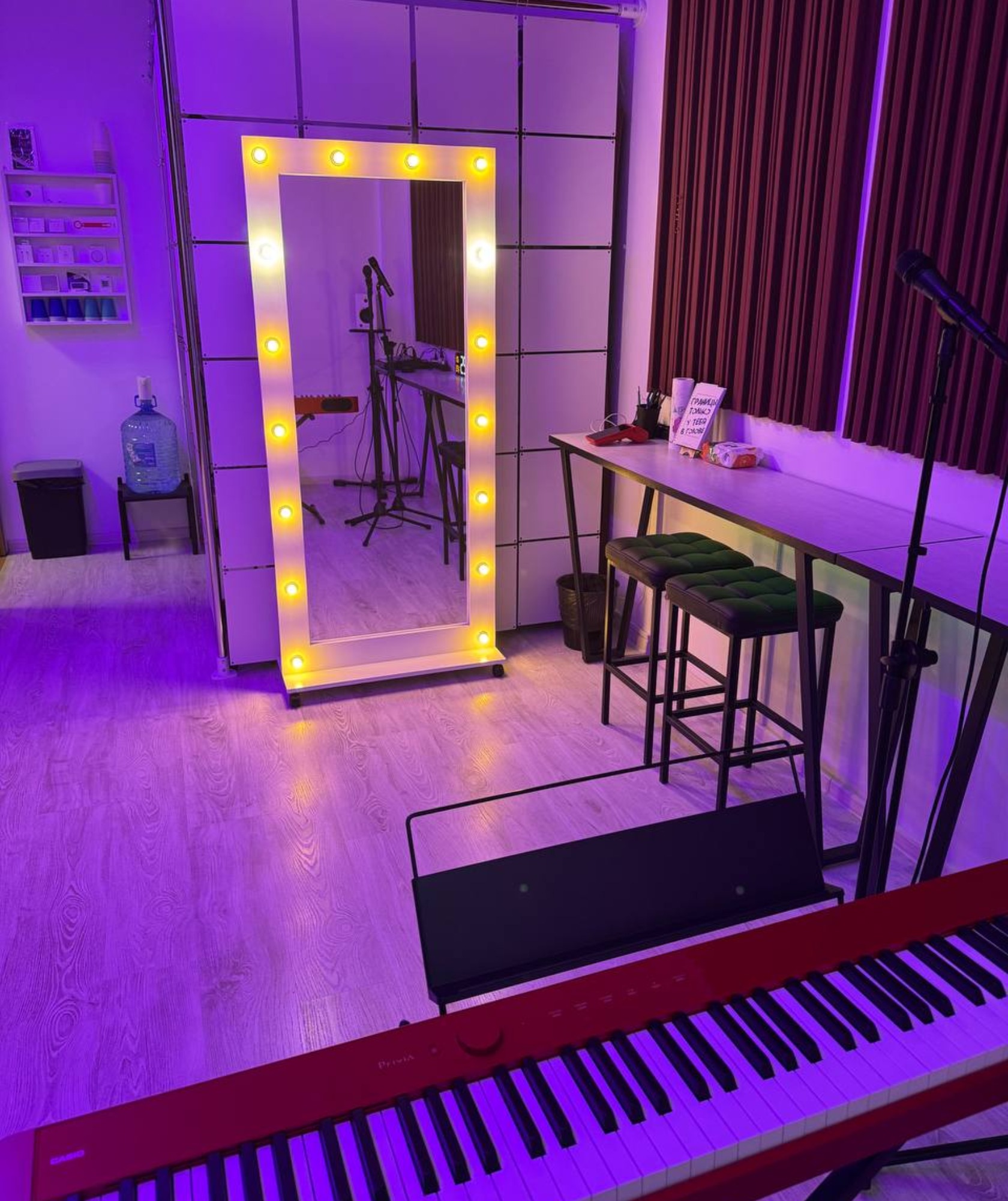 Доп свет (штатив, шторки) 200р Доп микрофон 250р Доп микшер 350р Гитара с подключением / без 500р Электрогитара 750р Второе фортепиано 1000р Интерьер Зеркало Дополнительная подсветка интерьера Не подвал Окна