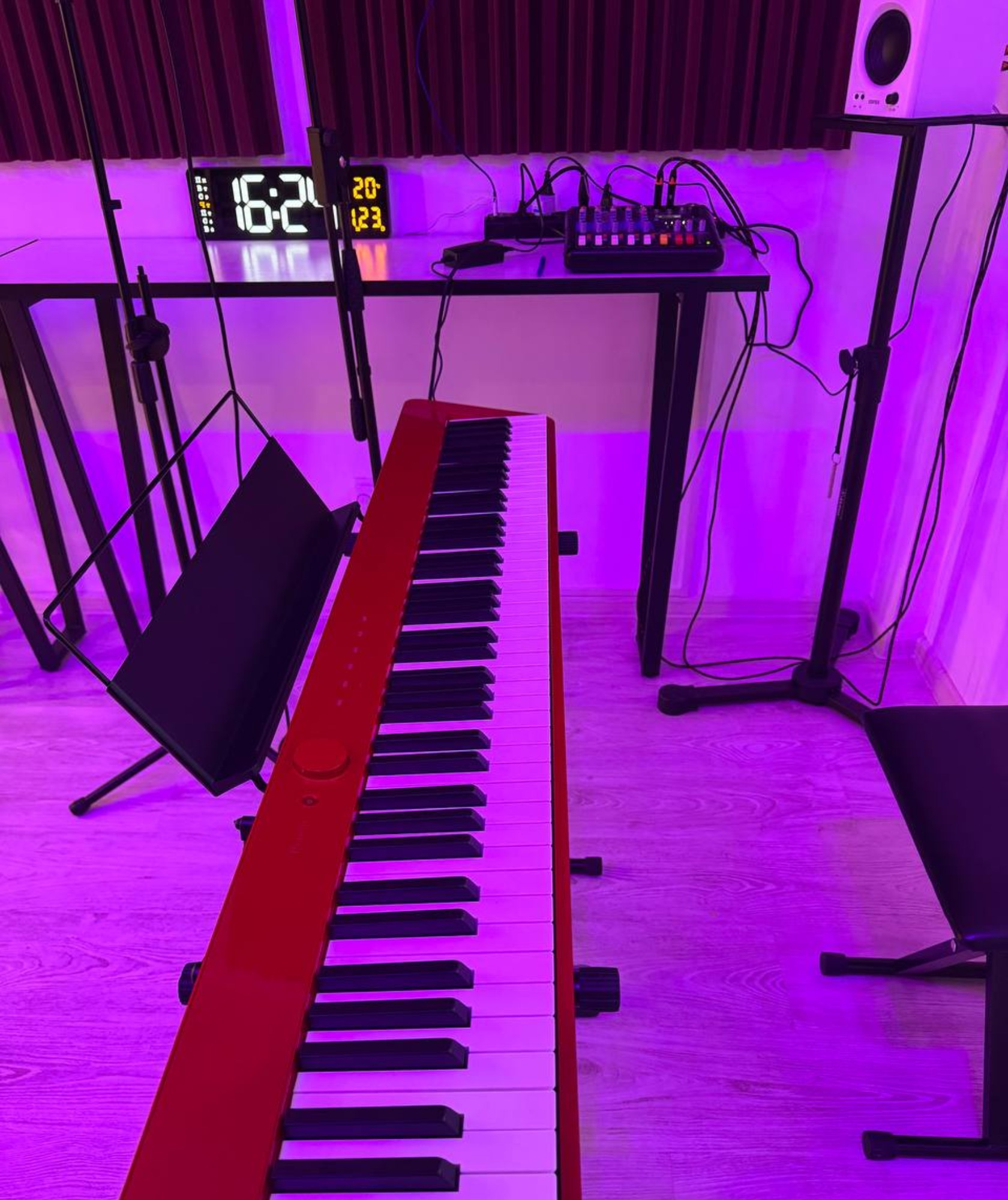 Очень теплое и уютное место. Пока идеально для занятий с учеником и индивидуальных репетиций. Но ребята в планах хотят расширить парк оборудования. Тогда место перерастёт в разряд волшебных)