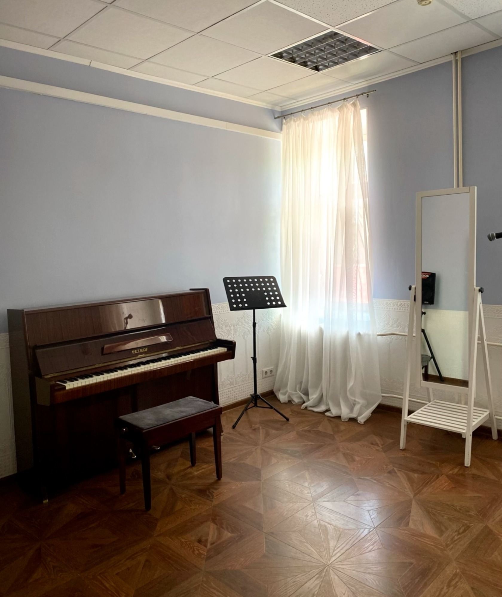 Очень приятная студия в самом центре. Большой класс с зеркалом и маркерной доской. На фортепиано расстроена нота си первой октавы