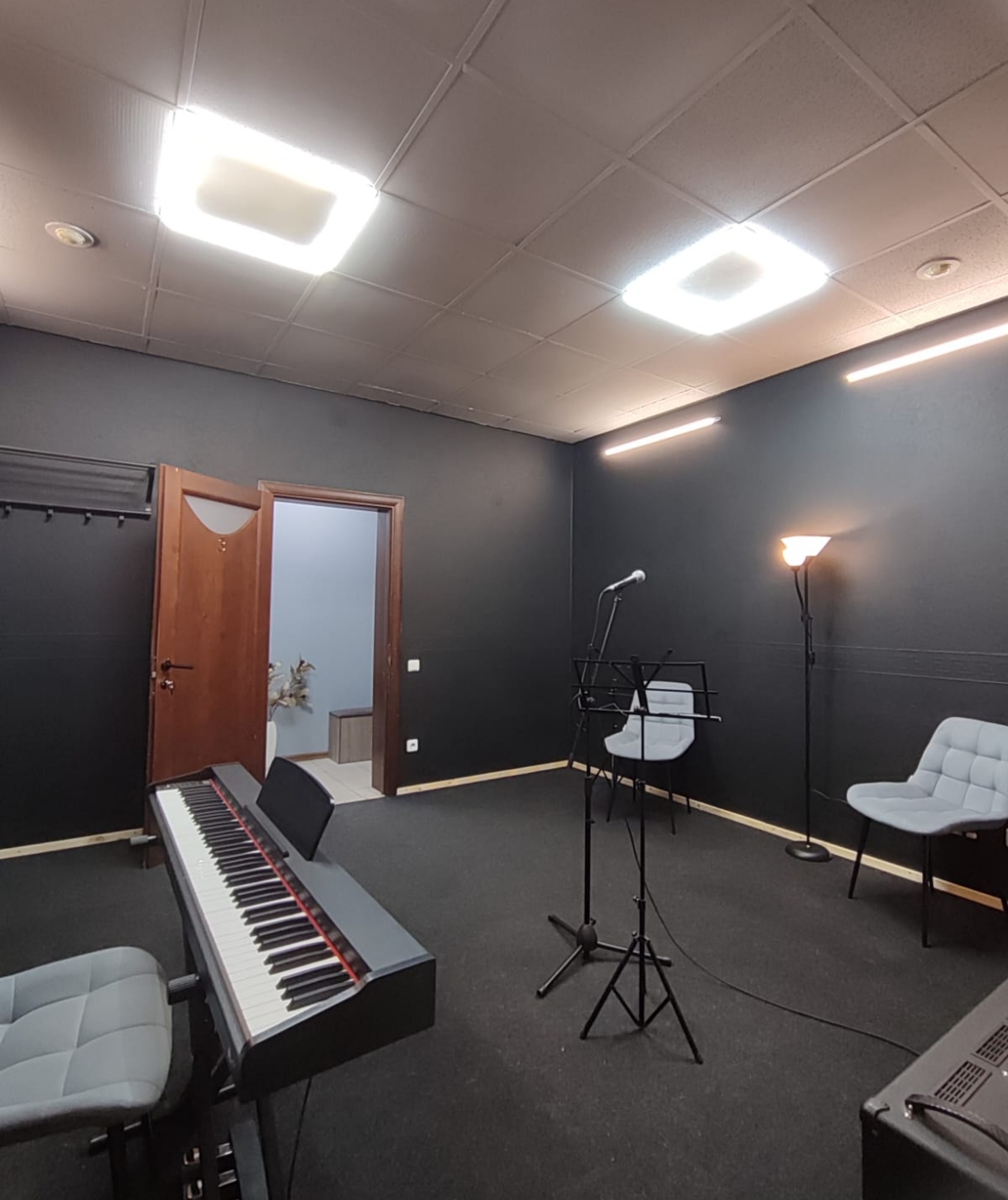 Для занятий вокалом, на акустических и электроинструментах, актерских репетиций.