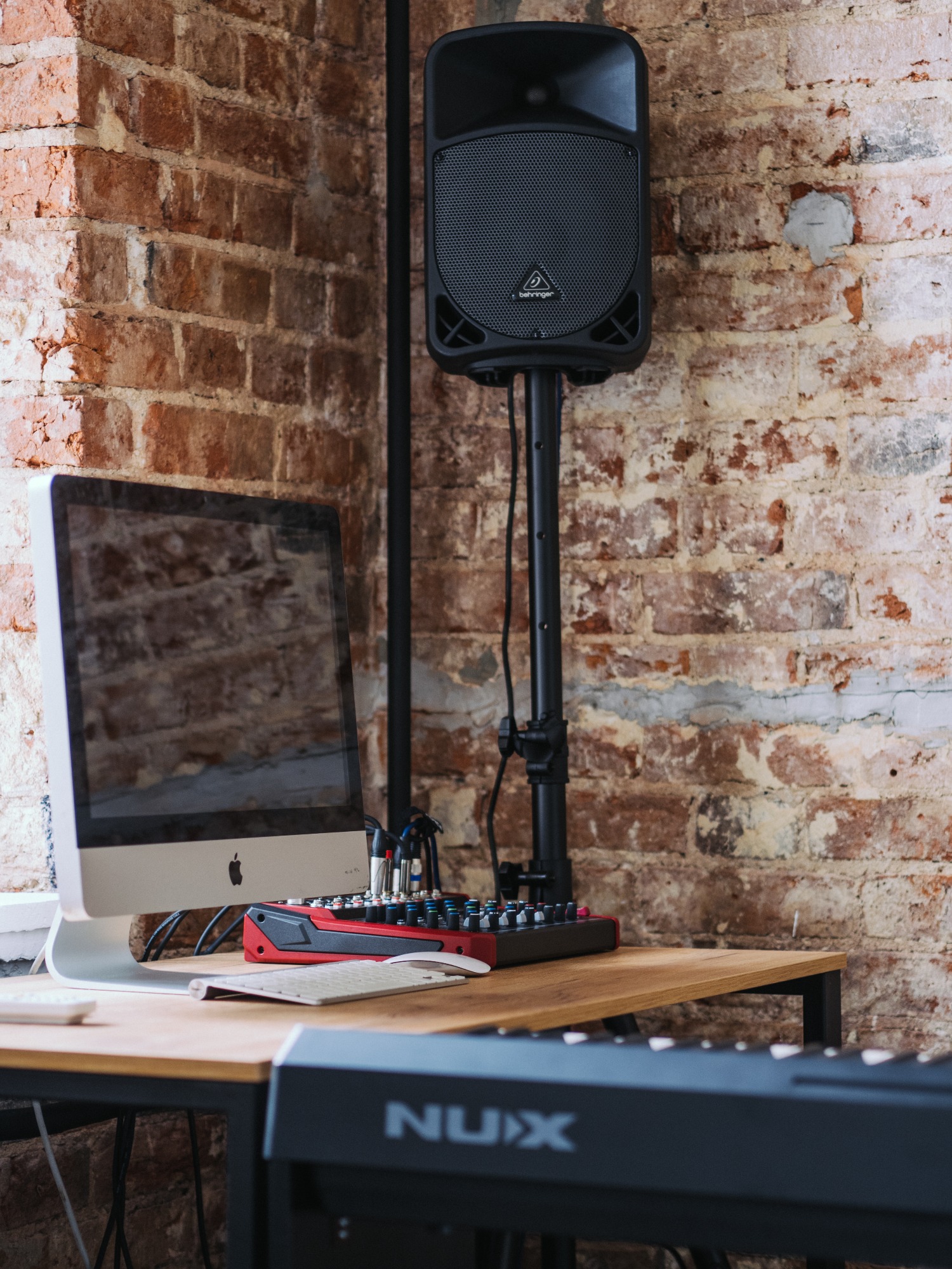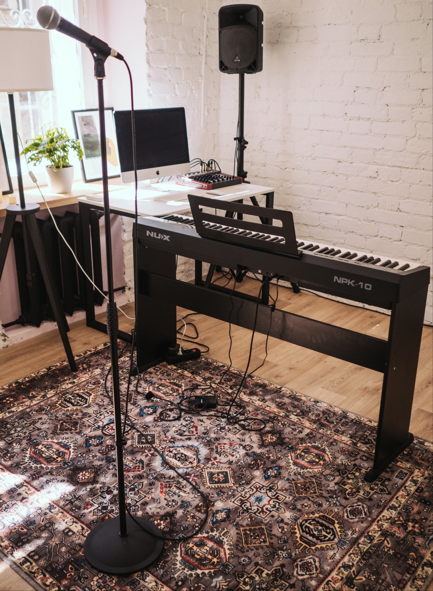 О площадке Клавиши Nux npk-10 (взвешенная, молоточковая) Микрофон Shure sm58 Микшерный пульт с блютуз и процессором эффектов Proel playmix 8 Порталы Behringer Eurolive b108d Интерьер Зеркало