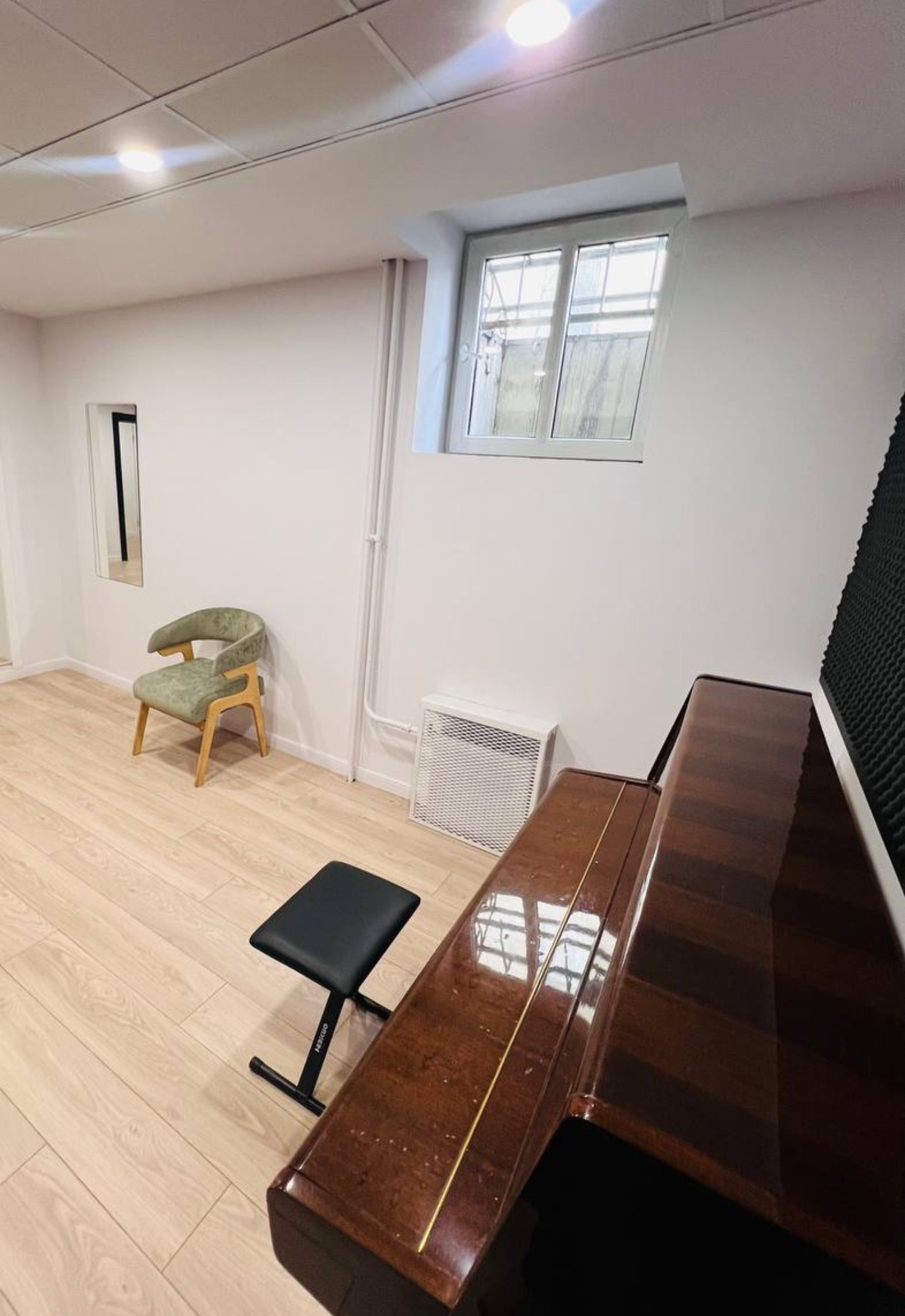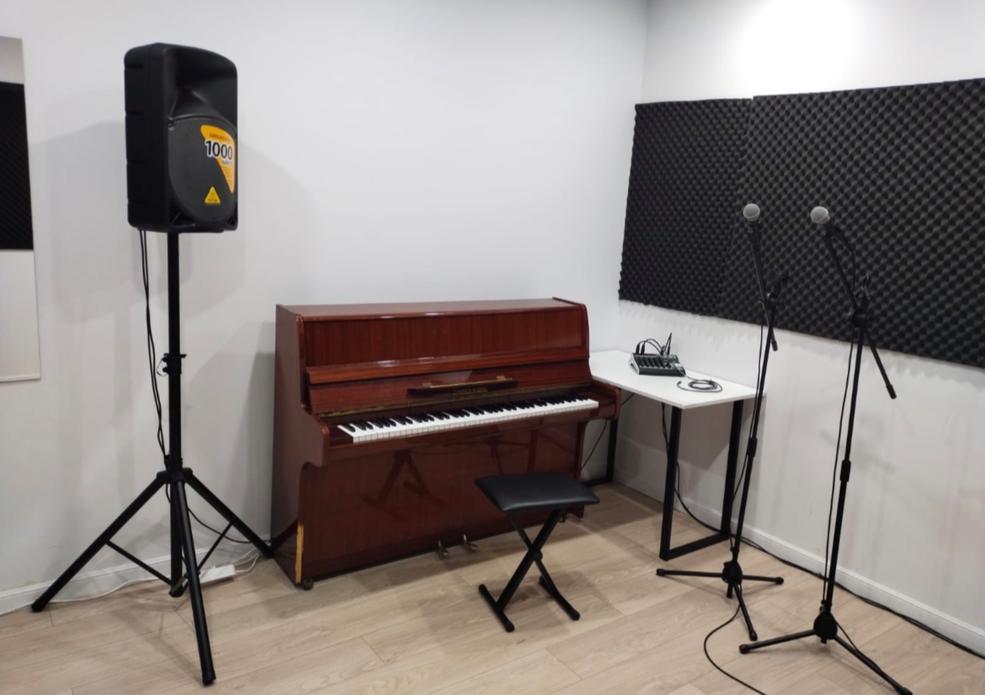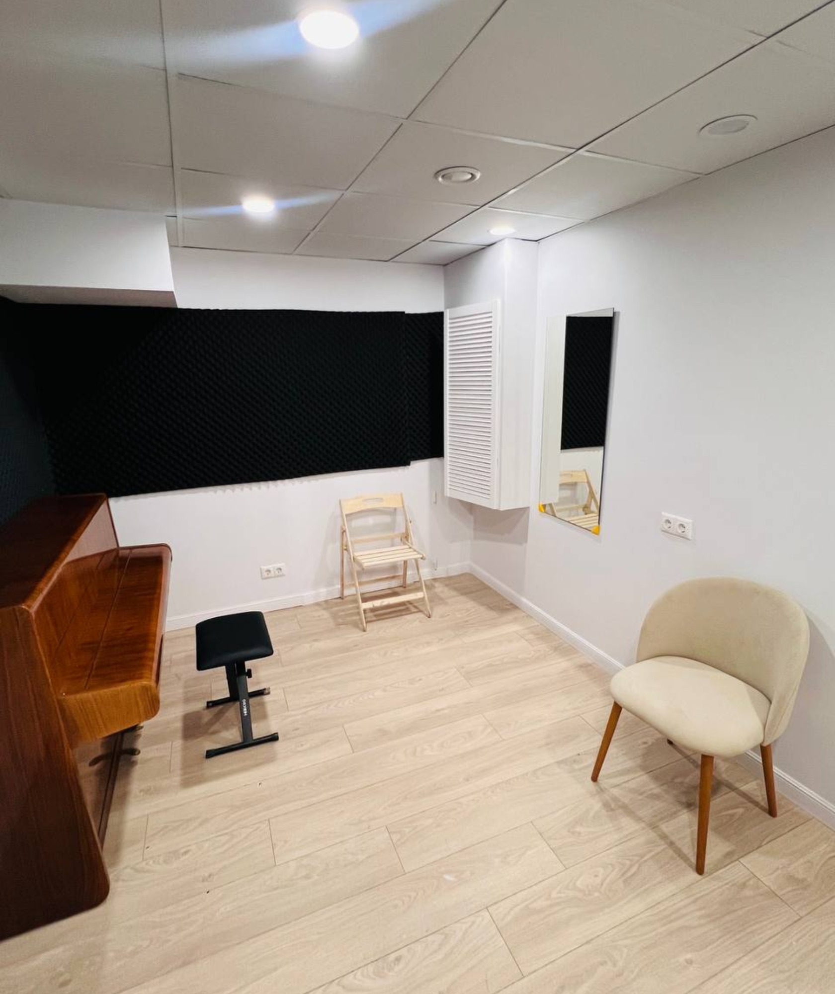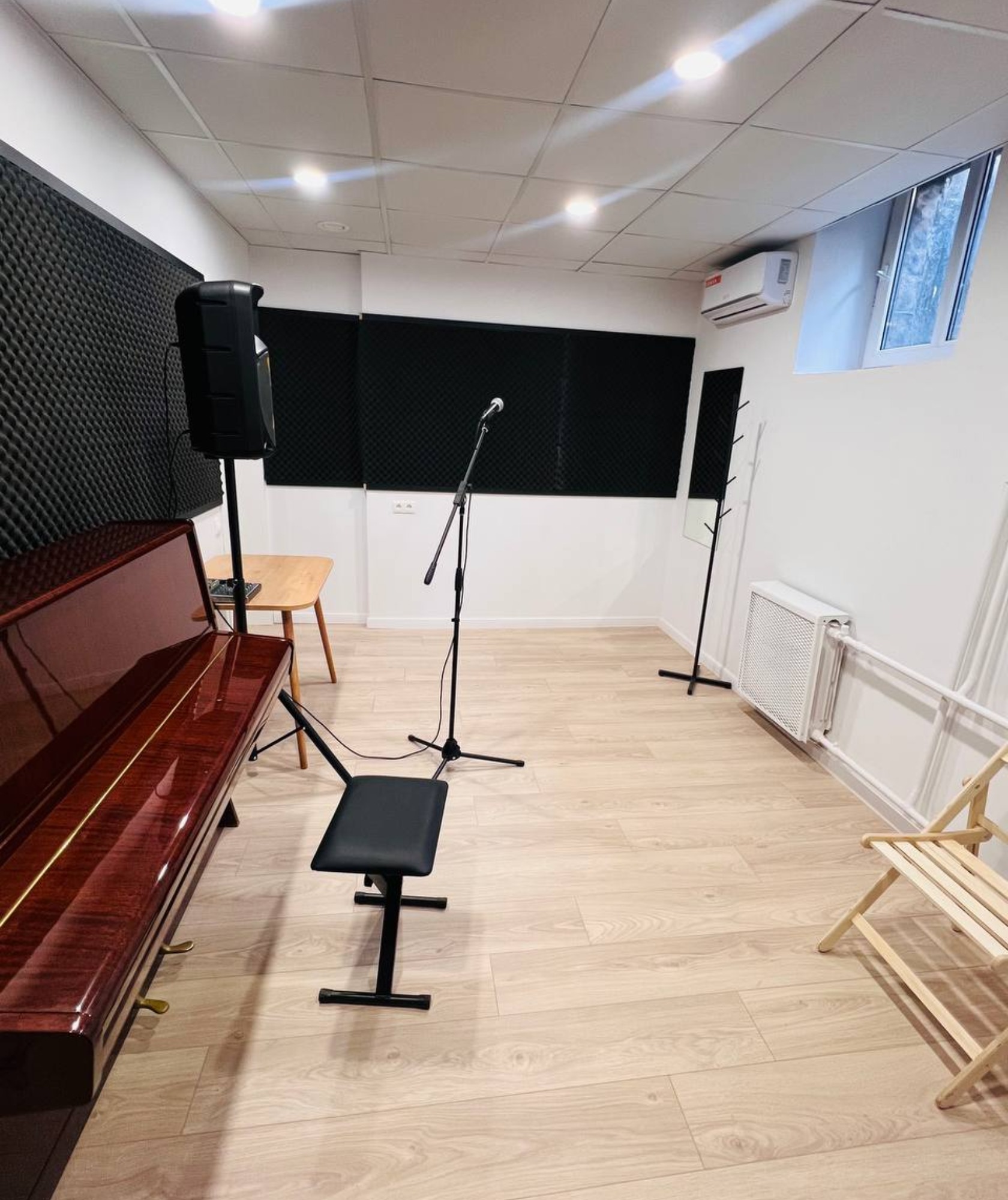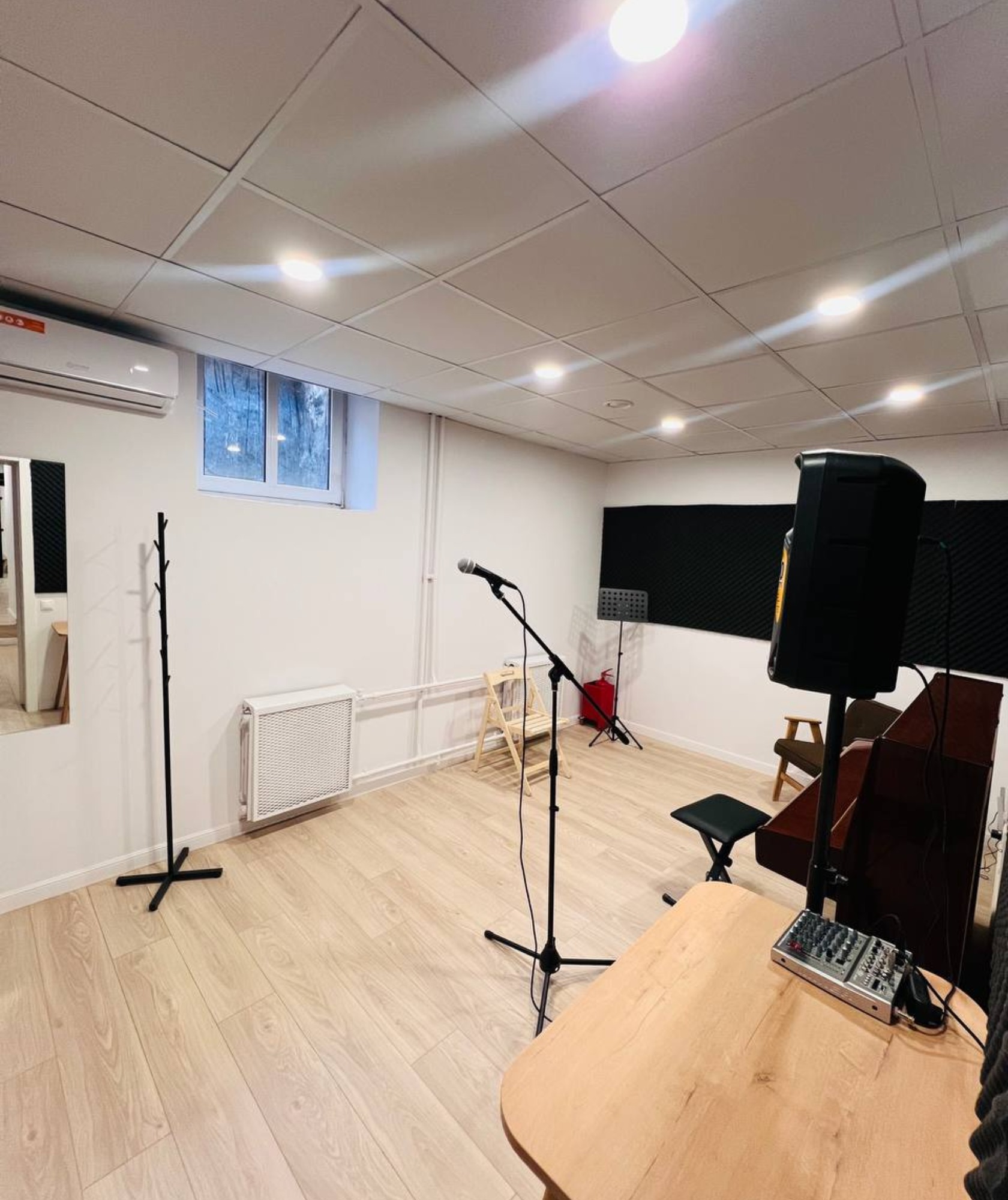 Хороший репетиторий. Немного слышно соседей (когда сами звучим - не критично). Пианино глуховатое, но хорошее. Не логичная расстановка: зеркало под кондеем, дуть в лицо поющему - так себе затея. Совет: сдвинуть фно к двери, колонку в угол, микшер между ними, зеркало над микшером, чтобы педагог-правша не скручивался во время игры упражнений, а ученик стоял бы лицом к педагогу и к зеркалу.