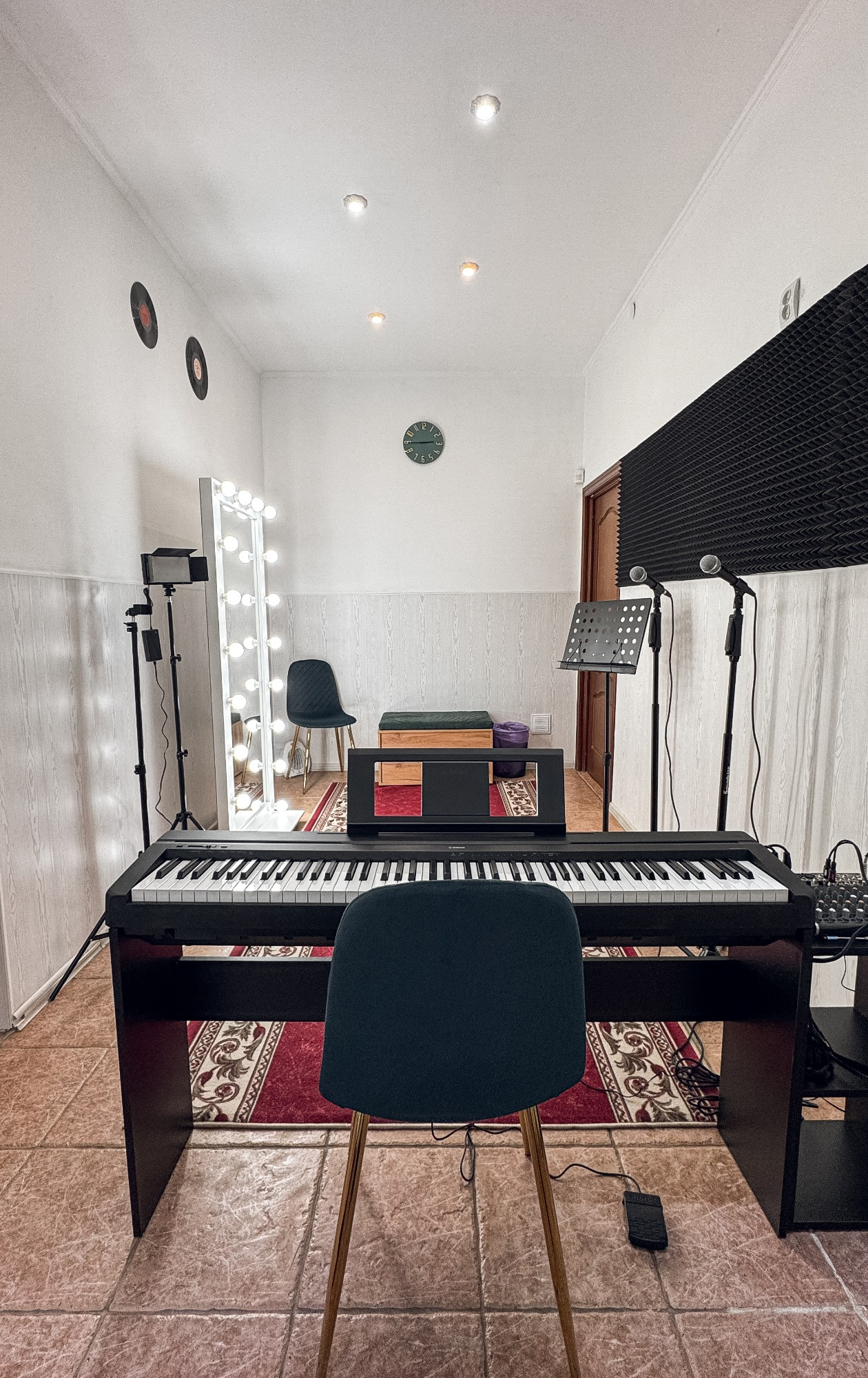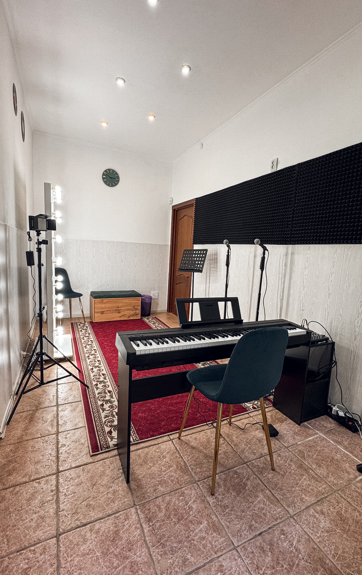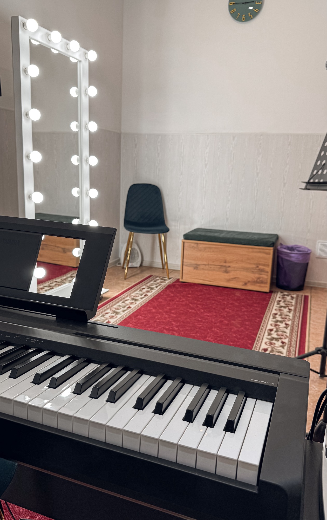 Класс оснащен новой аппаратурой для удобства и качества занятий: - Электронное фортепиано Yamaha P45, которое идеально подходит для вокальных упражнений и аккомпанемента. - Два динамических микрофона Shure, которые обеспечат кристально чистый звук. - Акустическая система Behringer, создающая качественное звучание для комфортных репетиций.