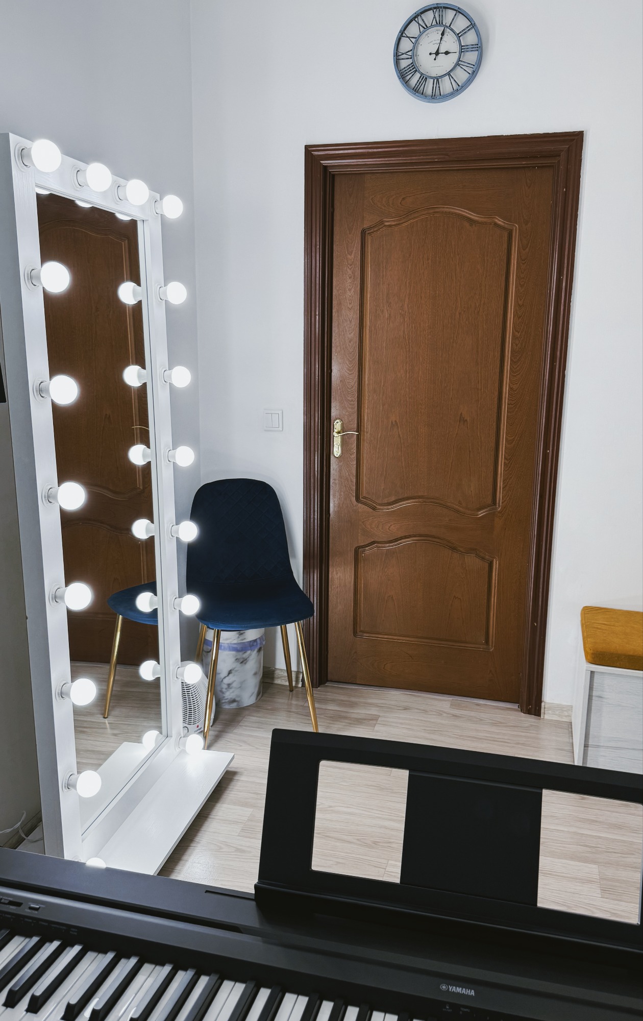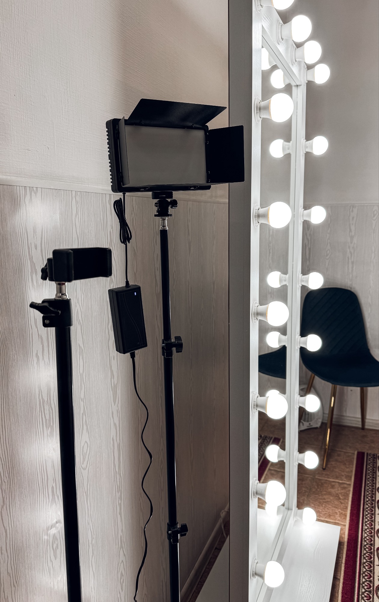 Для удобства гостей также предусмотрены дополнительные удобства: Штатив с держателем для телефона, чтобы легко записывать или снимать занятия. - Световая лампа на штативе для красивых фотографий. - Большое зеркало с лампочками, которое создаст атмосферу уюта и позволит работать над осанкой и выразительностью.