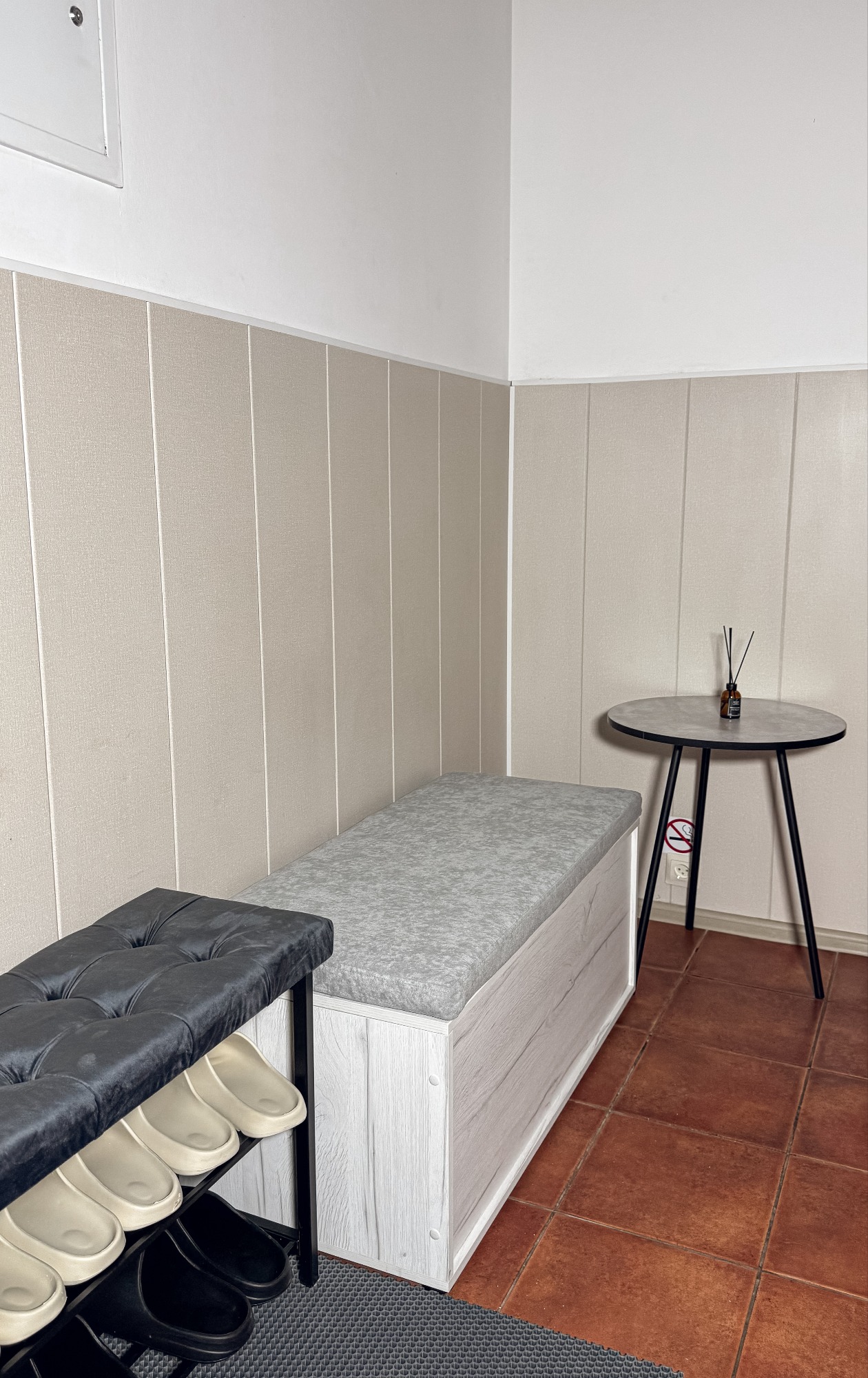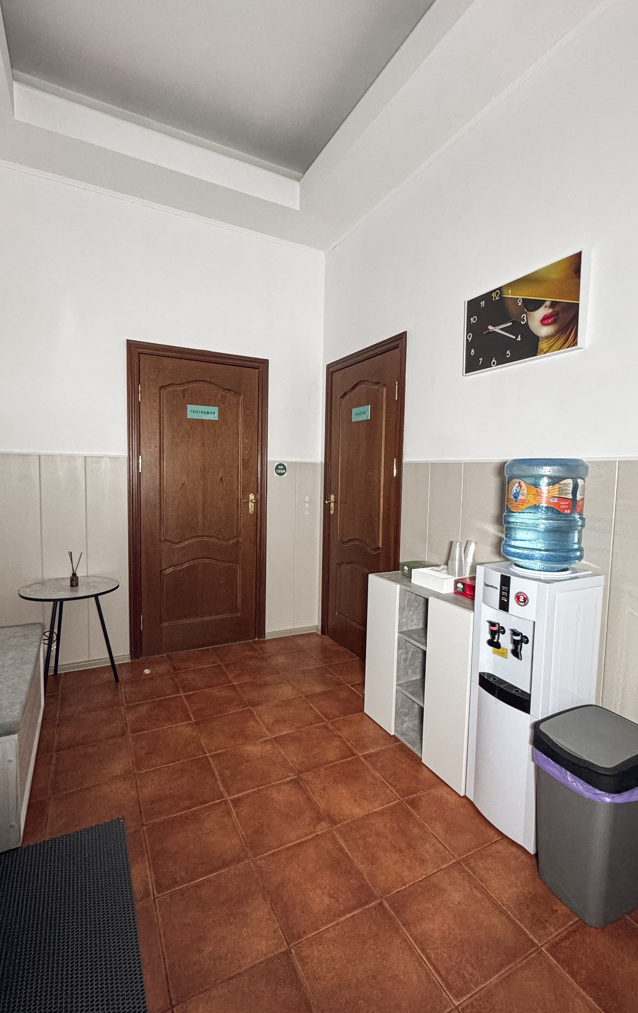- Куллер с холодной и горячей водой, чай - Зона ожидания для гостей с мягким диваном - Штатив для телефона с держателем - Световая лампа на штативе для красивых фотографий - Большое зеркало с лампочками