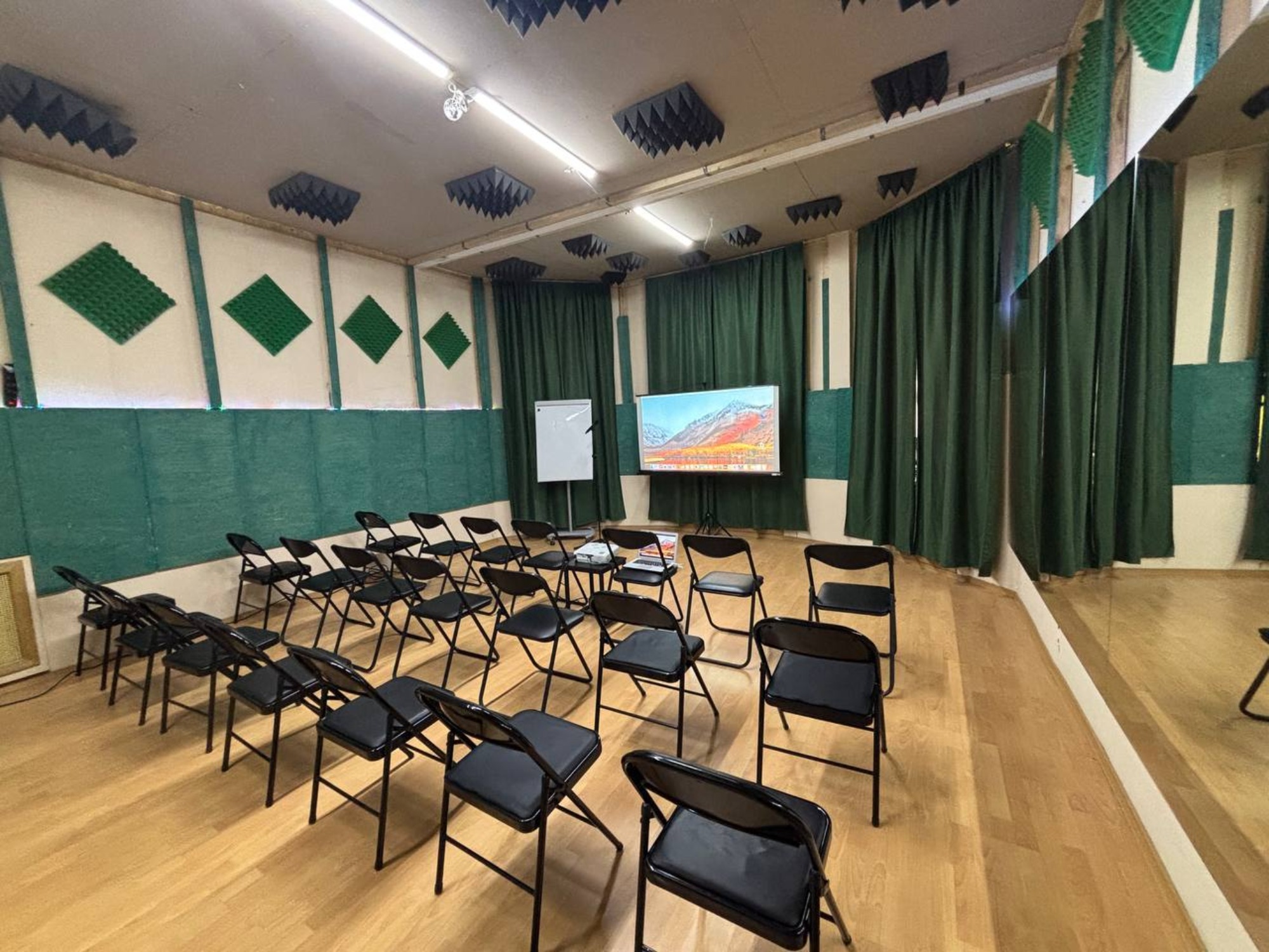 О площадке Зал для мероприятий ЛАЙВ, он же - танцевальный зал BLUES. - ПЕРВЫЙ ЭТАЖ С ОКНАМИ; - потолок 3,5м; - зеркало во всю стену (6 и 7,5м); В наличии стулья в нужном количестве, TV панель/экран/проектор