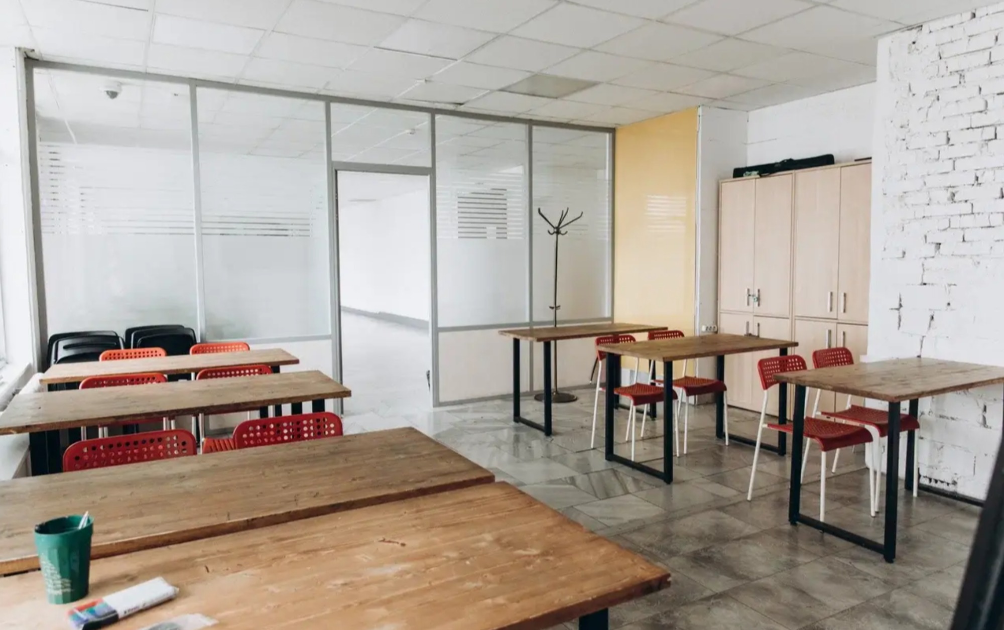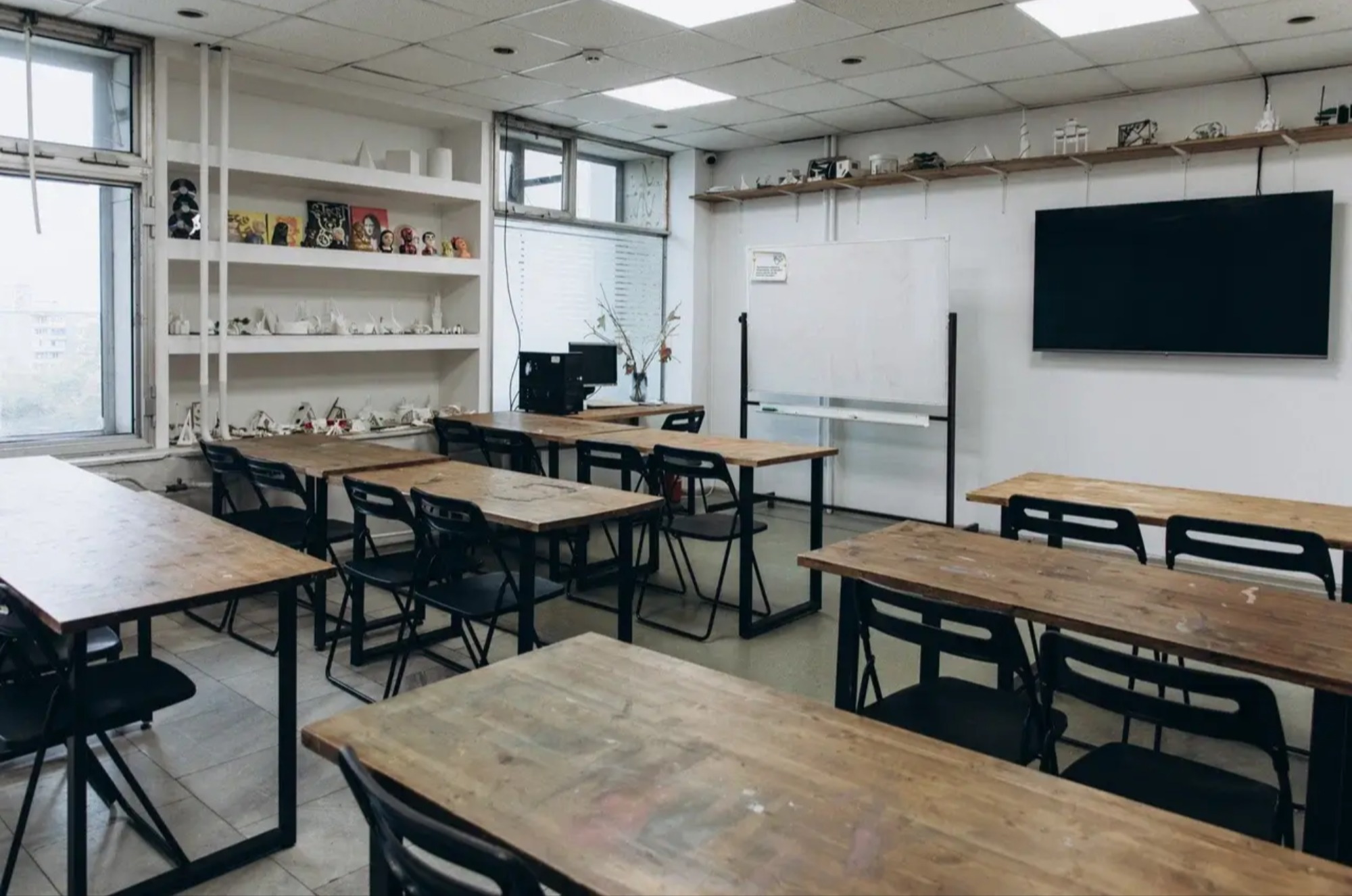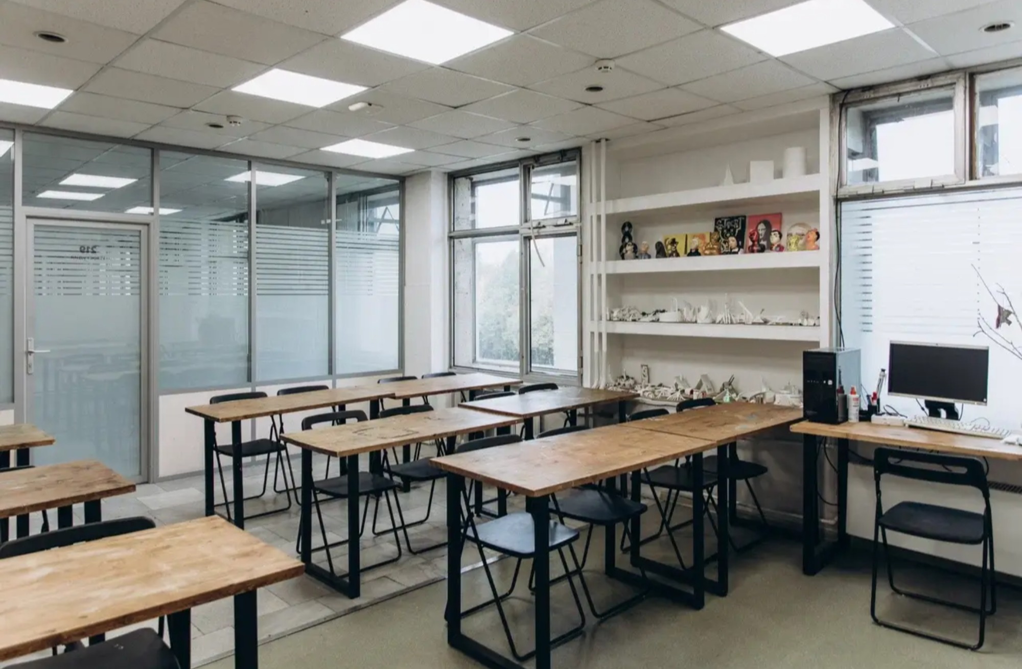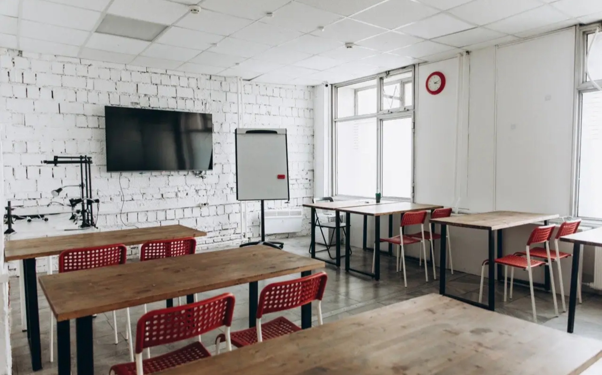 Оборудование: - 9 столов 120х60 см - 18 стульев - Плазма 65 дюймов, компьютер - Маркерная доска - Туалет рядом