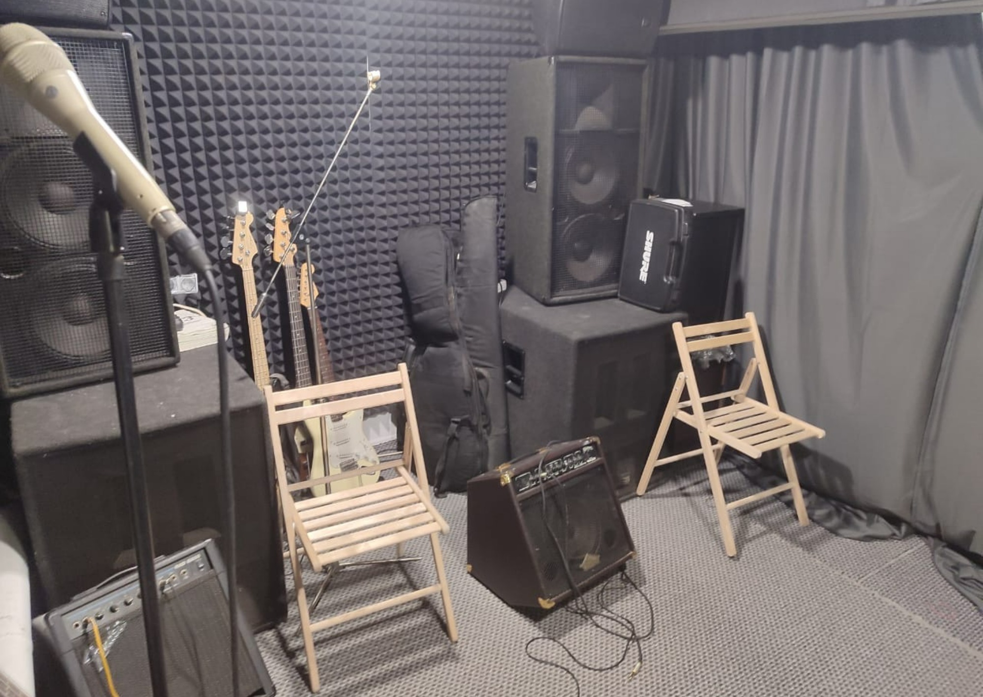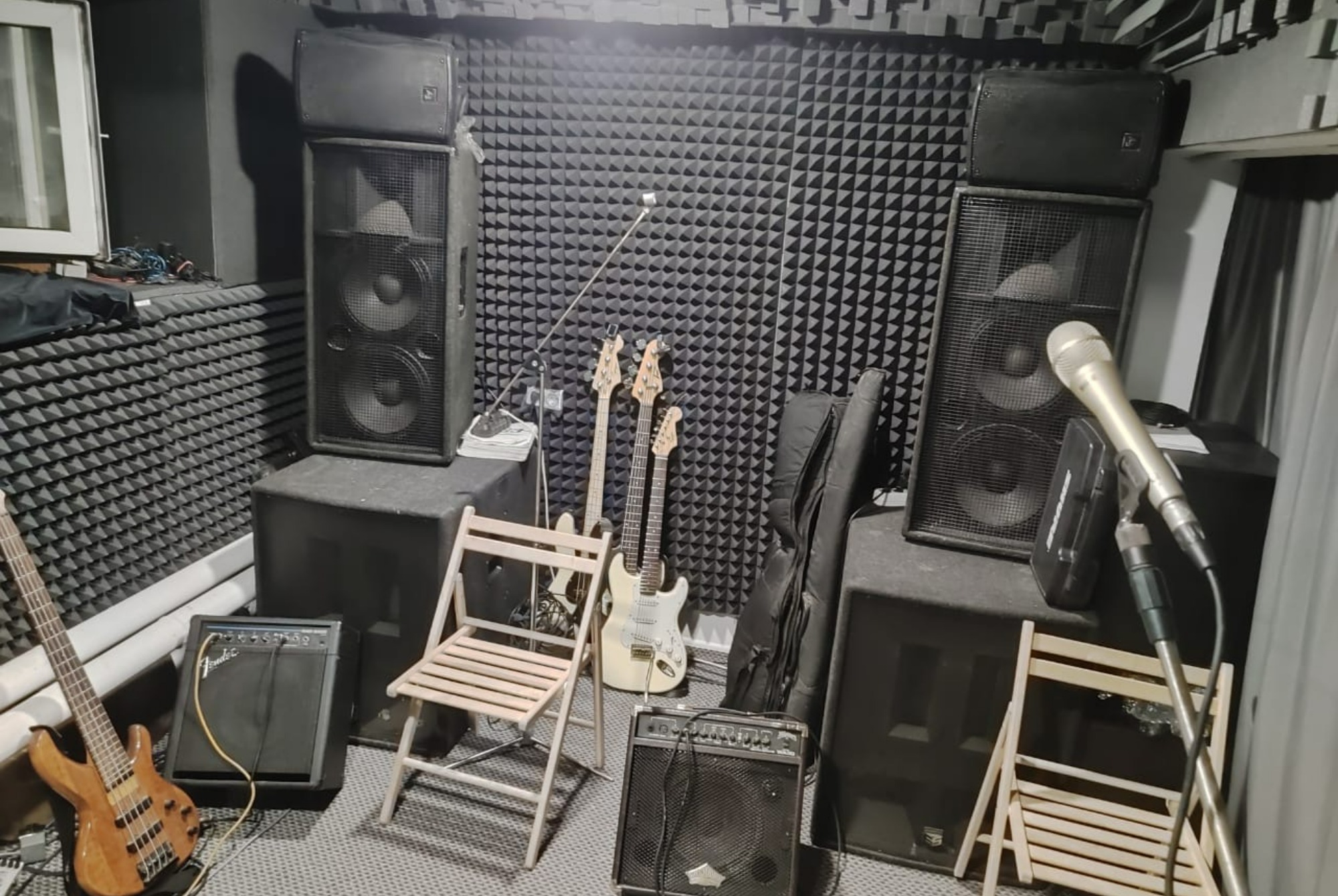В студии имеется все необходимое для полноценной репетиции: – ударная установка – гитары и другие струнные инструменты – микрофоны – усиление для вокала и инструментов – стойки, пюпитры и прочее сопутствующее оборудование -стулья