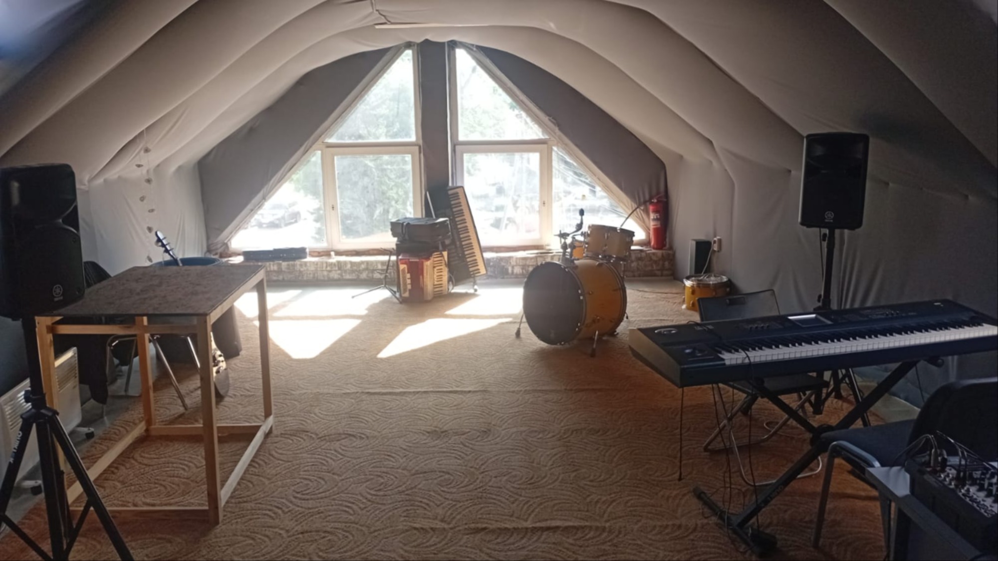 Оснащение: - Современные акустические системы и микшерные пульты; - Проводные и беспроводные микрофоны; - Клавишные инструменты, гитары (акустические, электрические, бас), комбо-усилители; - Дополнительные инструменты: укулеле, скрипка, саксофон, баяны, аккордеоны, гармонь, балалайка.