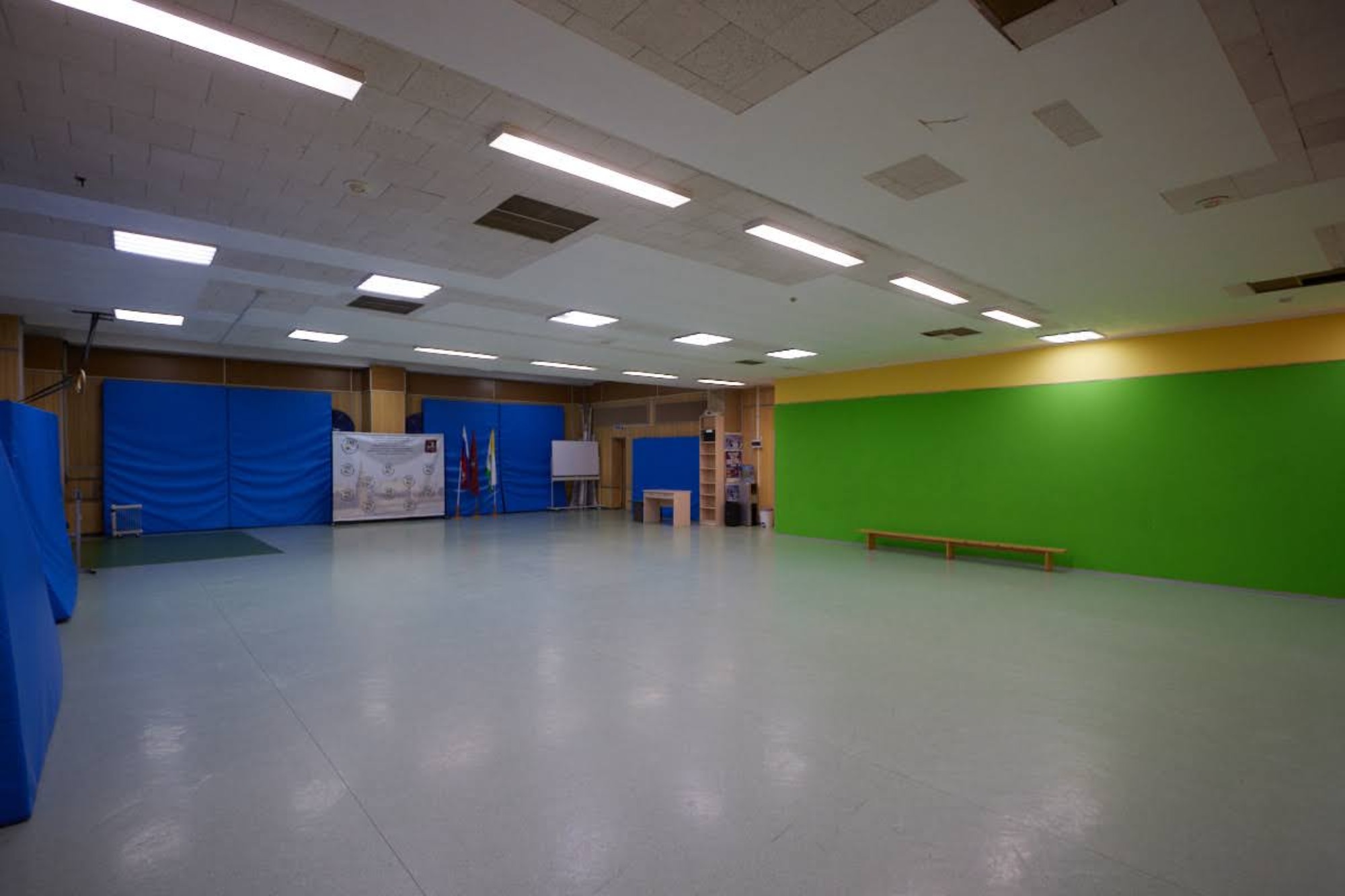 - Светлая - Размеры: 10м х 22,5м х 3м - На 1/4 зала потолок 4 метра - Линолеум - Окна - Раздевалка - Муз. центр с bluetooth - Станки Оборудование Гантели Коврики Муз.центр с bluetooth Маты Хореографические станки