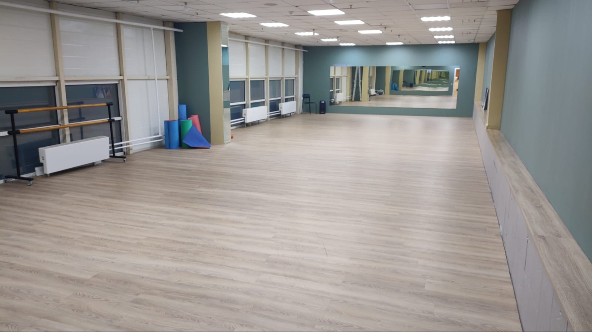 Пол покрыт ламинированным покрытием, обеспечивающим комфорт и устойчивость при выполнении различных упражнений. По стене расположены зеркала, которые помогают контролировать технику движений и корректировать постановку тела во время тренировки.