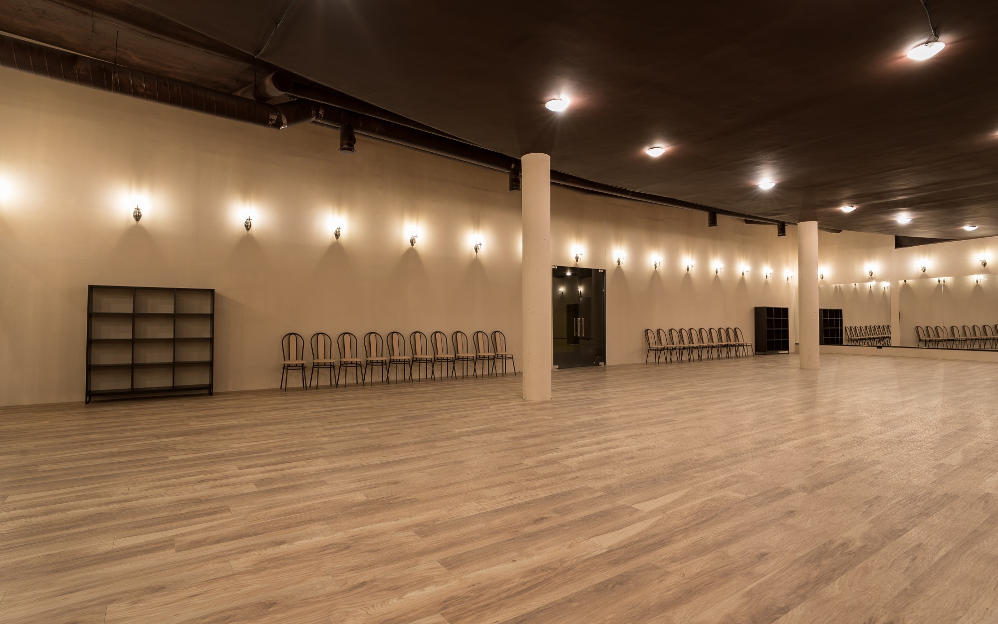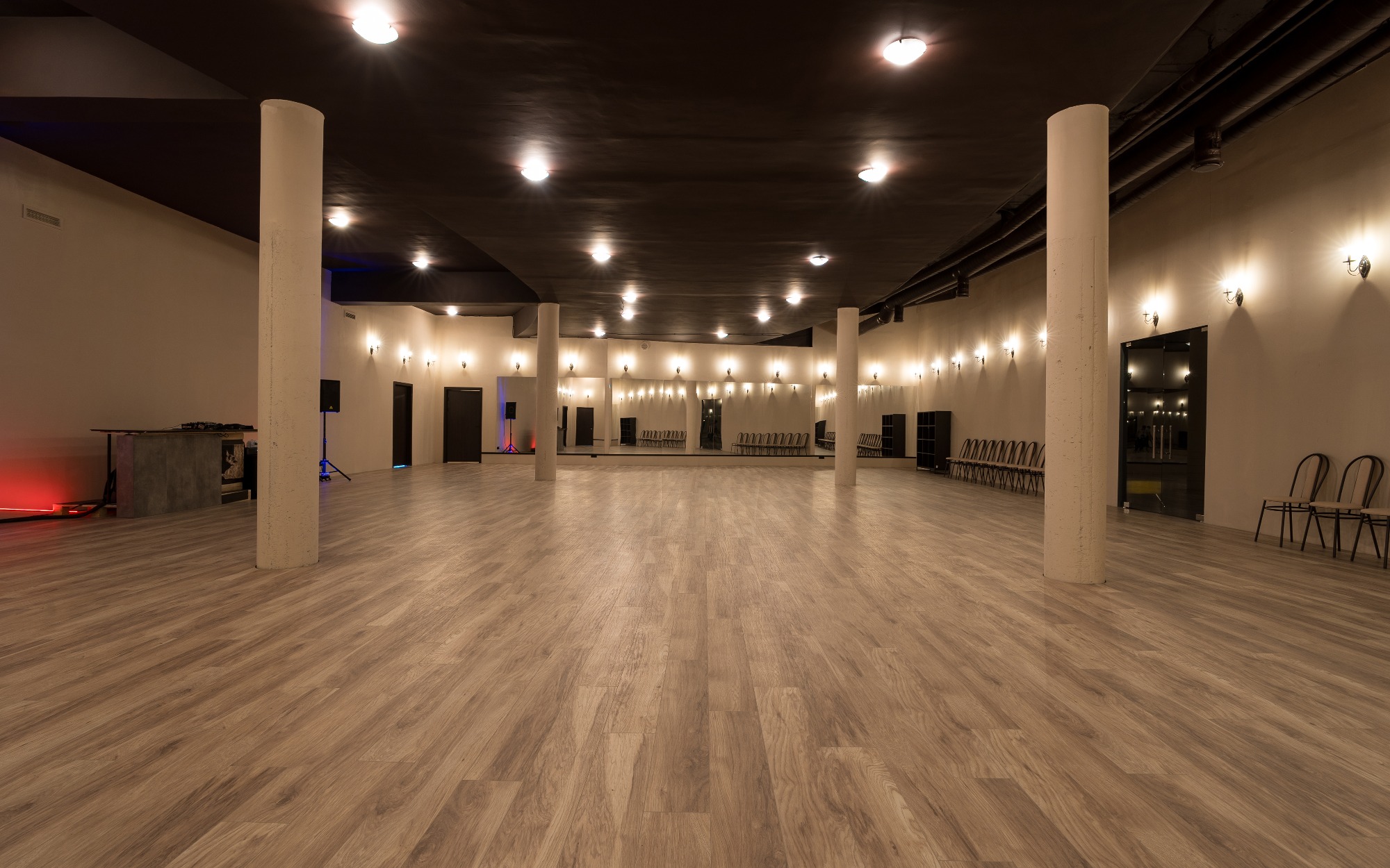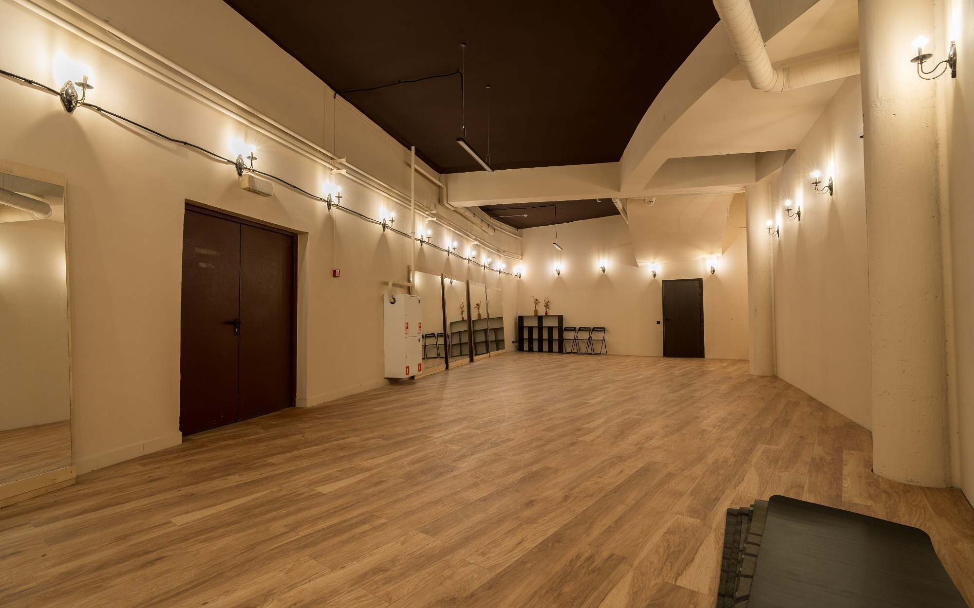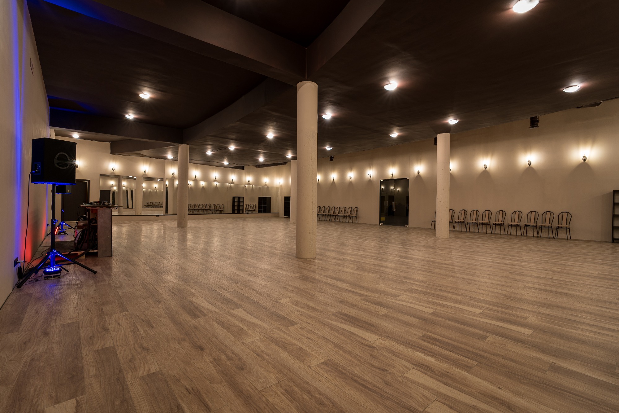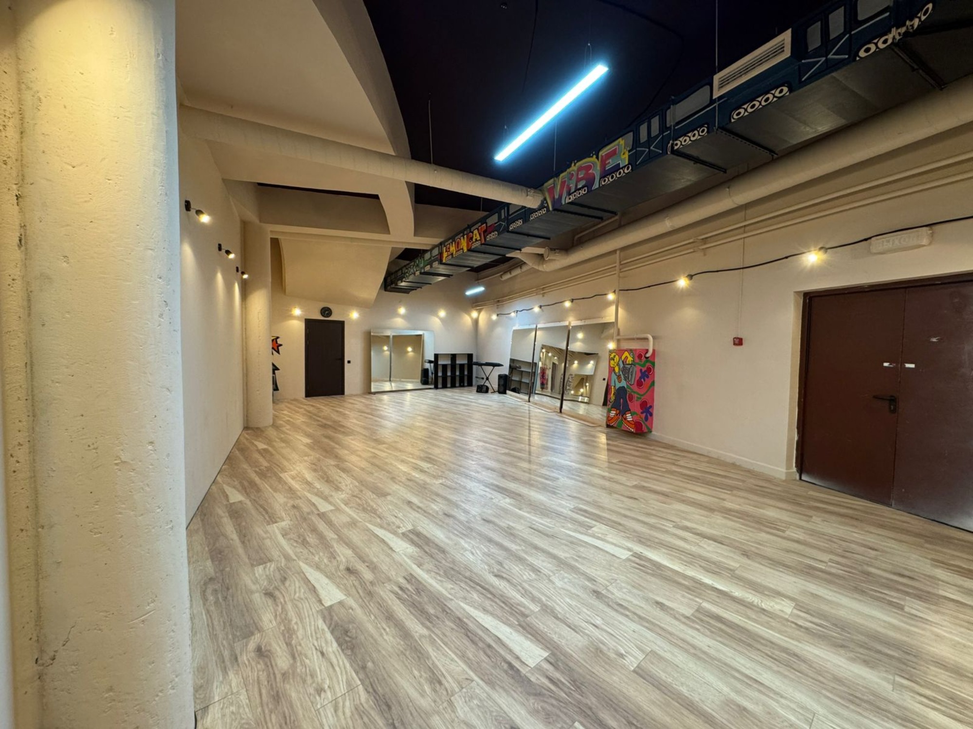О площадке Просторный зал площадью 300 м² — идеальное место для танцев и мероприятий. Вместимость до 250 человек позволяет проводить как индивидуальные, так и крупные групповые занятия. Бежевая цветовая гамма интерьера создает универсальную базу, которую легко адаптировать под ваши нужды.
