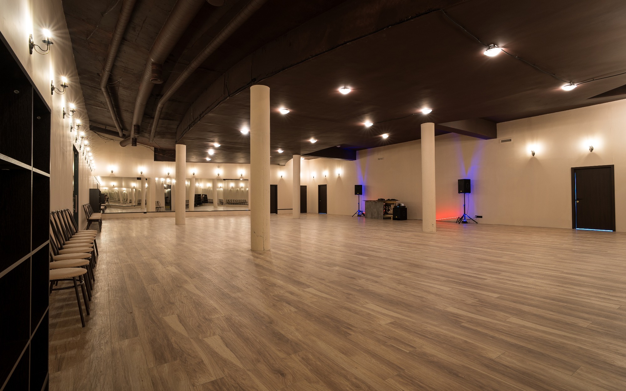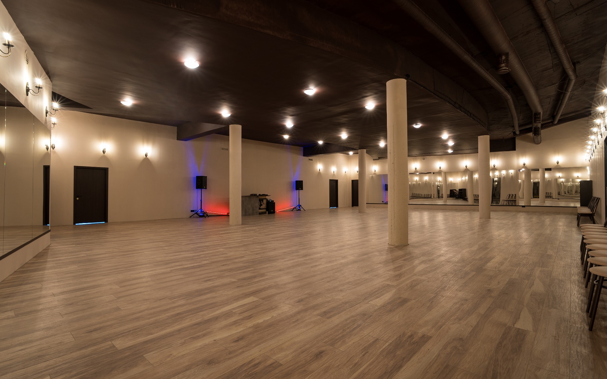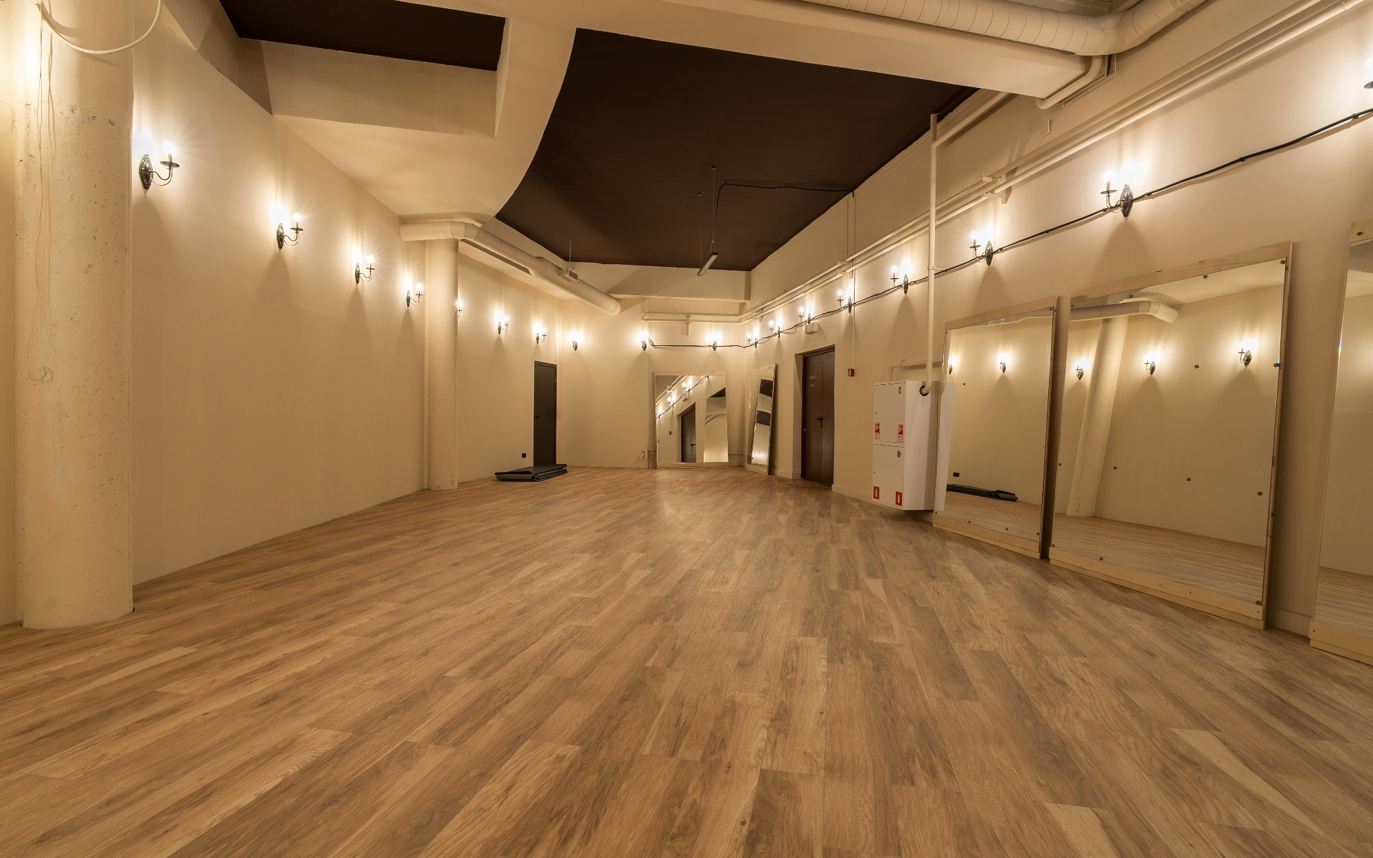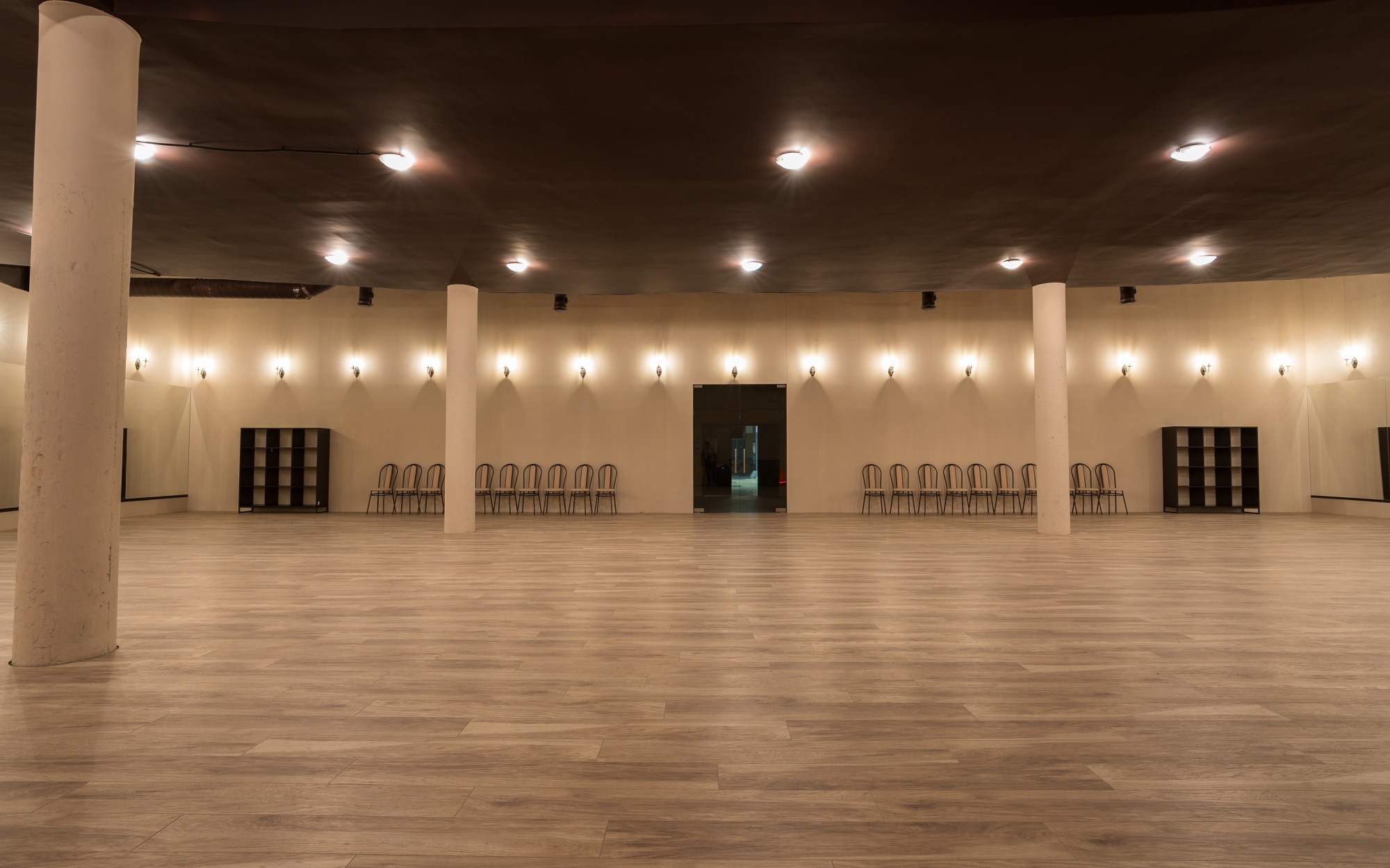 О площадке Просторный зал площадью 300 м² — идеальное место для танцев и мероприятий. Вместимость до 250 человек позволяет проводить как индивидуальные, так и крупные групповые занятия. Бежевая цветовая гамма интерьера создает универсальную базу, которую легко адаптировать под ваши нужды.