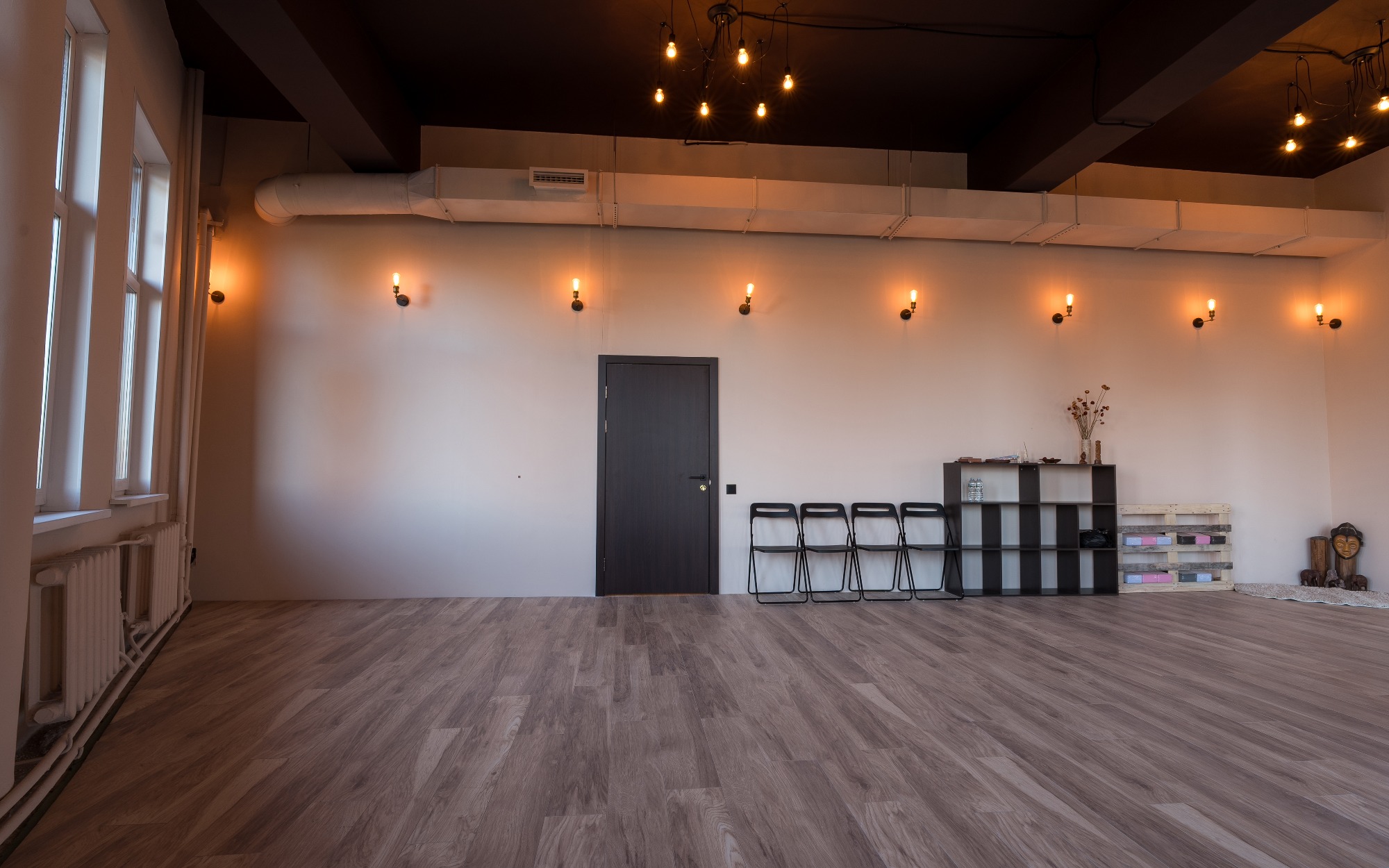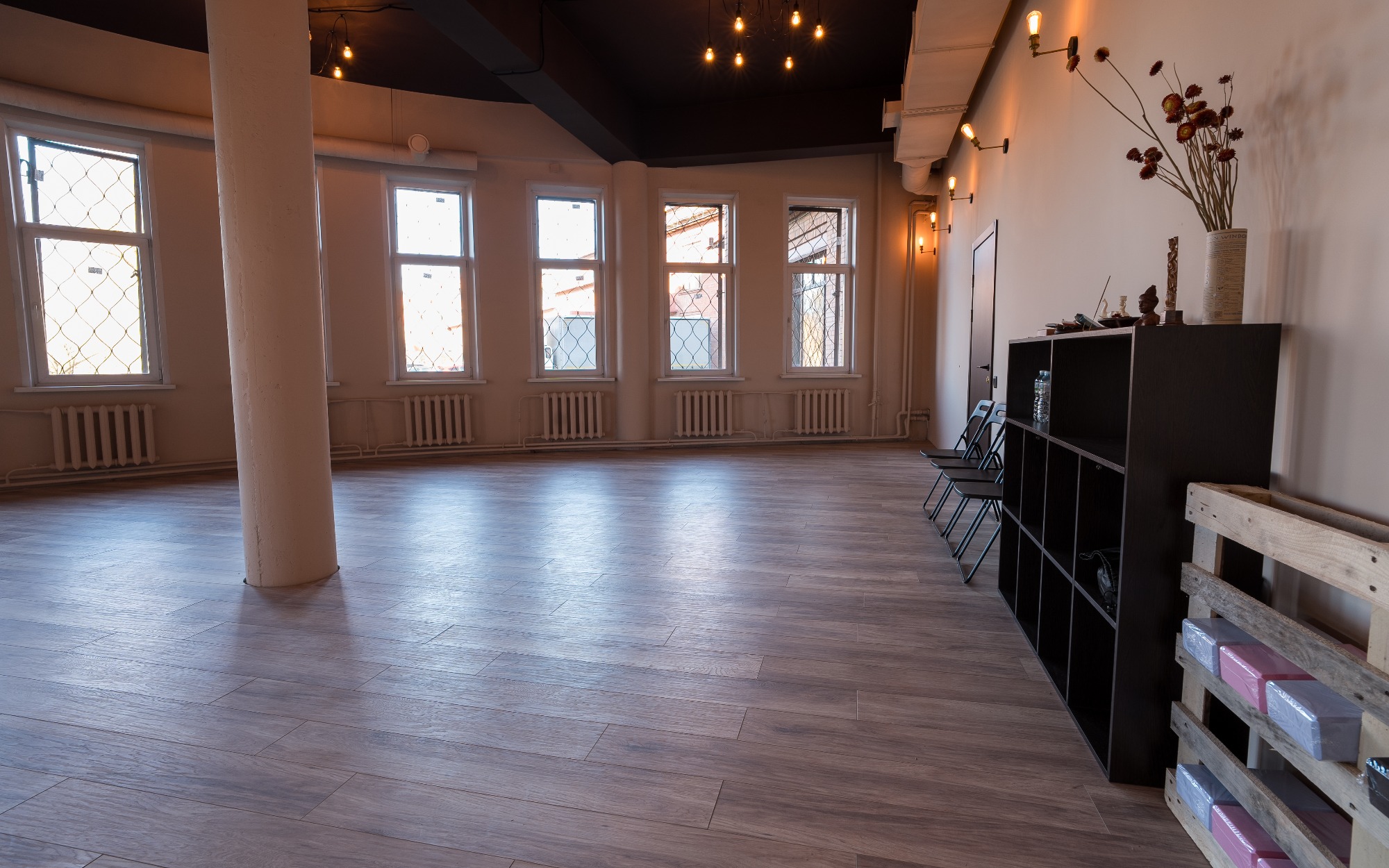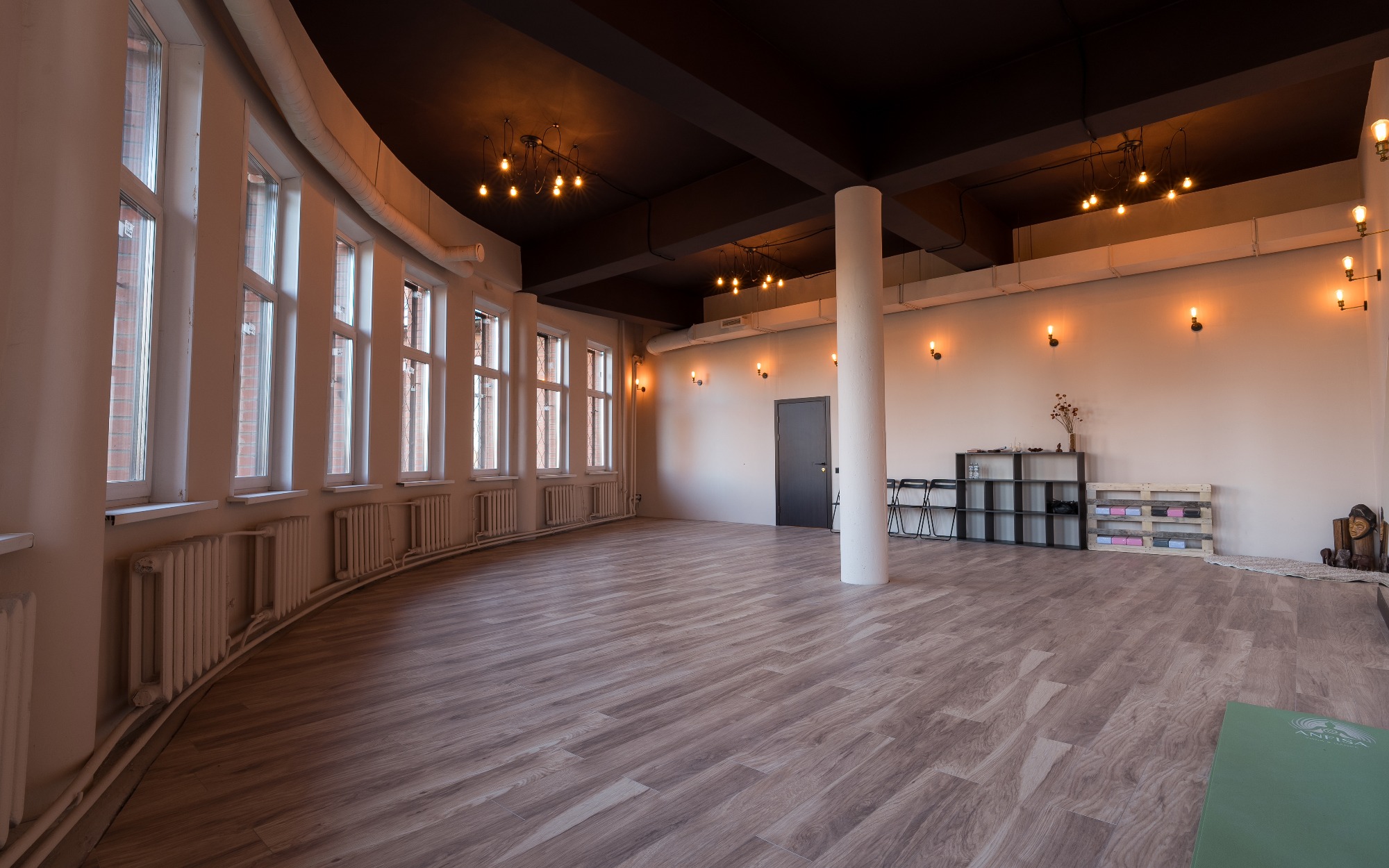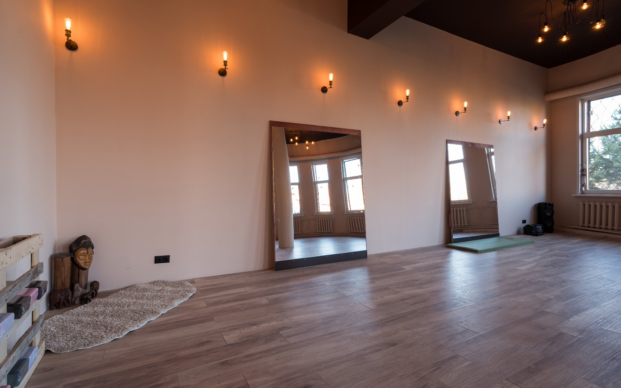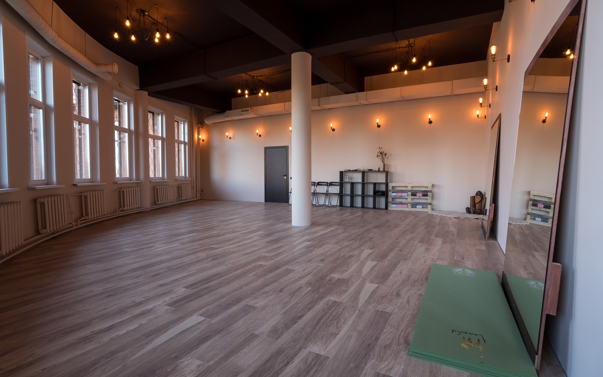 Зал подходит для: - Танцевальных и медитативных практик; - Индивидуальных и групповых занятий; - Проведения тренингов и мастер-классов, связанных с движением и телесными практиками. "Йога" — это место, где природа и комфорт помогают раскрыть внутренний потенциал, вдохновляя на новые достижения. Оборудование Передвижные зеркала Коврики Муз.центр с bluetooth Хореографические станки