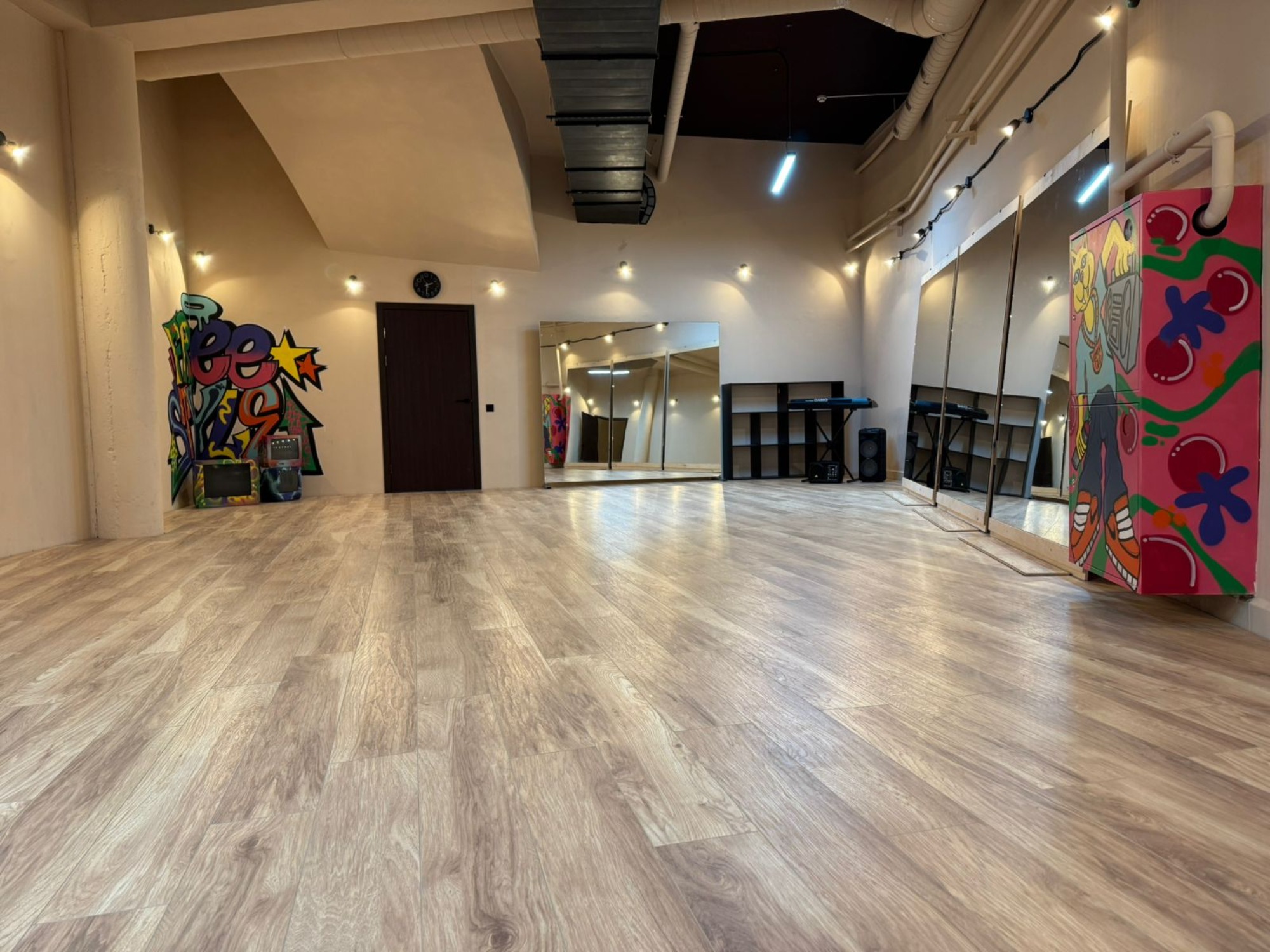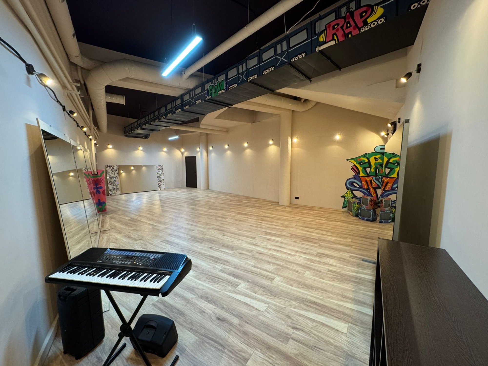 Зал подходит для: - Любых танцевальных практик, включая стритдэнс и хип-хоп; - Индивидуальных и групповых тренировок; - Проведения танцевальных мастер-классов и репетиций. "Хип-хоп" — это динамичное пространство для занятий, которое сочетает стиль, функциональность и атмосферу уличной культуры. Оборудование Коврики Муз.центр с bluetooth