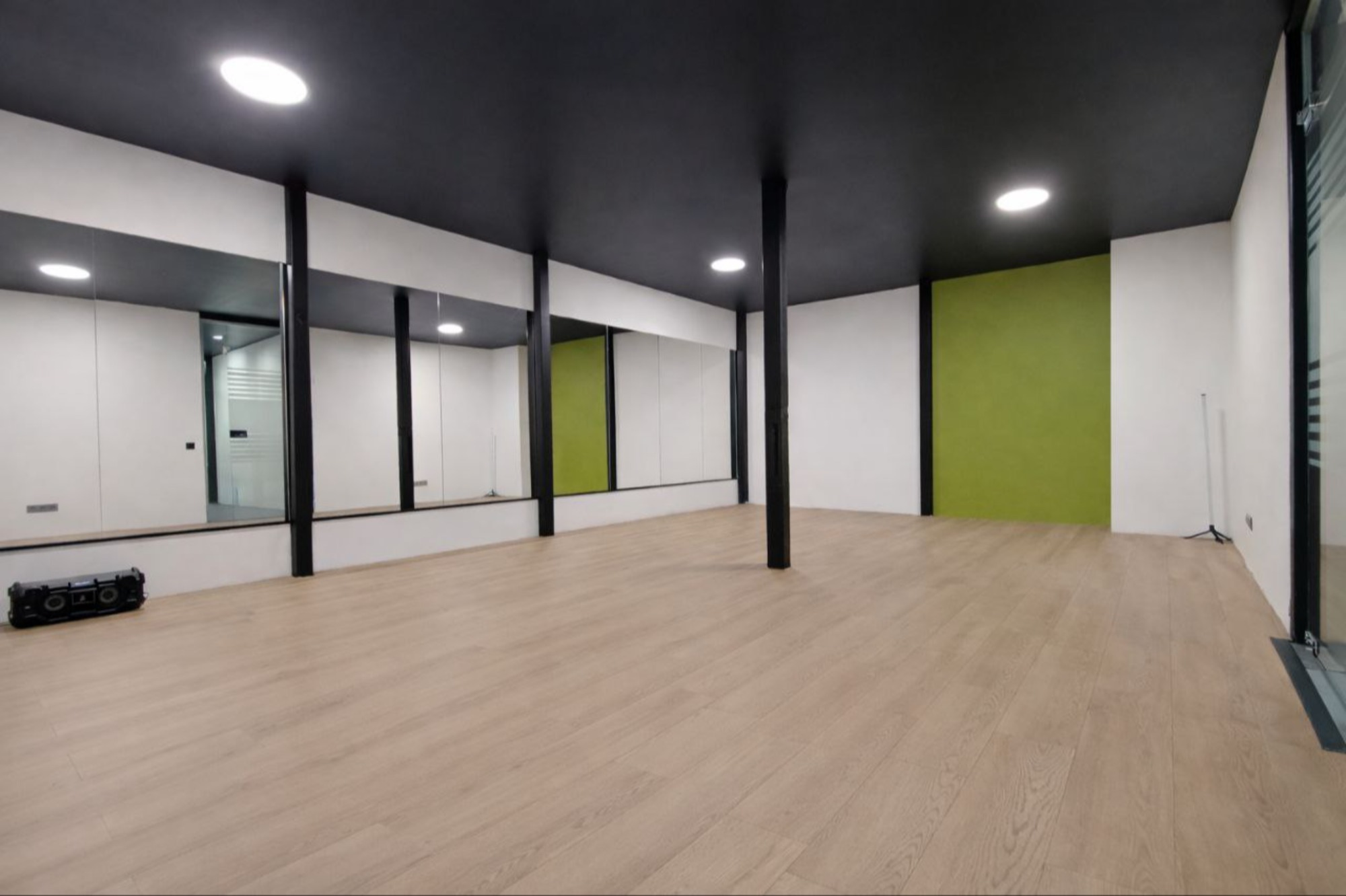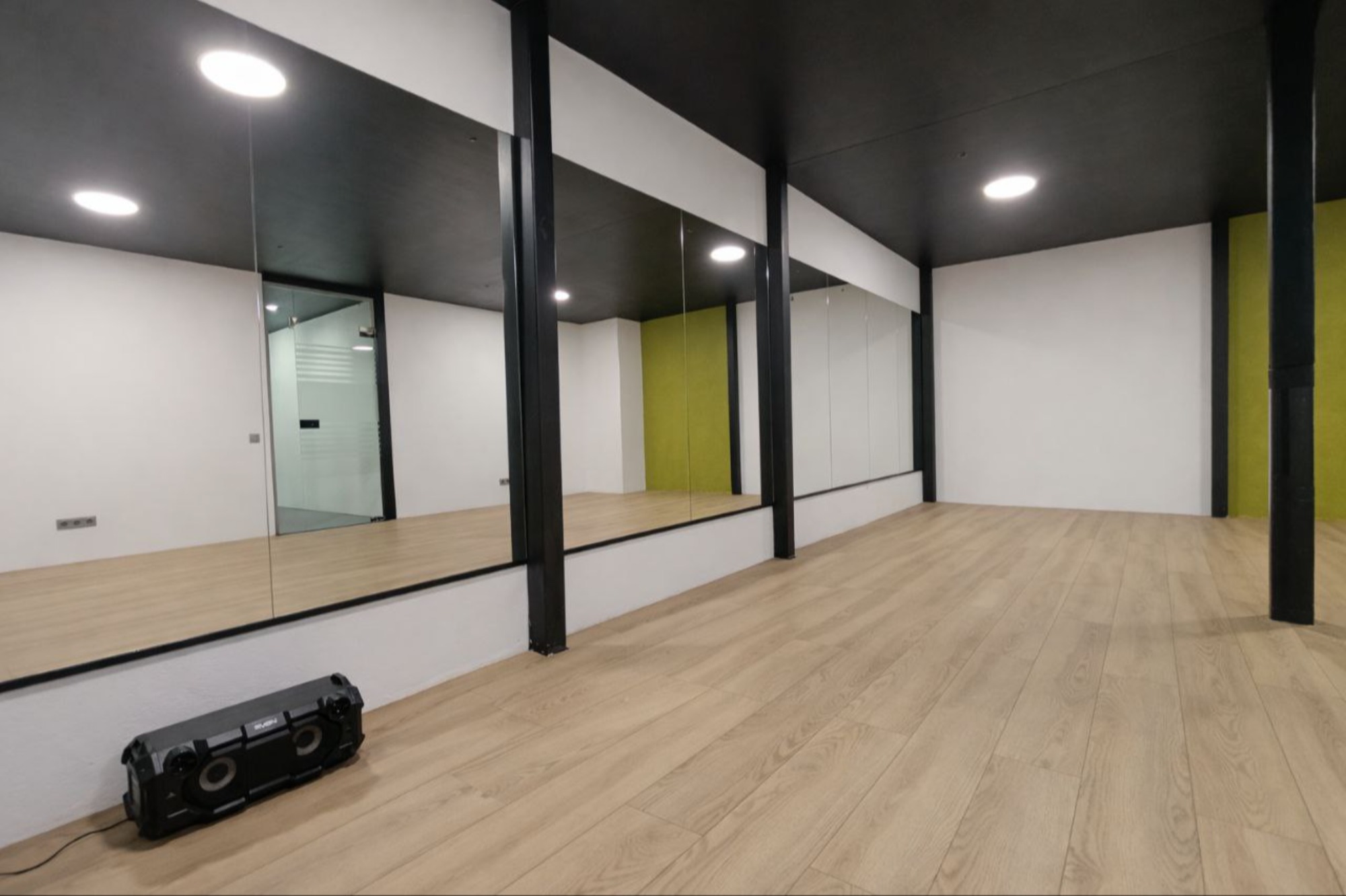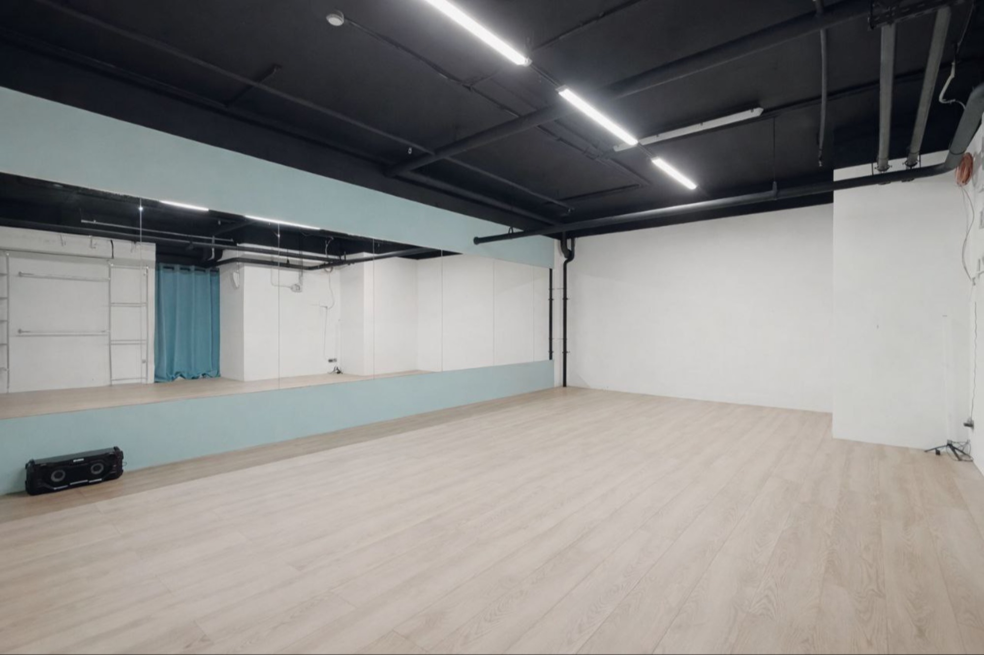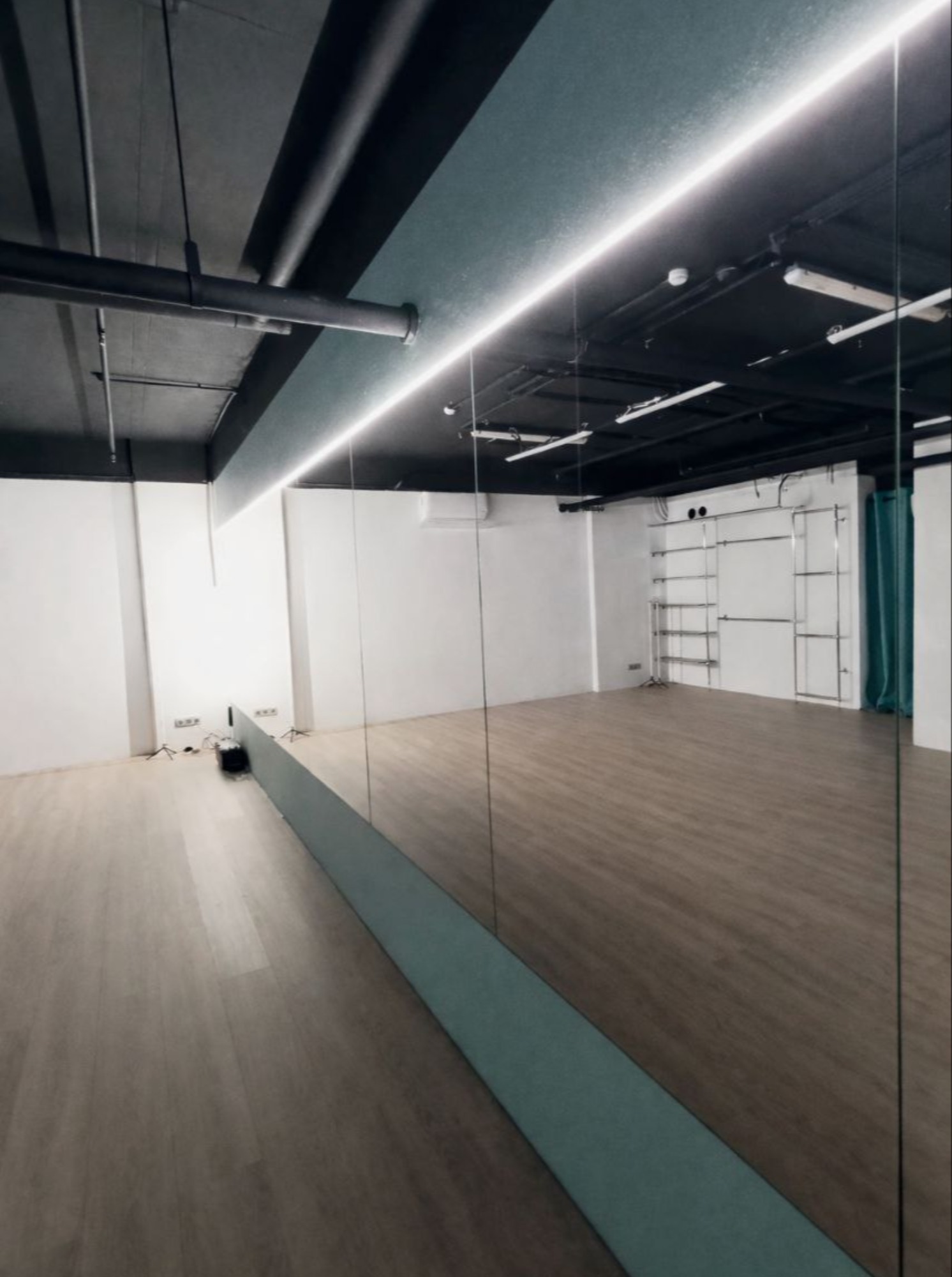 * зеркала в полный рост — удобно отрабатывать технику и связки * напольное покрытие: ламинат — ровная чистая поверхность для занятий * Bluetooth-колонка JBL — быстрое подключение телефона и стабильный звук * вентиляция / комфортный микроклимат — заниматься приятно в любое время года * раздевалки со скамейками — удобно переодеться до/после тренировки * санузел и душ * Wi-Fi * инвентарь зала (стойки/подставки и др.) — при бережном использовании Интерьер Дополнительная подсветка интерьера Не подвал Покрытие ламинат