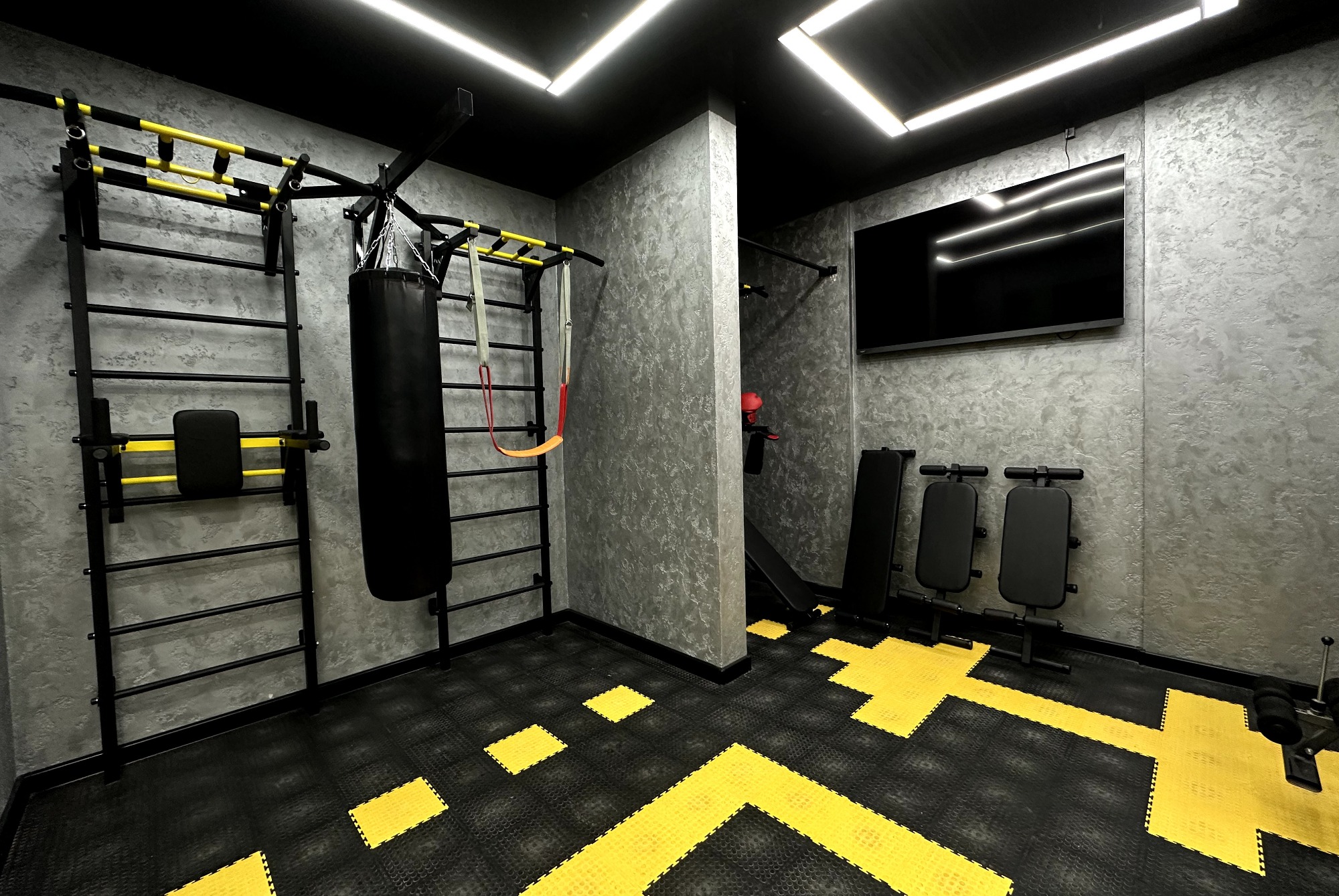 О площадке В зале вам доступно: - колонка с возможностью подключение через bluetooth - коврики - фитболы - раздевалка - дополнительная подсветка интерьера