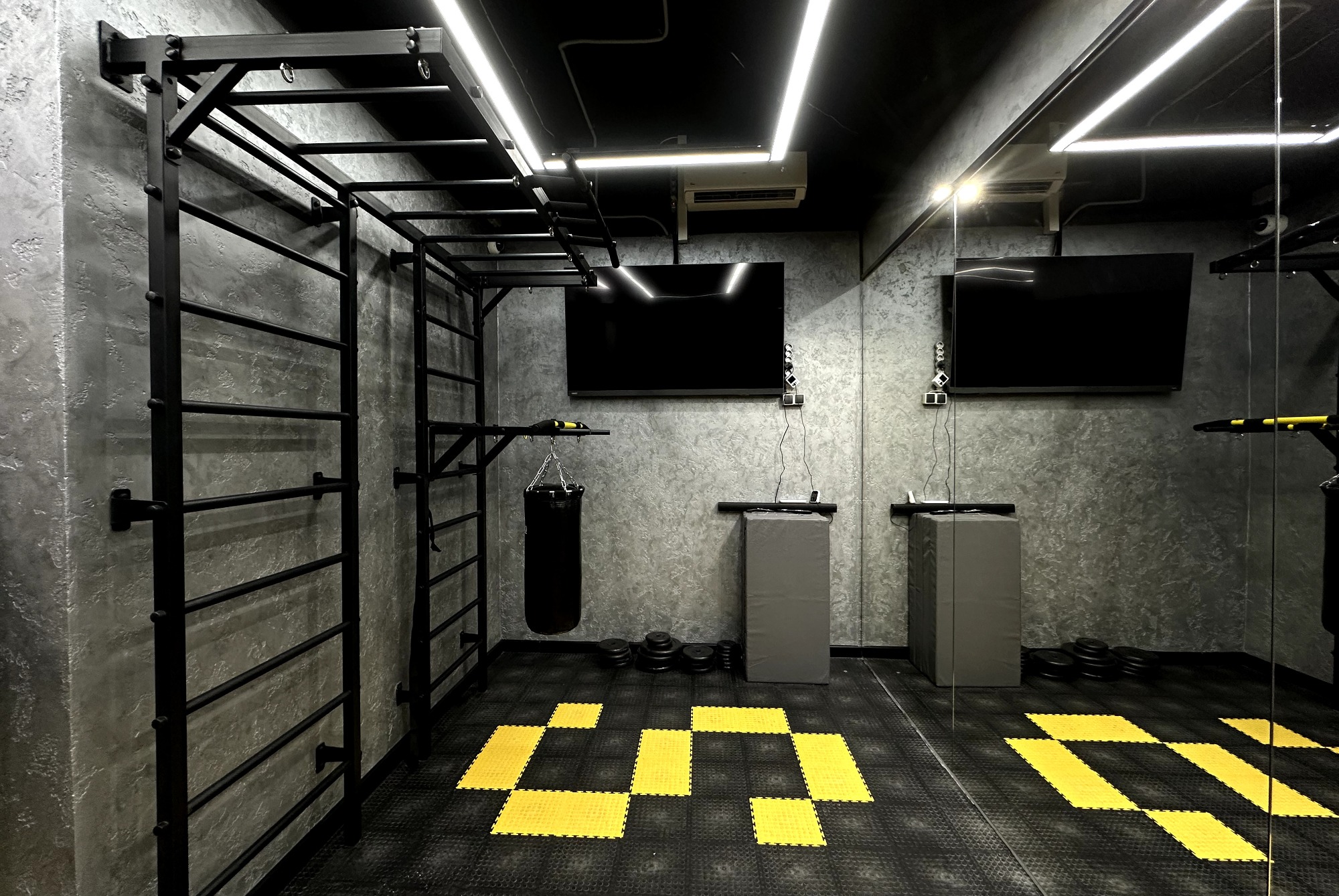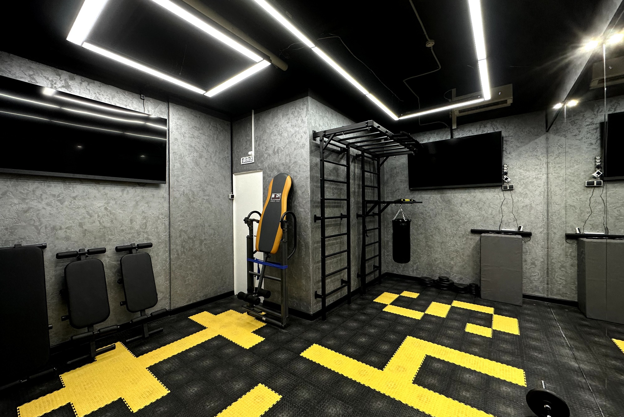 В залах вам доступно: - колонка с возможностью подключения через Bluetooth - коврики - гантели - фит-боллы - кубики - дополнительная подсветка интерьера - зеркала - раздевалка