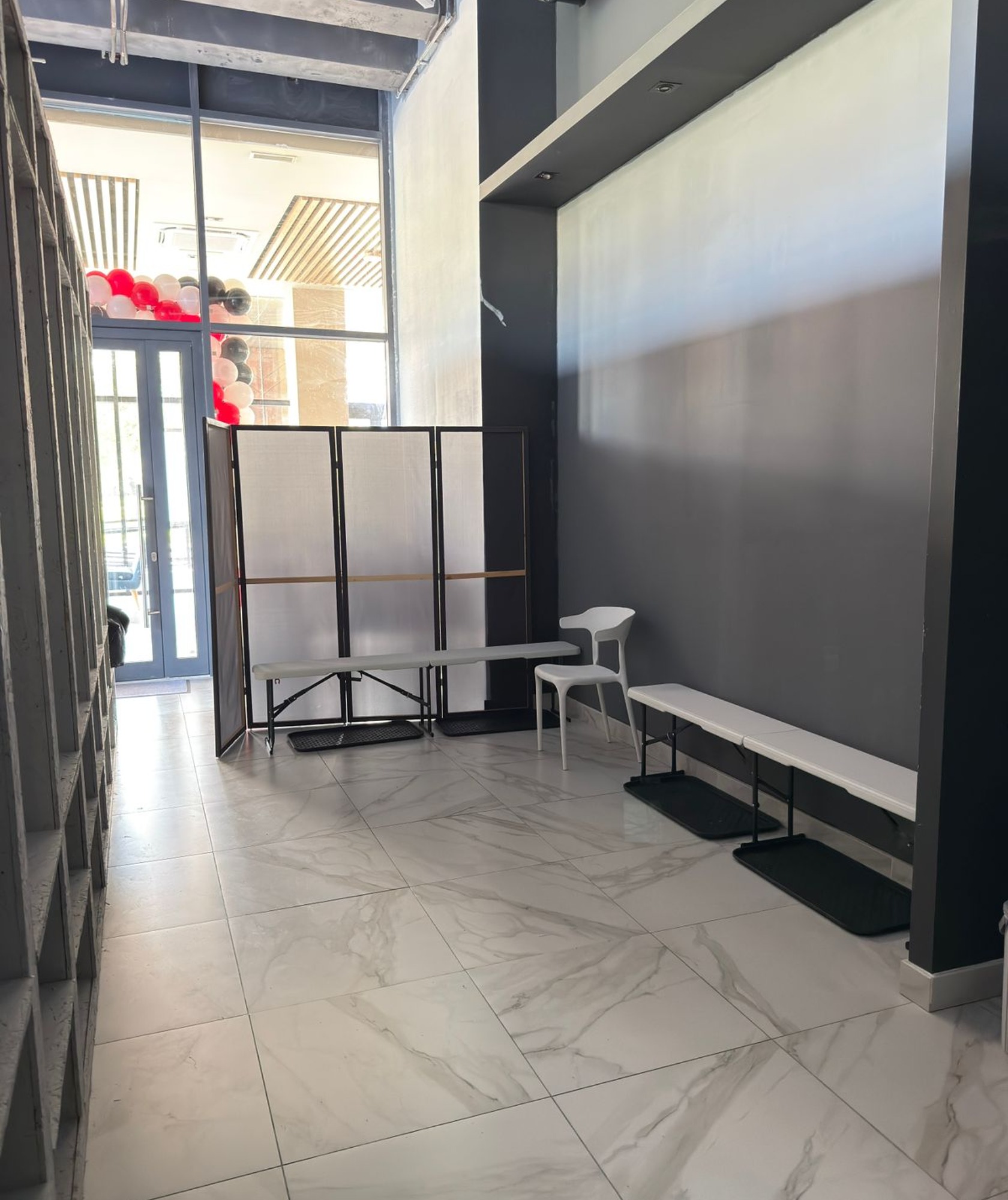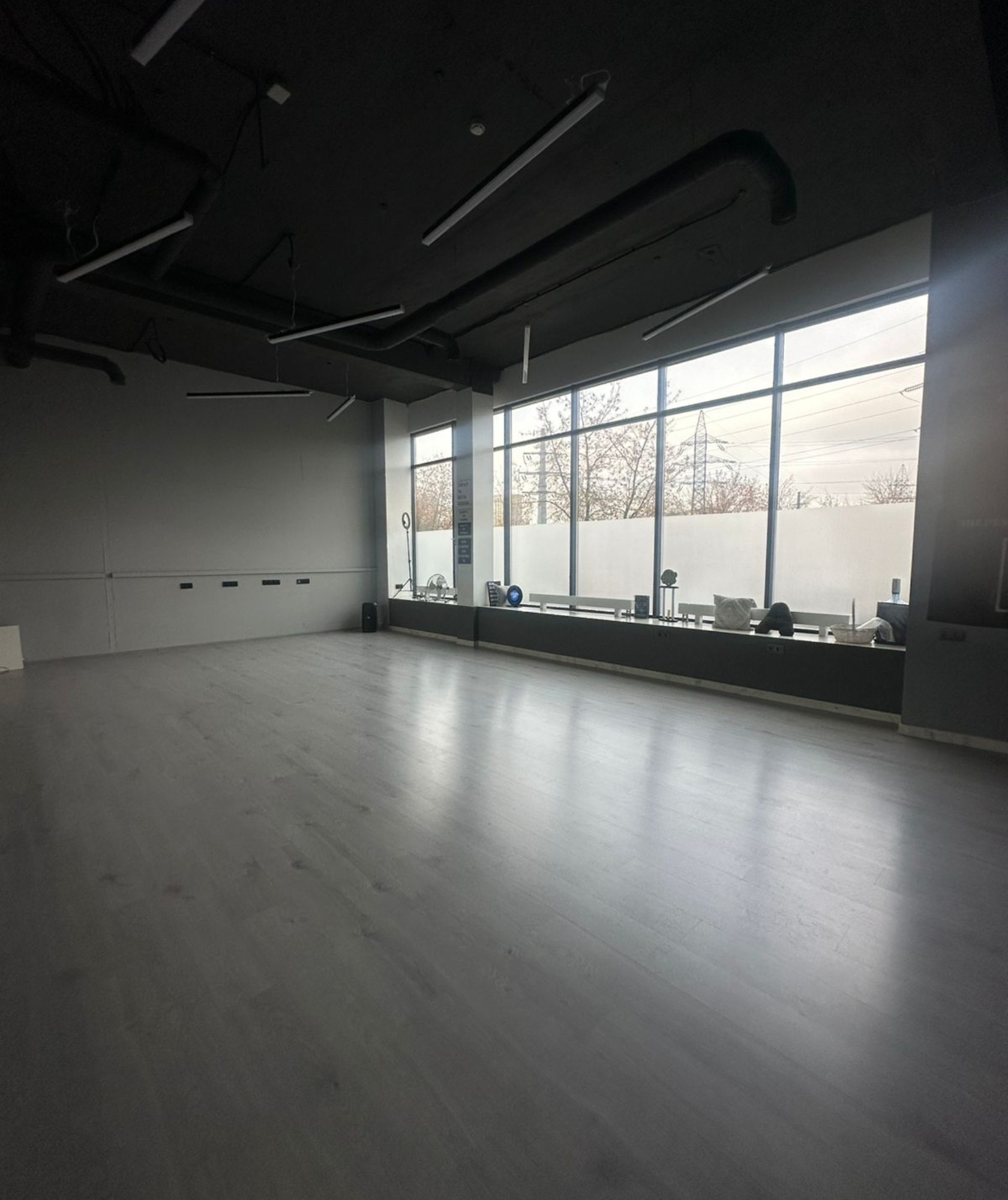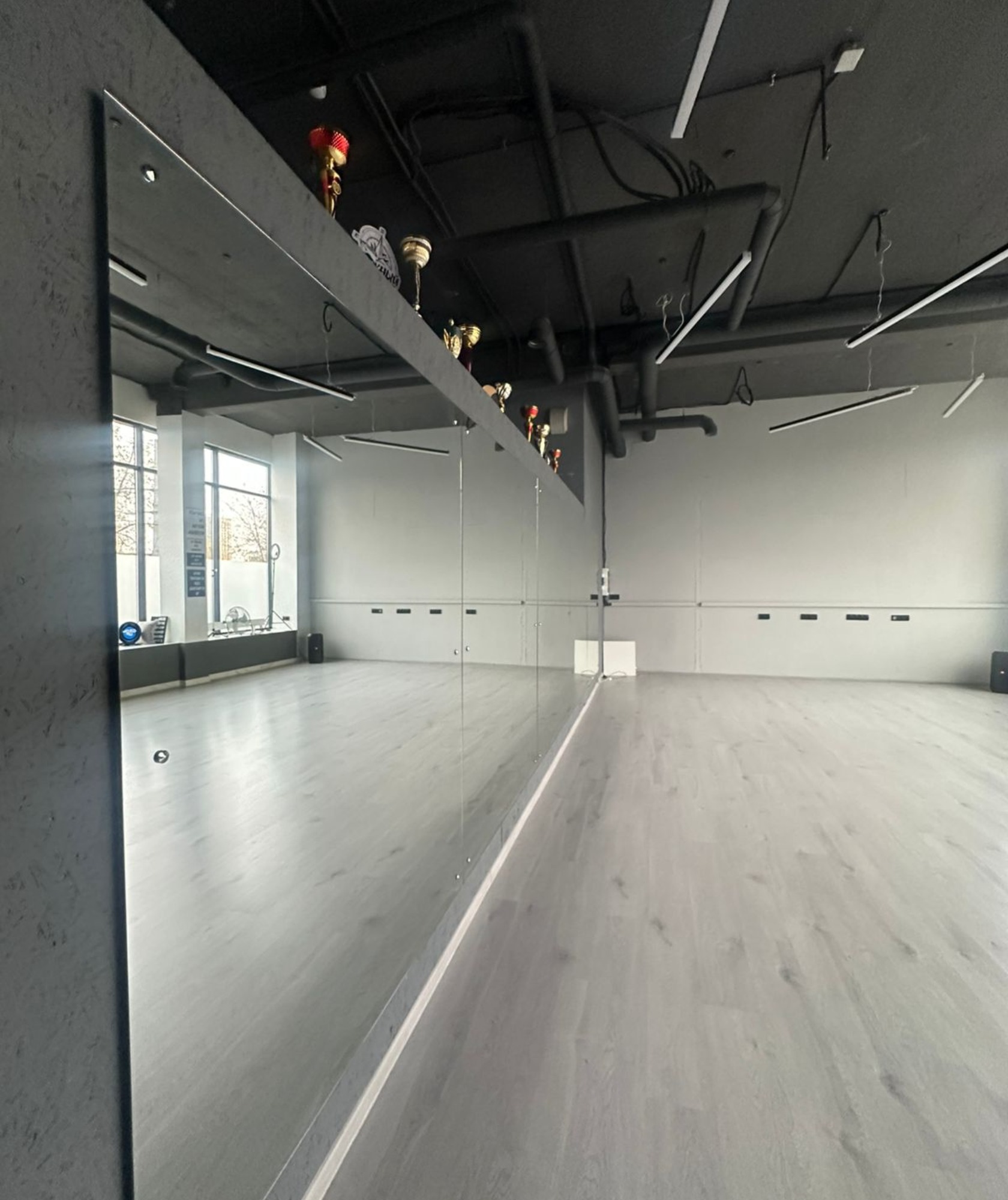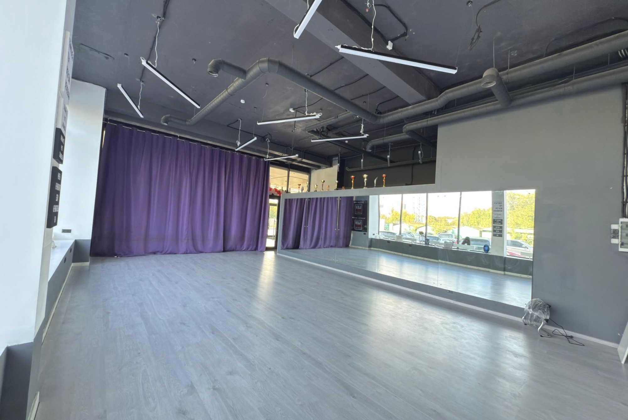 В зале есть всё необходимое: • Удобная раздевалка • Мощная колонка JBL • Большие зеркала для отработки движений • Атмосферная неоновая подсветка • Штатив для съёмки контента • Вентилятор для комфортных занятий • Панорамные окна с естественным светом • Уютная стойка ресепшн