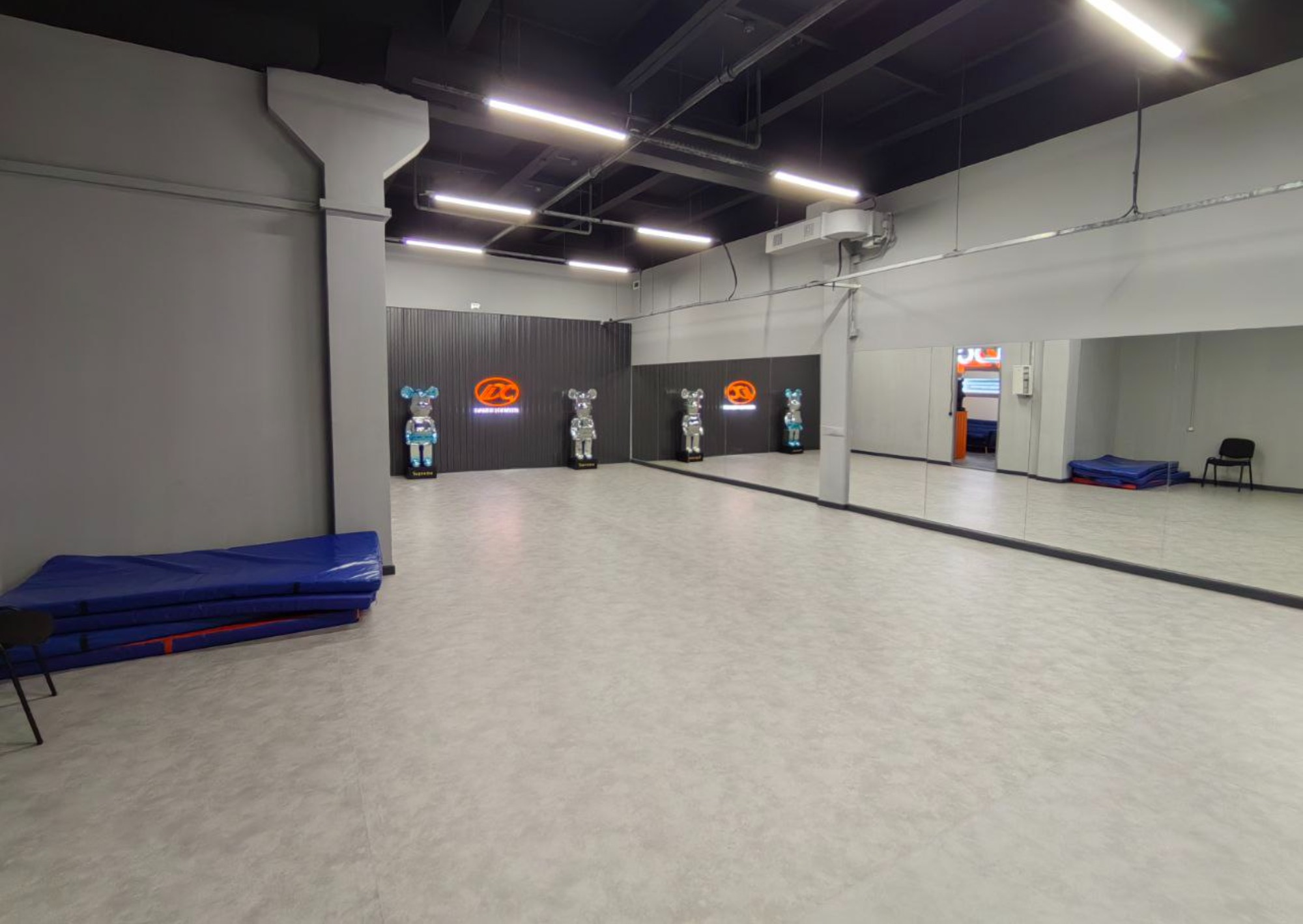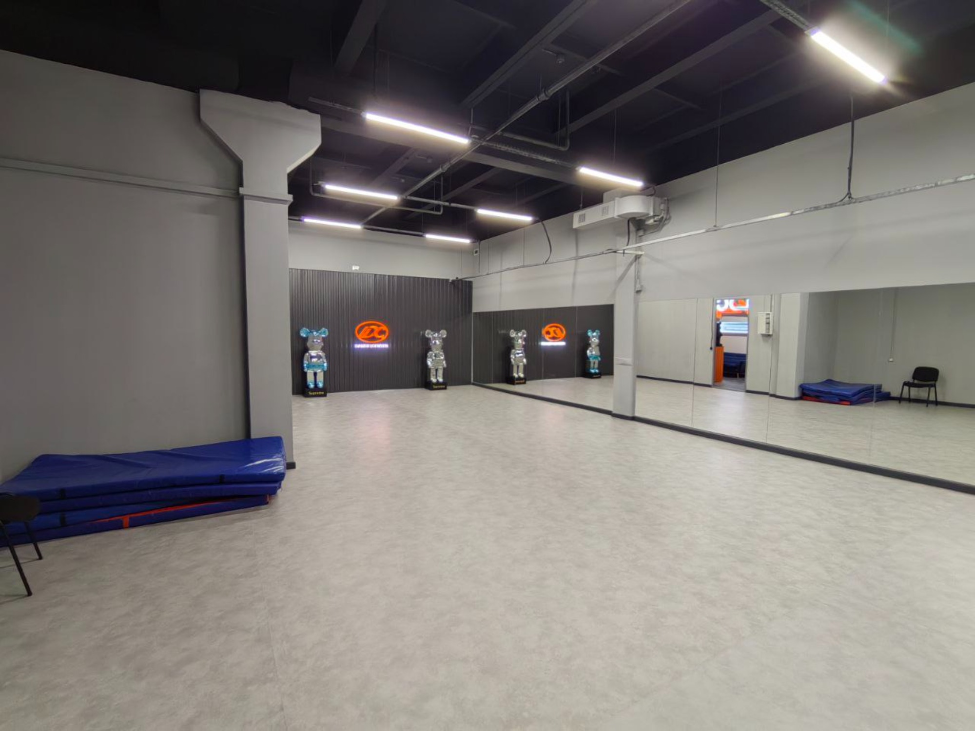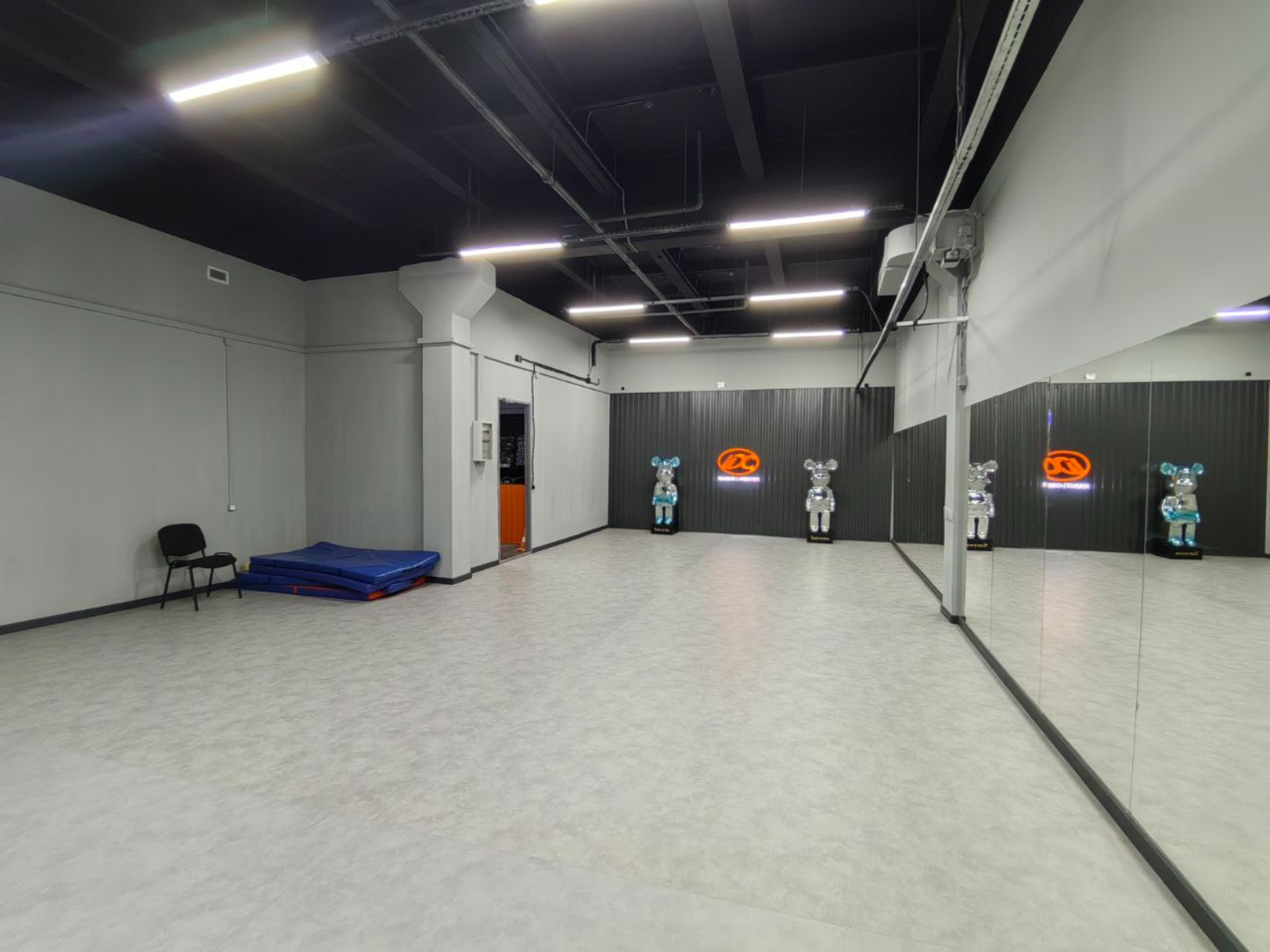 Залы идеально подходят для танцевальных и фитнес занятий. Стильная лаунж зона с приставкой, женские и мужские раздевалки, а также наличие холодных напитков обеспечат комфортное пребывание и отличные условия для всех посетителей. Оборудование Коврики Муз.центр с bluetooth