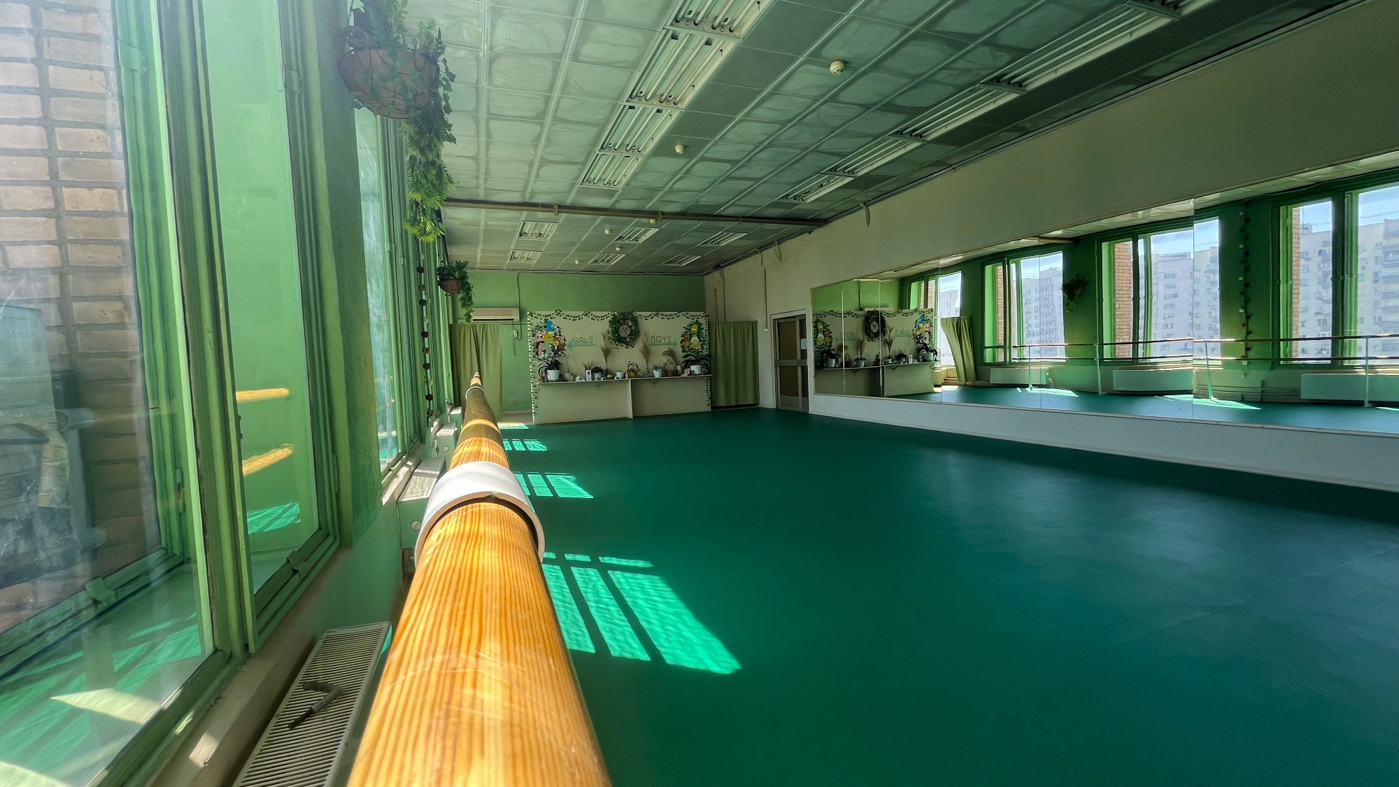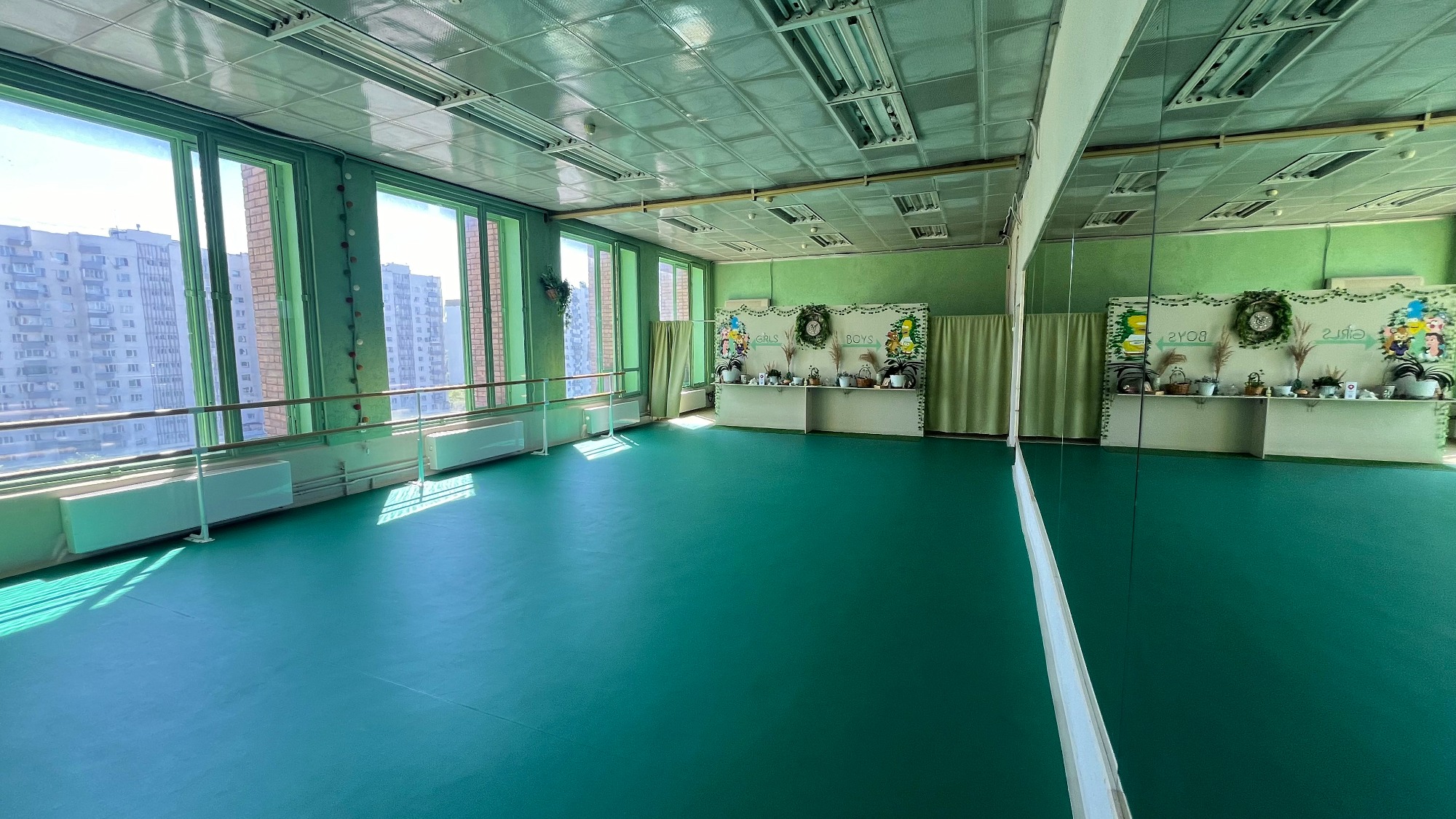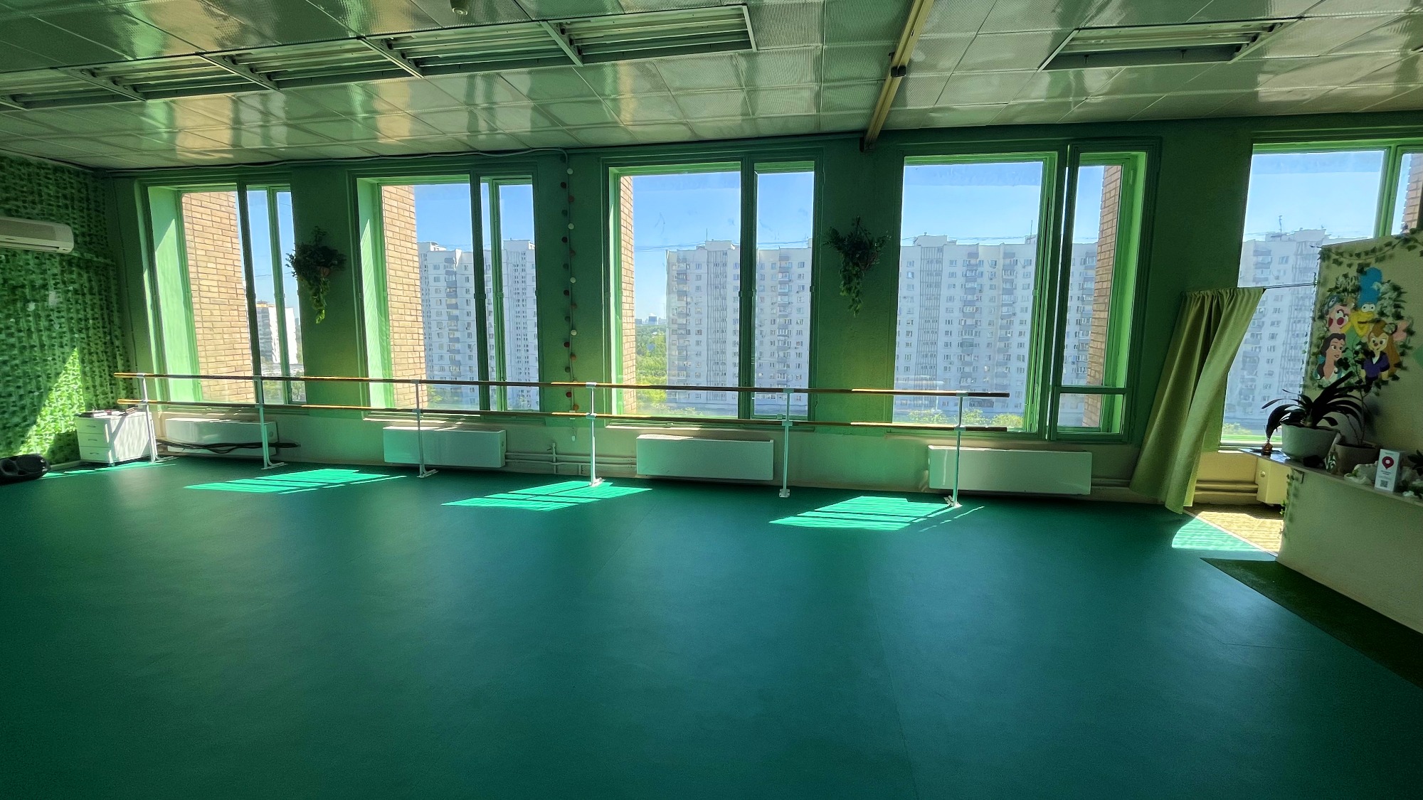 В Зале большое окно 4х2,5м с естественным светом, окна выходят на север, 7 этаж , в течении дня равномерно-рассеяный свет, после 18:00 по косательной заходит солнце оставляя блики на бело-бежевой стене. В этом зале отсутствует гримерка. Общая площадь помещения 60 м2, высота потолков 4-4,5 м.